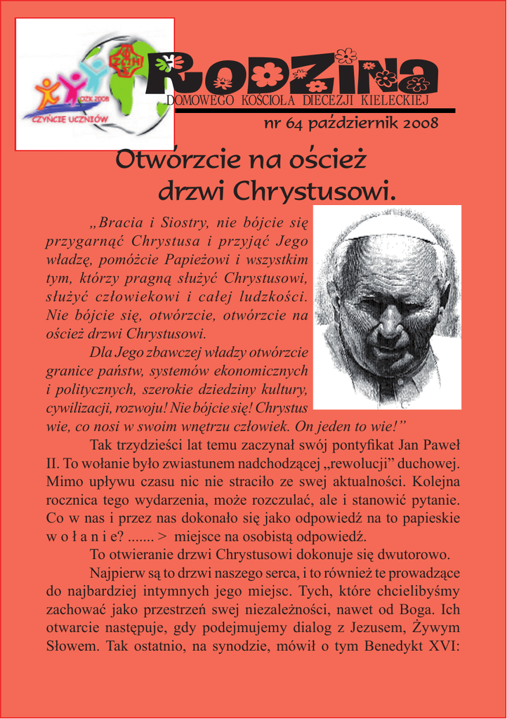 RODZINA DOMOWEGO KOŒCIO£A DIECEZJI KIELECKIEJ nr 64 paŸdziernik 2008 „ Otwórzcie na oœcie¿ drzwi Chrystusowi.” „Bracia i Siostry, nie bójcie się przygarnąć Chrystusa i przyjąć Jego władzę, pomóżcie Papieżowi i wszystkim tym, którzy pragną służyć Chrystusowi, służyć człowiekowi i całej ludzkości. Nie bójcie się, otwórzcie, otwórzcie na oścież drzwi Chrystusowi. Dla Jego zbawczej władzy otwórzcie granice państw, systemów ekonomicznych i politycznych, szerokie dziedziny kultury, cywilizacji, rozwoju! Nie bójcie się! Chrystus wie, co nosi w swoim wnętrzu człowiek. On jeden to wie!” Tak trzydzieści lat temu zaczynał swój pontyfikat Jan Paweł II. To wołanie było zwiastunem nadchodzącej „rewolucji” duchowej. Mimo upływu czasu nic nie straciło ze swej aktualności. Kolejna rocznica tego wydarzenia, może rozczulać, ale i stanowić pytanie. Co w nas i przez nas dokonało się jako odpowiedź na to papieskie w o ł a n i e? ....... > miejsce na osobistą odpowiedź. To otwieranie drzwi Chrystusowi dokonuje się dwutorowo. Najpierw są to drzwi naszego serca, i to również te prowadzące do najbardziej intymnych jego miejsc. Tych, które chcielibyśmy zachować jako przestrzeń swej niezależności, nawet od Boga. Ich otwarcie następuje, gdy podejmujemy dialog z Jezusem, Żywym Słowem. Tak ostatnio, na synodzie, mówił o tym Benedykt XVI: „Zatrzymujemy się przy słowach ludzkich, słowach przeszłości, historii przeszłości, a nie odkrywamy teraźniejszości obecnej w przeszłości, Ducha Świętego, który mówi do nas dzisiaj słowami z przeszłości. W ten sposób nie wchodzimy w wewnętrzną dynamikę Słowa, które w słowach ludzkich zawiera słowa Boże. Stąd potrzeba zawsze owego „szukania Jego postanowień”. Musimy szukać Słowa w słowach”. Lęk przed takim spotkaniem ustępuje, jeśli odkryjemy w Jezusie miłującego nas Zbawiciela. To osobiste otwarcie drzwi Chrystusowi prowadzi do służby, by otworzyć Mu jak najwięcej drzwi serc innych ludzi. A drogą do tego jest to, co dzieje się w każdym z nas osobiście. „Kościół o tyle razem z Tobą będzie Kościołem-Matką, o ile w poszczególnych swoich członkach będzie wraz z Tobą Oblubienicą oddaną Panu w wierze i miłości.” /Ks. F. Blachnicki/ Niemożliwym jest przekazywanie życia, rodzenie Go w drugim, gdy samemu jest się martwym. Z drugiej jednak strony, egoizmem jest zatrzymywanie dobra, życia, tylko dla siebie. Drugi człowiek może budzić w nas lęk lub niechęć. Zaczynamy się zastanawiać, czy komuś takiemu warto mówić o Jezusie. W konsekwencji ta selekcja prowadzi do zaniechania ewangelizacji, ale i osobistego wzrostu duchowego. I tak upada „rewolucja”. Ryszard Kapuściński w „Szachinszachu” tak pisał: „Wszystkie książki o rewolucjach powinny się zaczynać od rozdziału z dziedziny psychologii - o tym, jak, udręczony, zalękniony człowiek nagle przełamuje strach, przestaje się bać. Powinien być opisany cały ten niezwykły proces, który dokonuje się w jednej chwili, jak wstrząs, jak oczyszczenie Człowiek pozbywa się strachu, czuje się wolny. Bez tego nie byłoby rewolucji.” Rozpoczęty rok formacyjny powinien najpierw służyć pokonaniu tego strachu przed wieloaspektowo rozumianą ewangelizacją. Pokonaniu miłością, której udziela nam Bóg. Tak, by nasze środowiska, Europę przeniknęła ta duchowa „rewolucja”. Nie bójcie się, otwórzcie, otwórzcie na oścież drzwi Chrystusowi. ks. Sławomir Sarek moderator diecezjalny INAUGURACJA ROKU 2008/2009 „CZYÑCIE UCZNIÓW” Jak co roku po wakacjach kościół pw. Niepokalanego Serca NMP gościł uczestników Domowego Kościoła. Tym razem jednak byliśmy grupą, która wyjątkowo licznie uczestniczyła w letnich rekolekcjach - bądź to dwutygodniowych, bądź pięciodniowych. Tak umocnieni rozpoczynamy nowy rok pracy pod hasłem „Czyńcie uczniów”. Wagę tego zadania podkreślił w swoim kazaniu Ksiądz Moderator Sławomir Sarek. Jesteśmy wybrani i wezwani do przekazywania dalej dobrej nowiny. Naszym powołaniem jest nie tylko uczestniczyć w rekolekcjach i zachować te przeżycia dla siebie. Jezus pragnie, abyśmy czynili kolejnych uczniów, aby nasza wspólnota była ożywiona żarem ducha apostolskiego. Po Eucharystii nowi animatorzy kręgów przyjęli świece oazowe. Uczestnicy rekolekcji II stopnia w Szczawnicy, państwo Twardowscy, wygłosili świadectwo. Szczególnym potwierdzeniem Bożego błogosławieństwa był dla nich znak dobrej pogody udzielony grupie na czas modlitewnego wyjścia. Pozostałe świadectwa poznamy na najbliższym spotkaniu wtorkowym. W ten nowy rok pracy wielu z nas wchodzi z większym poczuciem odpowiedzialności za wspólnotę i z nowymi nadziejami. Widać je na przykład w poszerzonej i odnowionej diakonii muzycznej. Grą na skrzypcach będzie służył Andrzej Lenarcik. Zapytany, jak pogodzi swoje liczne stare i nowe obowiązki odpowiedział, że pragnie ofiarować Panu Bogu „dziesięcinę swojego czasu”. relacja: Zuzanna Warchałowska zdj. L. Trzciński Uczeñ Chrystusa - dojrza³y chrzeœcijanin „Czyńcie uczniów” to hasło obecnego roku formacyjnego w DK. Wezwanie to jest skierowane najpierw do uczniów Chrystusa ,a dopiero potem do tych, którzy dzięki nim staną się uczniami. Dlatego zapytajmy siebie - czy ja rzeczywiście jestem uczniem mojego Pana i Mistrza? Jest to wezwanie do nawrócenia mojej osoby, a dopiero potem innych, do których pośle mnie Pan. „Czyńcie uczniów” to apel o moje nawrócenie, przemianę mojego życia, wezwanie by „dołączyć do orszaku Nauczyciela Mistrza, chodzić z nim i naśladować jego tryb życia”. Być uczniem to znaczy być dojrzałym chrześcijaninem. Dojrzały chrześcijanin to nie ten, kto jest ochrzczony i ma lat 18 („chrześcijanin z metryki”), to jeszcze nie ten, kto określa siebie mianem „jestem wierzący i praktykujący” - c
