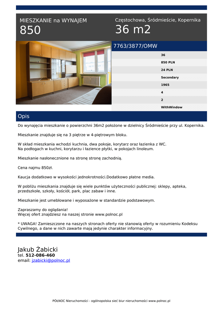 MIESZKANIE na WYNAJEM 850 Częstochowa, Śródmieście, Kopernika 36 m2 7763/3877/OMW 36 850 PLN 24 PLN Secondary 1965 4 2 WithWindow Opis Do wynajęcia mieszkanie o powierzchni 36m2 położone w dzielnicy Śródmieście przy ul. Kopernika. Mieszkanie znajduje się na 3 piętrze w 4-piętrowym bloku. W skład mieszkania wchodzi kuchnia, dwa pokoje, korytarz oraz łazienka z WC. Na podłogach w kuchni, korytarzu i łazience płytki, w pokojach linoleum. Mieszkanie nasłonecznione na stronę stronę zachodnią. Cena najmu 850zł. Kaucja dodatkowo w wysokości jednokrotności.Dodatkowo płatne media. W pobliżu mieszkania znajduje się wiele punktów użyteczności publicznej: sklepy, apteka, przedszkole, szkoły, kościół, park, plac zabaw i inne. Mieszkanie jest umeblowane i wyposażone w standardzie podstawowym. Zapraszamy do oglądania! Więcej ofert znajdziesz na naszej stronie www.polnoc.pl * UWAGA! Zamieszczone na naszych stronach oferty nie stanowią oferty w rozumieniu Kodeksu Cywilnego, a dane w nich zawarte mają jedynie charakter informacyjny. Jakub Żabicki tel. 512-086-460 email: [email protected] PÓŁNOC Nieruchomości - ogólnopolska sieć biur nieruchomości www.polnoc.pl Powered by TCPDF (www.tcpdf.org)