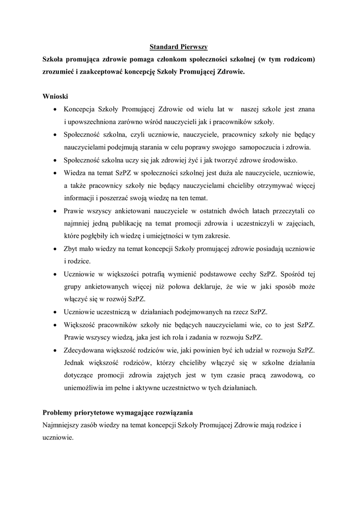Standard Pierwszy Szkoła promująca zdrowie pomaga członkom społeczności szkolnej (w tym rodzicom) zrozumieć i zaakceptować koncepcję Szkoły Promującej Zdrowie. Wnioski · Koncepcja Szkoły Promującej Zdrowie od wielu lat w naszej szkole jest znana i upowszechniona zarówno wśród nauczycieli jak i pracowników szkoły. · Społeczność szkolna, czyli uczniowie, nauczyciele, pracownicy szkoły nie będący nauczycielami podejmują starania w celu poprawy swojego samopoczucia i zdrowia. · Społeczność szkolna uczy się jak zdrowiej żyć i jak tworzyć zdrowe środowisko. · Wiedza na temat SzPZ w społeczności szkolnej jest duża ale nauczyciele, uczniowie, a także pracownicy szkoły nie będący nauczycielami chcieliby otrzymywać więcej informacji i poszerzać swoją wiedzę na ten temat. · Prawie wszyscy ankietowani nauczyciele w ostatnich dwóch latach przeczytali co najmniej jedną publikację na temat promocji zdrowia i uczestniczyli w zajęciach, które pogłębiły ich wiedzę i umiejętności w tym zakresie. · Zbyt mało wiedzy na temat koncepcji Szkoły promującej zdrowie posiadają uczniowie i rodzice. · Uczniowie w większości potrafią wymienić podstawowe cechy SzPZ. Spośród tej grupy ankietowanych więcej niż połowa deklaruje, że wie w jaki sposób może włączyć się w rozwój SzPZ. · Uczniowie uczestniczą w działaniach podejmowanych na rzecz SzPZ. · Większość pracowników szkoły nie będących nauczycielami wie, co to jest SzPZ. Prawie wszyscy wiedzą, jaka jest ich rola i zadania w rozwoju SzPZ. · Zdecydowana większość rodziców wie, jaki powinien być ich udział w rozwoju SzPZ. Jednak większość rodziców, którzy chcieliby włączyć się w szkolne działania dotyczące promocji zdrowia zajętych jest w tym czasie pracą zawodową, co uniemożliwia im pełne i aktywne uczestnictwo w tych działaniach. Problemy priorytetowe wymagające rozwiązania Najmniejszy zasób wiedzy na temat koncepcji Szkoły Promującej Zdrowie mają rodzice i uczniowie. Standard Drugi Szkoła Promująca Zdrowie zarządza projektami promocji zdrowia w sposób sprzyjający: · Uczestnictwu, partnerstwu i współdziałaniu społeczności szkolnej, w tym rodzicom i społeczności lokalnej. · Skuteczności i długofalowości działań. Wnioski: · Koordynator do spraw promocji zdrowia zna swoje zadania i realizuje je we współpracy z całym zespołem. Nawiązuje i prowadzi współpracę z innymi instytucjami, aktywnie włącza się w działania prozdrowotne, nadzoruje ich przebieg oraz prowadzi działalność na rzecz promocji zdrowia we współpracy ze środowiskiem lokalnym. · Działalność koordynatora koreluje z polityką prozdrowotną prowadzoną przez naszą szkołę. · Członkami Szkolnego Zespołu Promocji Zdrowia są przedstawiciele różnych grup społeczności szkolnej. Chętnie działają oni na rzecz promocji zdrowia. · Szkoła współpracuje z różnymi organizacjami i instytucjami w społeczności lokalnej, które wspierają ją w działaniach na rzecz promocji zdrowia. · W naszej szkole wykorzystuje się szeroki wachlarz narzędzi badawczych. Z uwagi na wielkość placówki głównymi narzędziami wykorzystywanym w diagnozie jest obserwacja i rozmowa. · Plan działań (w tym projektów) w zakresie promocji zdrowia na bieżący rok szkolny, zbudowany jest zgodnie z zasadami przyjętymi w SzPZ. · Najmniejszy udział w realizacji planu w zakresie promocji zdrowia mieli rodzice prawdopodobnie z powodu niedostosowania godzin i miejsca imprez prozdrowotnych do ich czasu wolnego. · Wszystkie realizowane zadania w zakresie promocji zdrowia wynikające z planu działań są systematycznie monitorowane przez koordynatora oraz dyrektora szkoły · Pracownicy szkoły są usatysfakcjonowani z uczestnictwa w realizacji działań w zakresie promocji zdrowia Problemy priorytetowe wymagające rozwiązania · Nie wystarczająco były diagnozowanie potrzeb społeczności szkolnej w zakresie promocji zdrowia. Standard III Szkoła promująca zdrowie prowadzi edukację zdrowotną uczniów i pracowników oraz dąży do zwiększenia jej jakości i skuteczności Wnioski: · W szkole stworzone są sprzyjające warunki do realizacji edukacji zdrowotnej · Uczniowie uczestniczą w opracowywaniu tematyki edukacji prozdrowotnej · Nie wszyscy uczniowie są aktywnymi uczestnikami zajęć, ze względu na niską samoocenę i problemy środowiskowe · Szkoła współpracuje ze środowiskiem lokalnym, chętnie zaprasza specjalistów do realizacji edukacji zdrowotnej · Oferta edukacyjna szkoły w zakresie promocji zdrowia nie jest w pełni wykorzystana przez rodziców · Wnioski z ewaluacji są wykorzystywane do planowania edukacji zdrowotnej · Niska frekwencja rodziców w zajęciach prozdrowotnych związana jest z pracą zawodową (praca zmianowa) oraz z dojazdem do szkoły · Nauczyciele uczestniczą w szkoleniach z zakresu edukacji zdrowotnej · W szkole organizowane są imprezy środowiskowe, takie jak: festyny rodzinne, Wigilie szkolne, Festiwal Piosenki Dziecięcej „Jesienne muzykowanie”, imprezy integracyjne rodziców i nauczycieli Problemy priorytetowe: · Nie wszyscy rodzice są zaangażowani w życie szkoły · Nie wszyscy uczniowie są aktywnymi uczestnikami procesu realizacji edukacji zdrowotnej · Szkoła współpracuje ze środowiskiem, ale nie w pełni wykorzystuje jego zasoby Standard IV Szkoła promująca zdrowie tworzy klimat społeczny Wnioski Uczniowie: · są zadowoleni z nauki w tej szkole, chętnie do niej chodzą i lubią w niej przebywać · uważają, że nauczyciele udzielają im wsparcia i motywują ich do pracy · twierdzą, że są sprawiedliwie traktowani, mogą liczyć na życzliwość ze strony nauczycieli · zostali zapoznani z prawami ucznia i są one przestrzegane · zwracają uwagę na to, że ich koledzy czasami przejawiają zachowania agresywne. Nauczyciele: · odczuwają radość i satysfakcję z pracy w szkole · twi