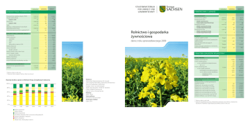 Jednostka SAKSONIA NIEMCY Powierzchnia użytków rolnych ( PUR ) Trwałe użytki zielone Udział w PUR Grunt orny Udział w PUR Ugór Obszary o niekorzystnych warunkach gospodarowania (2005) Udział dzierżawionej PUR w ogólnej PUR 3) 1.000 ha 1.000 ha % 1.000 ha % 1.000 ha 915 188 16.890 4.741 21 28 721 11.945 79 71 4 246 1.000 ha % 353 86 9.426 62 1.000 ha 423 191 139 10 44 14 22 7 14 137 134 1 8 114 67 6.908 3.226 1.878 163 749 464 654 264 384 1.507 1.471 24 83 2.347 1.647 1.000 ha Liczba 32 405 861 14.500 Rolnictwo i gospodarka żywnościowa dane z roku sprawozdawczego 2009 1.000 ha 1.000 ha 1.842 1.020 % 1.000 ha 55 53 499 10.735 % 1.000 ha 27 30 36 848 % 2 2 Tysiące 4.193 82.002 Liczba 228 230 Tysiące 1.939 40.265 Tysiące 42 866 6.896 634 198 289 6.262 384 5.878 1.862 374.500 4.700 1.100 2.800 369.242 19.100 350.100 157.500 4.016 192.600 140 2.523 1.130 1.013 634 989 224 243 25.500 113.100 67.800 82.800 53.400 28.400 1.900 1.500 80 % 60 % 40 % 20 % Udział w powierzchni kraju związkowego/federalnego Powierzchnia wód Udział w powierzchni kraju związkowego/federalnego FORMA PRAWNA Liczba KATEGORIE WIELKOSCI ZAKŁADÓW ROLNICZYCH Zakłady poniżej 2 ha PUR (powierzchni użytków rolnych) Zakłady od 2 do poniżej 10 ha PUR Zakłady od 10 do poniżej 20 ha PUR Zakłady od 20 do poniżej 50 ha PUR Zakłady od 50 do poniżej 100 ha PUR Zakłady od 100 do poniżej 500 ha PUR Zakłady od 500 do poniżej 1 000 ha PUR Zakłady wielkości 1.000 ha PUR i więcej Liczba 1) Niemcy: dane na rok 2008 2)Saksonia: Agrarförderung 2009, (Wspieranie rolnictwa 2009), Niemcy: Statistisches Bundesamt, Federalny Urząd Statystyczny BMELV: Dane na rok 2007 0% 1995 2000 2003 2005 Rośliny pastewne Rośliny oleiste Rośliny strączkowe Likwidacja obszarów (bez surowców odnawialnych) Uprawy specjalne i warzywa Rośliny okopowe Zboże wraz z kukurydzą na ziarno 2007 2009 35.711 18.765 LUDNOŚĆ Ludność ogółem (2008) Liczba mieszkańców na 1km² powierzchni ogólnej (2008) Łączna liczba osób pracujących zawodowo Osoby pracujące zawodowo w rolnictwie, leśnictwie i rybołówstwie Zakłady rolnicze łącznie w tym: osoby prawne w tym: spółdzielnie zarejestrowane Sp. z o. o. w tym: osoby fizyczne w tym: spółki osobowe przedsiębiorstwa jednoosobowe w tym: główna praca zarobkowa dodatkowa praca zarobkowa Wydawca: Sächsisches Staatsministerium für Umwelt und Landwirtschaft (SMUL) (Saksońskie Ministerstwo Stanu ds. Środowiska, i Rolnictwa) Postfach 10 05 10, 01076 Dresden Telefon dla obywateli: +49 (0) 351 564 6814 E-Mail: [email protected] Internet: www. smul.sachsen.de Redakcja: SMUL, LfULG Szata graficzna: Heimrich & Hannot GmbH Zamknięcie redakcji: Lipiec 2010 100 % 1993 NIEMCY STRUKTURA ZAKŁADÓW ROLNICZYCH 2) 3) Niemcy: Dane na rok 2007 4) Saksonia: Dane wstępne, Niemcy: Dane na rok 2007 Rozwój struktur upraw w Wolnym Kraju Związkowym Saksonia Udział w powierzchni krajuzwiązkowego/federalnego Powierzchnia leśna EKOLOGICZNA UPRAWA ROLI 4) Powierzchnia zagospodarowana Zakłady SAKSONIA POWIERZCHNIA 1) Powierzchnia ogółem Powierzchnia rolna WYKORZYSTANIE GRUNTÓW ORNYCH Zboże łącznie w tym: pszenica jęczmień owies żyto kukurydza na ziarno, CCM Rośliny okopowe w tym: ziemniaki buraki cukrowe Rośliny oleiste, wraz z Non Food w tym: rzepak i rzepik nasiona słonecznika Rośliny strączkowe Rośliny pastewne w tym: kukurydza na zielonkę i na silos Jednostka POWIERZCHNIA I LUDNOŚĆ WYKORZYSTANIE POWIERZCHNI Jednostka SAKSONIA NIEMCY UPRAWA ROLI Zboże łącznie (wraz z kukurydzą na ziarno, CCM) w tym: pszenica jęczmień owies żyto kukurydza na ziarno, CCM Rzepak i rzepik (wraz z Non Food) Ziemniaki w tym: ziemniaki wczesne Buraki cukrowe 5) Kukurydza na silos Jednostka SAKSONIA Jednostka NIEMCY POGŁOWIE ZWIERZĄT UŻYTKOWYCH WYDAJNOŚĆ I ILOŚĆ ZBIORóW dt/ha 1.000 t dt/ha 1.000 t dt/ha 1.000 t dt/ha 1.000 t dt/ha 1.000 t dt/ha 1.000 t dt/ha 1.000 t dt/ha 1.000 t dt/ha 1.000 t dt/ha 1.000 t dt/ha 1.000 t 66,4 2.805 71,7 1.367 64,1 892 50,4 52 52,5 231 92,3 130 41,6 557 431,0 306 363,2 7 689,9 975 428,0 2.889 72,1 49.748 78,1 25.190 65,4 12.288 50,8 826 57,0 4.270 98,6 4.527 42,9 6.307 443,0 11.683 348,7 496 622,9 23.003 445,0 73.553 Bydło łącznie w tym: krowy mleczne Świnie łącznie w tym: tuczniki Świnie hodowlane Owce Kury łącznie (2007) Konie (2007) 1.000 sztuk 507 187 675 222 72 116 9.175 15 12.897 4.169 26.841 11.353 2.236 2.350 114.625 542 1.000 t kg/rok 1.596 8.446 28.656 6.827 Zakładowa produkcja jaj Nieśność na jedną kurę mln sztuk sztuk/rok 898 309 8.523 293 Żywność i pasza w tym: Ubój i przerób mięsa Produkcja pieczywa Przetwarzanie owoców i warzyw Przetwarzanie mleka: lody jadalne Młyny do mielenia i łuskania Produkcja pasz Produkcja napojów UBOJE PRZEMYSŁOWE 7) ZWIERZĘTA RZEŹNE UPRAWA WARZYW (Uprawa na sprzedaż) Powierzchnia upraw polowych Zbiory z pól Powierzchnia upraw pod szłem Plony pod szkłem 1.000 ha 1.000 t 1.000 ha 1.000 t 5 65 0,05 7 111 3.443 1,5 167 SADOWNICTWO (Sadownictwo towarowe) Powierzchnia upraw Plony 1.000 sztuk kg kg 1.000 sztuk kg 40 357 275 572 95 3.463 372 301 56.423 94 66 11 8) – 54 6.510 1.167 42 5.277 1.000 ha 1.000 t 5 122 60 1.428 1.000 ha hl/ha 1.000 hl 0,4 23 10 100 91 9.139 Zwierzęta rzeźne łącznie tym: bydło cielaki świnie mln euro Żywność i pasza Produkcja napojów 88 143 20 14 4 11 26 1.327 2.421 240 230 94 198 599 5.083 128.002 797 492 439 2.570 51 104 892 34.284 13.480 8.904 21.511 5.130 7.030 19.680 8 k.N. 10) Procent 18 25 Gospodarka żywnościowa łącznie w tym: Mleko i produkty mleczne Ser Mięso i wyroby mięsne Pieczywo Owoce łupinowe i suche Preparaty z warzyw i konserwy Kakao i wyroby kakaowe Oleje roślinne i tłuszcze Piwo Buraki curkowe i produkty cukrownicze Ziemniaki i wyroby z ziemniaków Pszenica Jęczmień 805 47.287 128 153 89 54 36 30 17 16 10 8 4 21 4 3.276 2.587 7.290 3.747 534 535 2.593 1.294 830 1.314 713 1.582 151 1.000 t 396 355 159 5.288 2.950 2.2