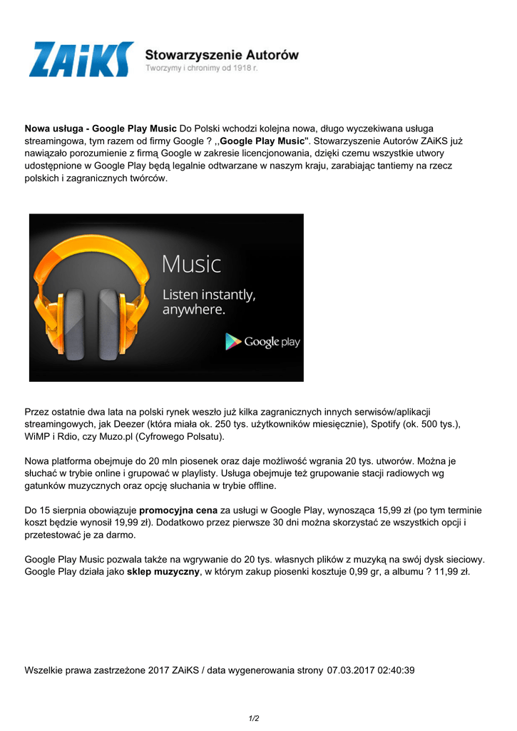 Nowa usługa - Google Play Music Do Polski wchodzi kolejna nowa, długo wyczekiwana usługa streamingowa, tym razem od firmy Google ? ,,Google Play Music''. Stowarzyszenie Autorów ZAiKS już nawiązało porozumienie z firmą Google w zakresie licencjonowania, dzięki czemu wszystkie utwory udostępnione w Google Play będą legalnie odtwarzane w naszym kraju, zarabiając tantiemy na rzecz polskich i zagranicznych twórców. Przez ostatnie dwa lata na polski rynek weszło już kilka zagranicznych innych serwisów/aplikacji streamingowych, jak Deezer (która miała ok. 250 tys. użytkowników miesięcznie), Spotify (ok. 500 tys.), WiMP i Rdio, czy Muzo.pl (Cyfrowego Polsatu). Nowa platforma obejmuje do 20 mln piosenek oraz daje możliwość wgrania 20 tys. utworów. Można je słuchać w trybie online i grupować w playlisty. Usługa obejmuje też grupowanie stacji radiowych wg gatunków muzycznych oraz opcję słuchania w trybie offline. Do 15 sierpnia obowiązuje promocyjna cena za usługi w Google Play, wynosząca 15,99 zł (po tym terminie koszt będzie wynosił 19,99 zł). Dodatkowo przez pierwsze 30 dni można skorzystać ze wszystkich opcji i przetestować je za darmo. Google Play Music pozwala także na wgrywanie do 20 tys. własnych plików z muzyką na swój dysk sieciowy. Google Play działa jako sklep muzyczny, w którym zakup piosenki kosztuje 0,99 gr, a albumu ? 11,99 zł. Wszelkie prawa zastrzeżone 2017 ZAiKS / data wygenerowania strony 07.03.2017 02:40:39 1/2 PDF ze strony: http://zaiks.org.pl/796,196,nowa_usluga_-_google_play_music 2/2