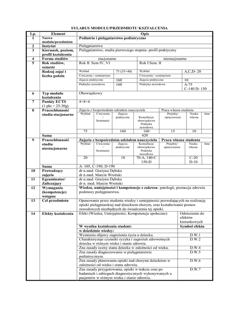 SYLABUS MODUŁU/PRZEDMIOTU KSZTAŁCENIA Lp. 1 2 3 4 5 6 7 8 Element Nazwa modułu/przedmiotu Instytut Kierunek, poziom, profil kształcenia Forma studiów Rok studiów, semestr Rodzaj zajęć i liczba godzin Typ modułu kształcenia Punkty ECTS (1 pkt = 25-30g) Pracochłonność studia stacjonarne Opis Pediatria i pielęgniarstwo pediatryczne Pielęgniarstwa Pielęgniarstwo, studia pierwszego stopnia- profil praktyczny stacjonarne Rok II Sem IV, VI Rok I Sem. II Wykład 75 (35+40) Wykład 160 160 Ćwiczenia / seminarium Zajęcia praktyczne Praktyka zawodowa Ćwiczenia / seminarium Zajęcia praktyczne Praktyka zawodowa 9 13 Suma Prowadzący zajęcia Egzaminator/ Zaliczający Wymagania (kompetencje) wstępne Cel przedmiotu 14 Efekty kształcenia 11 12 10 A-75 C-140 D- 150 4+8+4 Zajęcia z bezpośrednim udziałem nauczyciela Wykład Ćwiczenia / Seminaria/ Zajęcia praktyczne Konsultacje obowiązkowe Praktyka zawodowa 160 420 Zajęcia z bezpośrednim udziałem nauczyciela Wykład 20 10 A,C,D- 20 Obowiązkowy 75 Suma Pracochłonność studia niestacjonarne niestacjonarne 160 Ćwiczenia / Seminaria/ Zajęcia praktyczne Konsultacje obowiązkowe Praktyka zawodowa 10 70-A, 140-C 150-D Praca własna studenta Projekty/ opracowania Nauka własna 15 10 Inne Praca własna studenta Projekty/ opracowania Nauka własna Inne C-20 D-10 A- 105, C-190; D-190 dr n.med. Grażyna Dębska dr n.med. Marcin Wroński dr n.med. Grażyna Dębska dr n. med. Marcin Wroński Wiedza, umiejętności i kompetencje z zakresu: patologii, promocja zdrowia podstawy pielęgniarstwa. Opanowanie przez studenta wiedzy i umiejętności pozwalających na realizację opieki pielęgniarskiej nad dzieckiem chorym, oraz kształtowanie postaw zawodowych niezbędnych do świadczenia tej opieki. Efekt (Wiedza, Umiejętności, Kompetencje społeczne) Odniesienie do efektów kierunkowych W wyniku kształcenia student: Symbol efektu w dziedzinie wiedzy: Wymienia objawy zagrożenia życia u dziecka. D.W.1 Charakteryzuje czynniki ryzyka i zagrożeń zdrowotnych D.W.2 dziecka w różnym wieku i stanie zdrowia. Zna zasady oceny stanu dziecka w zależności od wieku. D.W.4 Zna zasady diagnozowania w pielęgniarstwie D.W.5 pediatrycznym. Zna zasady planowania opieki nad chorymi dzieckiem w D.W.6 zależności od wieku i stanu zdrowia. Zna zasady przygotowania, opieki w trakcie oraz po D.W.7 badaniach i zabiegach diagnostycznych wykonywanych u pacjentów w różnym wieku i stanie zdrowia. Charakteryzuje grupy leków i ich działanie na układ i narządy chorego w różnych schorzeniach, w zależności od wieku i stanu zdrowia, z uwzględnieniem działań niepożądanych, interakcji z innymi lekami i dróg podania. Charakteryzuje techniki i procedury pielęgniarskie stosowane w opiece nad chorym w zależności od jego wieku i stanu zdrowia. Zna zasady przygotowania chorego do samoopieki w zależności od jego wieku i stanu zdrowia. Różnicuje reakcje chorego na chorobę i hospitalizację w zależności od jego wieku i stanu zdrowia. Zna rolę pielęgniarki przy przyjęciu chorego do przedsiębiorstwa podmiotu leczniczego w zależności od wieku i stanu zdrowia pacjenta. Zna swoiste zasady organizacji opieki specjalistycznej pediatrycznej. Wyjaśnia patofizjologię i objawy kliniczne chorób wieku rozwojowego: układu oddechowego, układu krążenia, dróg moczowych, układu pokarmowego, chorób alergicznych oraz krwi. Omawia patofizjologię i objawy kliniczne chorób i stanów zagrożenia życia noworodka i wcześniaka. Charakteryzuje podstawy opieki nad wcześniakiem i noworodkiem. w dziedzinie umiejętności: Gromadzi informacje, formułuje diagnozę pielęgniarską, ustala cele i plan opieki, wdraża interwencje pielęgniarskie oraz dokonuje ewaluacji opieki zdrowia. Rozpoznaje uwarunkowania zachowania zdrowia odbiorców opieki w różnym wieku i stanie zdrowia Prowadzi poradnictwo w zakresie samoopieki pacjentów w różnym wieku i stanie zdrowia, dotyczące wad rozwojowych, chorób . Motywuje chorego i jego opiekunów do wejścia do grup wsparcia społecznego. Prowadzi profilaktykę powikłań w przebiegu chorób. Organizuje izolację chorych zakaźnie w miejscach publicznych i w warunkach domowych. Ocenia rozwój psychofizyczny dziecka, wykonuje testy przesiewowe, wykrywa zaburzenia w Rozwoju. Pobiera materiał do badań diagnostycznych. Ocenia stan ogólny pacjenta w kierunku powikłań po specjalistycznych badaniach diagnostycznych i powikłań pooperacyjnych. Doraźnie podaje tlen, modyfikuje dawkę stałą insuliny szybko i krótko działającej. Przygotowuje chorego do badań diagnostycznych pod względem fizycznym i psychicznym. Dokumentuje sytuację zdrowotną pacjenta, jej dynamikę zmian i realizowaną opiekę pielęgniarską. Rozpoznaje stany nagłego zagrożenia zdrowia Rozpoznaje powikłania leczenia farmakologicznego, dietetycznego, rehabilitacyjnego, leczniczopielęgnacyjnego. Prowadzi rozmowę terapeutyczna. Prowadzi, dokumentuje i ocenia bilans płynów pacjenta. Przekazuje informacje o stanie zdrowia chorego członkom zespołu terapeutycznego. D.W.8 D.W.9 D.W.10 D.W.11 D.W.12 D.W.14 D.W.18 D.W.19 D.W.20 D.U.1 D.U.2 D.U.3 D.U.4 D.U.5 D.U.6 D.U.7 D.U.9 D.U.10 D.U.11 D.U.12 D.U.13 D.U.16 D.U.20 D.U.22 D.U.25 D.U.26 wiedza umiejętności Forma i warunki potwierdzenia efektu kształcenia Kompetencja a społeczne 15 Asystuje lekarzowi w trakcie badań diagnostycznych D.U.27 i leczniczych. Prowadzi dokumentację opieki nad chorym: kartę D.U.28 obserwacji, zabiegów pielęgnacyjnych i raportów, kartę rejestru zakażeń szpitalnych, profilaktyki i leczenia odleżyn oraz kartę informacyjną z zaleceniami w zakresie samo opieki. Tworzy pacjentowi warunki do godnego umierania. D.U.30 Dostosowuje interwencje pielęgniarskie do rodzaju D.U.32 problemów pielęgnacyjnych. Przygotowuje i podaje leki różnymi drogami, samodzielnie D.U.33 lub na zlecenie lekarza. w dziedzinie kompetencji społecznych: Szanuje godność i autonomię osób p