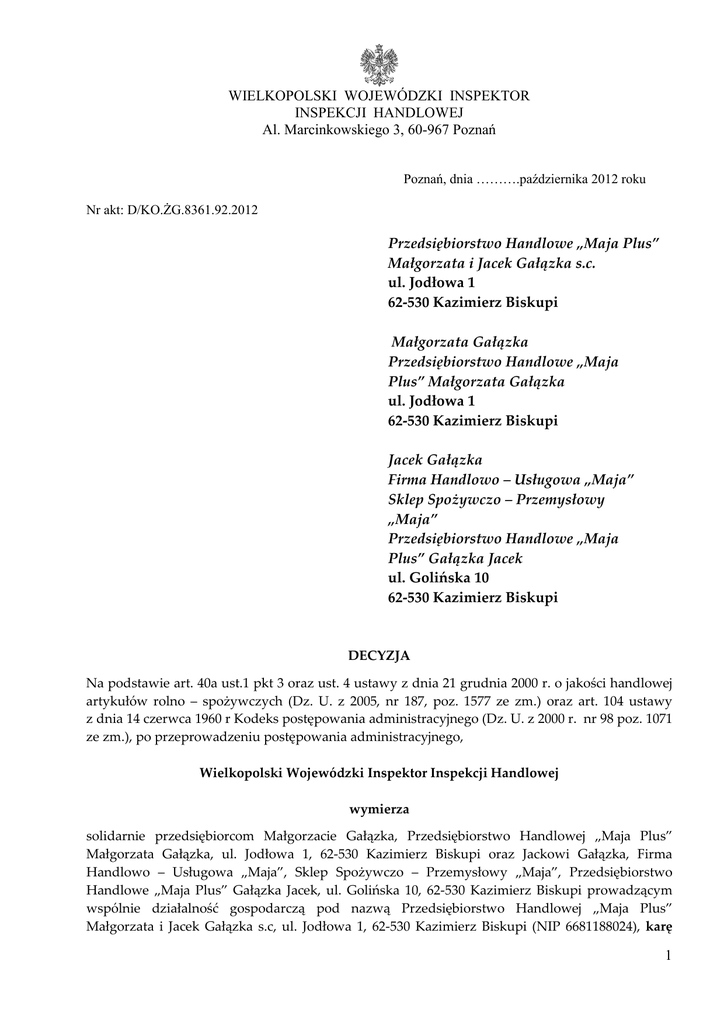 WIELKOPOLSKI WOJEWÓDZKI INSPEKTOR INSPEKCJI HANDLOWEJ Al. Marcinkowskiego 3, 60-967 Poznań Poznań, dnia ……….października 2012 roku Nr akt: D/KO.ŻG.8361.92.2012 Przedsiębiorstwo Handlowe „Maja Plus” Małgorzata i Jacek Gałązka s.c. ul. Jodłowa 1 62-530 Kazimierz Biskupi Małgorzata Gałązka Przedsiębiorstwo Handlowe „Maja Plus” Małgorzata Gałązka ul. Jodłowa 1 62-530 Kazimierz Biskupi Jacek Gałązka Firma Handlowo – Usługowa „Maja” Sklep Spożywczo – Przemysłowy „Maja” Przedsiębiorstwo Handlowe „Maja Plus” Gałązka Jacek ul. Golińska 10 62-530 Kazimierz Biskupi DECYZJA Na podstawie art. 40a ust.1 pkt 3 oraz ust. 4 ustawy z dnia 21 grudnia 2000 r. o jakości handlowej artykułów rolno – spożywczych (Dz. U. z 2005, nr 187, poz. 1577 ze zm.) oraz art. 104 ustawy z dnia 14 czerwca 1960 r Kodeks postępowania administracyjnego (Dz. U. z 2000 r. nr 98 poz. 1071 ze zm.), po przeprowadzeniu postępowania administracyjnego, Wielkopolski Wojewódzki Inspektor Inspekcji Handlowej wymierza solidarnie przedsiębiorcom Małgorzacie Gałązka, Przedsiębiorstwo Handlowej „Maja Plus” Małgorzata Gałązka, ul. Jodłowa 1, 62-530 Kazimierz Biskupi oraz Jackowi Gałązka, Firma Handlowo – Usługowa „Maja”, Sklep Spożywczo – Przemysłowy „Maja”, Przedsiębiorstwo Handlowe „Maja Plus” Gałązka Jacek, ul. Golińska 10, 62-530 Kazimierz Biskupi prowadzącym wspólnie działalność gospodarczą pod nazwą Przedsiębiorstwo Handlowej „Maja Plus” Małgorzata i Jacek Gałązka s.c, ul. Jodłowa 1, 62-530 Kazimierz Biskupi (NIP 6681188024), karę 1 pieniężną w wysokości 700 zł (słownie siedemset złotych) z tytułu wprowadzenia do obrotu, w dniu kontroli 18 czerwca 2012 r., w sklepie spożywczo-przemysłowym Carrefour Expres Kazimierz Biskupi, 62-530 Kazimierz Biskupi, ul. Golińska 1A, 8 partii artykułów rolno – spożywczych sprzedawanych bez opakowań jednostkowych o niewłaściwej jakości handlowej, o łącznej wartości 246,29 zł, tj.: a) chleb – brak oznaczeń, wg. informacji sprzedawcy chleb mieszany zwykły 0,6 kg (wg. dowodu dostawy chleb 0,6kg), w ilości 6 szt., w cenie 2,29 zł, wartości 13,74 zł, dowód dostawy nr 2157/6/2012 z dnia 18.06.2012 od P.P.H.U. Feniks Mariusz Buśkiewicz, Piekarnia Kazimierz Biskupi, ul. Królowej Marysieńki 46, 62-502 Konin, b) bułka – na wywieszce bułka duża, wg. informacji sprzedawcy bułka pszenna 0,1 kg (wg. dowodu dostawy bułka 0,1), w ilości 13 szt., w cenie 0,65 zł, wartości 8,45 zł, dowód dostawy nr 2157/6/2012 z dnia 18.06.2012 od P.P.H.U. Feniks Mariusz Buśkiewicz, Piekarnia Kazimierz Biskupi, ul. Królowej Marysieńki 46, 62-502 Konin, c) chleb Omlet – na wywieszce chleb Żydowski Omlet, wg. informacji sprzedawcy chleb mieszany Omlet 0,4 kg (wg. dowodu chleb Omlet), w ilości 2 szt., w cenie 1,79 zł, wartości 3,58 zł, dowód dostawy nr 2157/6/2012 z dnia 18.06.2012 od P.P.H.U. Feniks Mariusz Buśkiewicz, Piekarnia Kazimierz Biskupi, ul. Królowej Marysieńki 46, 62-502 Konin, d) chleb Żydowski – na wywieszce chleb Żydowski Omlet, wg. informacji sprzedawcy chleb mieszany Żydowski 0,3kg (wg. dowodu chleb Żydowski), w ilości 2 szt., w cenie 1,79 zł, wartości 3,58 zł, dowód dostawy nr 2157/6/2012 z dnia 18.06.2012 od P.P.H.U. Feniks Mariusz Buśkiewicz, Piekarnia Kazimierz Biskupi, ul. Królowej Marysieńki 46, 62-502 Konin ze względu na brak nazwy pieczywa (rodzaju), danych producenta oraz masy jednostkowej pieczywa, co jest naruszeniem § 31 rozporządzenia Ministra Rolnictwa i Rozwoju Wsi z dnia 10 lipca 2007 roku w sprawie znakowania środków spożywczych (Dz. U. nr 137, poz. 966 ze zm.), e) nototenia tusza w ilości 10 kg, w cenie 10,49 zł/kg, wartości 104,90 zł, dowód dostawy: przyjęcie zewnętrzne nr PZ/0A79/2012/0537 z dnia 16.04.2012 r. od F.H.U. Danjan Wioletta Sobecka, ul. Kiszkowska 2, 62-200 Gniezno (na etykiecie opakowania zbiorczego, będącego w posiadaniu sprzedawcy, podano m.in. informacje: nototenia tusza IQF produkt głęboko mrożony, Nototenia Patagonotothem Ramsayi, glazura 0%, poławiane w morzu, obszar połowu FAO 41, najlepiej spożyć przed końcem 2013/03, warunki przechowywania, importer ARTRYB sp. z o.o., ul. Kazimierska 28A, 84-240 Reda) ze względu na: brak informacji dotyczącej metody produkcji, obszaru połowu, co jest naruszeniem art. 4 ust. 1 pkt. b) i c) rozporządzenia Rady (WE) nr 104/2000 z dnia 17 grudnia 1999 r. w sprawie wspólnej organizacji rynków produktów rybołówstwa a akwakultury (Dz. Urz. L 17 z 21.01.2000, s. 22 ze zm) w zw. z art. 5 rozporządzenia Komisji (WE) nr 2065/2007 z dnia 22 października 2001 r. ustanawiającego szczegółowe zasady stosowania rozporządzenia Rady (WE) nr 104/2000 w zakresie informowania konsumentów o produktach rybołówstwa i akwakultury (Dz. Urz. L 278 z 23.10.2001, s. 6 ze zm) oraz art. 58 ust. 6 rozporządzenia Rady (WE) nr 1224/2009 z dnia 20 listopada 2009 r. ustanawiającego wspólnotowy system kontroli w celu zapewnienia przestrzegania przepisów wspólnej polityki rybołówstwa zmieniającego rozporządzenie (WE) nr 847/96, (WE) nr 2371/2002, (WE) 811/2004, (WE) nr 768/2005, (WE) nr 2115/2005, (WE) nr 2166/2005. (WE)1300/2008, (WE) nr 1342/2008 i uchylającego rozporządzenia (EWG) nr 2847/93, (WE) nr 1627/94, (WE) nr 1966/2006 (Dz. Urz. L 343 z 22.12.2009 r., s. 1) f) smaczek konserwowy Duda w ilości 4,5 kg, w cenie 10,79 zł/kg, wartości 48,56 zł, dowód dostawy: faktura VAT nr 057735/2012 z dnia 11.06.2012 r. od Ultrafood – Indro, 62-300 Września, ul. Sikorskiego 34, Filia w Koninie, 62-510 Konin, ul. Spółdzielców 9B (na osłonce, która nie była widoczna dla konsumenta, podane były m.in. informacje: smaczek konserwowy, produkt blokowy, drobno rozdrobniony, parzony, skład: mięso 2 wieprzowe 45%, woda, żelatyna wieprzowa, sól, skrobia ziemniaczana, białko sojowe, substancja zagęszczająca E407 E425, glukoza, maltodekstryna, s