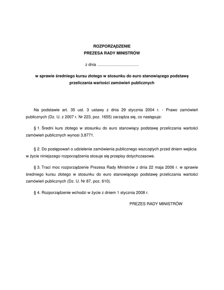 ROZPORZĄDZENIE PREZESA RADY MINISTRÓW z dnia …………………………. w sprawie średniego kursu złotego w stosunku do euro stanowiącego podstawę przeliczania wartości zamówień publicznych Na podstawie art. 35 ust. 3 ustawy z dnia 29 stycznia 2004 r. - Prawo zamówień publicznych (Dz. U. z 2007 r. Nr 223, poz. 1655) zarządza się, co następuje: § 1. Średni kurs złotego w stosunku do euro stanowiący podstawę przeliczania wartości zamówień publicznych wynosi 3,8771. § 2. Do postępowań o udzielenie zamówienia publicznego wszczętych przed dniem wejścia w życie niniejszego rozporządzenia stosuje się przepisy dotychczasowe. § 3. Traci moc rozporządzenie Prezesa Rady Ministrów z dnia 22 maja 2006 r. w sprawie średniego kursu złotego w stosunku do euro stanowiącego podstawę przeliczania wartości zamówień publicznych (Dz. U. Nr 87, poz. 610). § 4. Rozporządzenie wchodzi w życie z dniem 1 stycznia 2008 r. PREZES RADY MINISTRÓW UZASADNIENIE Projekt rozporządzenia stanowi wykonanie upoważnienia z art. 35 ust. 3 ustawy z dnia 29 stycznia 2004 r. – Prawo zamówień publicznych (Dz. U. z 2007 r. Nr 223, poz. 1655). Obecnie średni kurs złotego w stosunku do euro jest określony w rozporządzeniu Prezesa Rady Ministrów z dnia 22 maja 2006 r. w sprawie średniego kursu złotego w stosunku do euro stanowiącego podstawę przeliczania wartości zamówień publicznych (Dz. U. Nr 87, poz. 610). Potrzeba wydania przedmiotowego rozporządzenie wynika z faktu, iż kurs złotego w stosunku do euro powinien być ustalany co najmniej raz na dwa lata z uwzględnieniem ogłoszonych przez Komisję Europejską równowartości progów stosowania procedur udzielania zamówień. Zgodnie z art. 78 ust. 3 dyrektywy 2004/18WE oraz art. 69 ust. 2 dyrektywy 2004/17/WE Komisja Europejska ogłasza w Dzienniku Urzędowym Unii Europejskiej komunikat, w którym określa raz na dwa lata równowartość progów stosowania przepisów dyrektyw w walutach krajowych państw członkowskich, które nie uczestniczą w unii monetarnej. Ostatni komunikat Komisji Europejskiej w tej sprawie został opublikowany w Dzienniku Urzędowym w dniu 13 grudnia 2007 r. (Dz. Urz. UE C 301/01). Kurs złotego wobec euro wynikający z przeliczenia określonej w komunikacie równowartości progów dyrektyw w złotych wynosi 3,8771. W związku z tym proponuje się określenie takiego samego kursu w projekcie rozporządzenia. Oznacza to, że w stosunku do dotychczasowego stanu prawnego, w którym średni kurs złotego w stosunku do euro wynosił 4,3870, kurs ten ulega obniżeniu. Kurs złotego w stosunku do euro będzie stosowany do przeliczania wartości zamówień i konkursów określonych w ustawie – Prawo zamówień publicznych oraz w wydanym na podstawie art. 11 ust. 8 rozporządzeniu Prezesa Rady Ministrów. W związku z tym, że komunikat Komisji Europejskiej powinien być stosowany równocześnie z terminem wejścia w życie (tj. 1 stycznia 2008 r.) rozporządzenia Komisji (WE) nr 1422/2007 z dnia 4 grudnia 2007 r. zmieniającego dyrektywy 2004/17/WE i 2004/18/WE Parlamentu Europejskiego i Rady w odniesieniu do progów obowiązujących w zakresie procedur udzielania zamówień (Dz. Urz. UE L 317 z 5.12.2007, str. 34), termin wejścia w życie rozporządzenia ustala się na dzień 1 stycznia 2008 r. Projekt rozporządzenia w trybie § 11 uchwały nr 49 Rady Ministrów z dnia 19 marca 2002 r. – Regulamin pracy Rady Ministrów (M. P. Nr 13, poz. 221, z późn. zm.) został zaopiniowany pod względem zakresu OSR. Przepisy projektu rozporządzenia są zgodne z prawem europejskim. Projekt rozporządzenia nie zawiera przepisów technicznych, w związku z tym nie podlega procedurze notyfikacyjnej zgodnie z rozporządzeniem Rady Ministrów z dnia 23 grudnia 2002 r. w sprawie sposobu funkcjonowania krajowego systemu notyfikacji norm i aktów prawnych (Dz. U. Nr 239, poz. 2039, z późn. zm.). Zgodnie z przepisami ustawy z dnia 7 lipca 2005 r. o działalności lobbingowej w procesie stanowienia prawa (Dz. U. Nr 169, poz. 1414) projekt rozporządzenia został zamieszczony w Biuletynie Informacji Publicznej Urzędu Zamówień Publicznych. W trybie art. 7 tej ustawy do projektu nie zgłoszono żadnych uwag. OCENA SKUTKÓW REGULACJI do projektu rozporządzenia w sprawie średniego kursu złotego w stosunku do euro stanowiącego podstawę przeliczania wartości zamówień publicznych 1. Podmioty, na które oddziałuje rozporządzenie. Projekt oddziałuje na jednostki sektora finansów publicznych, państwowe jednostki organizacyjne nieposiadające osobowości prawnej, podmioty działające w tzw. sektorze użyteczności publicznej i inne wskazane w art. 3 ustawy – Prawo zamówień publicznych podmioty obowiązane do jej stosowania. W projekcie rozporządzenia zaproponowano, aby średni kurs złotego w stosunku do euro stanowiący podstawę przeliczania wartości zamówień publicznych wynosił 3,8771. Oznacza to, że w stosunku do dotychczasowego stanu prawnego, w którym średni kurs złotego w stosunku do euro wynosi 4,3870, kurs ten ulega obniżeniu. Mając powyższe na uwadze jak i fakt, że kwoty wartości zamówień oraz konkursów, do których ma zastosowanie procedura tzw. podstawowa (odpowiadająca regulacjom zawartym w dyrektywach), ulegają obniżeniu można przewidywać, że ilość przekazywanych ogłoszeń Urzędowi Oficjalnych Publikacji Wspólnot Europejskich może nieznacznie wzrosnąć. 2. Wyniki przeprowadzonych konsultacji. W ramach konsultacji społecznych projekt został zamieszczony w Biuletynie Informacji Publicznej Urzędu Zamówień Publicznych. W toku konsultacji nie zgłoszono żadnych uwag do projektu. 3. Wpływ regulacji na sektor finansów publicznych, w tym budżet państwa i budżety jednostek samorządu terytorialnego. Projektowane rozporządzenie nie będzie miało wpływu na sektor finansów publicznych, w tym budżet państwa i budżety jednostek samorządu terytorialnego