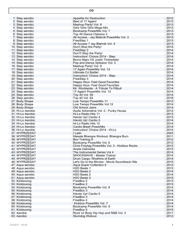 CD 1 2 3 4 5 6 7 8 9 10 11 12 13 14 15 16 17 18 19 20 21 22 23 24 25 26 27 28 29 30 31 32 33 34 35 36 37 38 39 40 41 42 43 44 45 46 47 48 49 50 51 52 53 54 55 56 57 58 59 60 61 62 63 Step aerobic Step aerobic Step aerobic Step aerobic Step aerobic Step aerobic Step aerobic Step aerobic Step aerobic Step aerobic Step aerobic Step aerobic Step aerobic Step aerobic Step aerobic Step aerobic Step aerobic Step aerobic Step aerobic Step aerobic Step aerobic Step aerobic Step aerobic Step aerobic Step aerobic Step aerobic Body Shape Body Shape Body Shape Hi-Lo Aerobic Hi-Lo Aerobic Hi-Lo Aerobic Hi-Lo Aerobic Hi-Lo Aerobic Hi-Lo Aerobic Hi-Lo Aerobic WYPRZEDA? WYPRZEDA? WYPRZEDA? WYPRZEDA? WYPRZEDA? WYPRZEDA? WYPRZEDA? WYPRZEDA? WYPRZEDA? WYPRZEDA? Aqua aerobic Aqua aerobic Aqua aerobic Aqua aerobic Aqua aerobic Kickboxing Kickboxing Kickboxing Kickboxing Kickboxing Kickboxing Kickboxing Kickboxing Kickboxing Kickboxing Aerobic Aerobic 7/3/2017 02:45 Appetite for Destruction Best of 17 Again! Mashup Party! Vol. 8 Girlz Girlz Girlz Mega Mix Bootcamp PowerMix Vol. 7 Top 40 Dance Classics 3 All Access - Jay Blahnik PowerMix Vol. 3 FreeStep 1 All Access ? Jay Blahnik Vol. 4 Don't Stop the Party! FreeStep 2 Don?t Stop the Party! Instructors' Choice 2014 - Step Bruno Mars VS Justin Timberlake Pop and Dance Xplosion Vol. 3 Mashup Party! Vol. 9 17 Again PowerMix Vol. 12 Ultimate DJ Battle! Instructors' Choice 2014 - Step FreeStep 3 Happy Hour- Feel Good Favorites Happy Hour- Feel Good Favorites Mr. Worldwide - A Tribute To Pitbull 17 Again! PowerMix Vol. 13 Top 40 Vol. 59 Top 40 Vol. 64 Low Tempo PowerMix 11 Low Tempo PowerMix Vol 12 Old School Jams Audio Adrenaline Vol. 2 - Funky House Hi-Lo Radio Hits 11 Handz Up! Cardio 4 Handz Up! Cardio 5 Hi-Lo Radio Hits 12 Cardio Blast! PowerMix Instructors' Choice 2014 - Hi-Lo I Latin Masala Bhangra Workout: Bhangra Burn Box Training 9 Bootcamp PowerMix Vol. 6 Chris Freytag PowerMix Vol. 2 - Kickbox Rocks Aneta Ostrówka The Instrumental Series Vol 4 SHOCKWAVE - Master Trainer Drum Cargo: Rhythms of Earth Let's Go to the Movies - Movie Soundtrack Hits Aqua Super Collection 5 H2O Beats 1 H2O Beats 2 H2O Beats 2 H2O Beats 3 FreeBox 2 FreeBox 2 Bootcamp PowerMix Vol. 8 FreeBox 3 Handz Up! Cardio 5 FreeBox 3 FreeBox 4 Kickbox PowerMix Vol. 7 Bootcamp PowerMix Vol. 9 FreeBox 5 Rock Ur Body Hip Hop and R&B Vol. 3 Slumdog Wokout 2012 2013 2013 2013 2013 2013 2013 2013 2013 2014 2014 2014 2014 2014 2014 2014 2014 2014 2014 2014 2014 2014 2014 2014 2014 2016 2013 2014 2014 2012 2013 2013 2014 2014 2014 2014 2003 2011 2012 2012 2012 2013 2014 2014 2014 2015 2013 2013 2014 2014 2015 2013 2013 2014 2014 2014 2014 2014 2014 2014 2015 2011 2012 1 64 65 66 67 68 69 70 71 72 73 74 75 76 77 78 79 80 81 82 83 84 85 86 87 88 89 90 91 92 93 94 95 96 97 98 99 100 101 102 103 104 105 106 107 108 109 110 111 112 113 114 115 116 117 118 119 120 121 122 123 124 125 126 127 128 129 Aerobic Aerobic Aerobic Aerobic Aerobic Aerobic Aerobic Aerobic Aerobic Aerobic Aerobic Aerobic Aerobic Aerobic Aerobic Aerobic Aerobic Aerobic Aerobic Aerobic Aerobic Aerobic Aerobic Cool down/stretch/yoga Cool down/stretch/yoga Cool down/stretch/yoga Cool down/stretch/yoga Cool down/stretch/yoga Cool down/stretch/yoga Cool down/stretch/yoga Cool down/stretch/yoga Cool down/stretch/yoga Cool down/stretch/yoga Cool down/stretch/yoga Cool down/stretch/yoga Cool down/stretch/yoga Cool down/stretch/yoga Cool down/stretch/yoga Cool down/stretch/yoga Cycling Cycling Cycling Cycling Cycling Cycling Cycling Cycling Cycling Cycling Cycling Latin Dance Latin Dance Latin Dance Latin Dance Latin Dance Latin Dance Latin Dance Pilates Pilates Pilates Pilates Pilates Pilates Pilates Pilates Pilates 7/3/2017 02:45 Tribute To Whitney Houston Rihanna VS Katy Perry Club Nigh Best of Brazilian Hits Piloxing - Jump On It! Piloxing - Bodyrock Best of Mash Up Party! Guilty Pleasures Girlz Girlz Girlz Mega Mix Hi-Lo Radio Hits 12 We Love 80?s Hits Instructors' Choice 2014 - Hi-Lo Power Up! - Music To Motivate Pure Hits 80's & 90's Audio Adrenaline Vol. 3 Mashup Party! Vol. 10 Cardio Blast! PowerMix Mashup Party! Vol. 10 Pop Rocks Desperate Hot Wives - The Final Season Desperate Hot Wives - The Final Season BOOM! BANG! POW! Chart Toppers 2010 - 2014 Yoga Groove Nirvana Groove Power Yoga Power Chilled 3 Power Chilled Vol. 4 Music For Active Yoga Vol. 1 Music For Active Yoga Vol. 2 Music For Active Yoga Vol. 10 - Rejoice Buddha Chill Power Down ? Pop Cooldown Angels Voices Buddha Bass Buddha Lounge Lawrence Biscontini ? Om Sweet Om Yoga Moods 2 Power Down Vol. 2 - Pop Cooldown & Stretch Cycle PowerMix 2 Cycle Powermix Vol. 3 Cycle PowerMix 4 Schwinn Indoor Cycling J. Arney Ride PowerMix 3 FreeRide 21 Schwinn Indoor Cycling J. Scott FreeRide 22 FreeRide 22 Doris Thews Schwinn Indoor FreeRide 23 Latin Dance PowerMix Latin Zoom Caliente Latino Vol. 3 Caliente Latino Vol 2 Latin Hits 2012 Caliente Latino Vol. 4 Caliente Latino Vol. 5 Power Pilates Power Chilled Power Chilled vol. 2 Lawrence Biscontini Om Sweet OM L.Biscontini - Om Is Where the Heart Is Mat Pilates 4 Power Down Vol. 2 - Pop Cooldown & Stretch Power Chilled 5 PowerChilled 6 2012 2012 2013 2013 2013 2013 2013 2013 2013 2014 2014 2014 2014 2014 2014 2014 2014 2014 2014 2014 2014 2014 2015 2011 2011 2012 2012 2012 2012 2012 2013 2013 2013 2013 2013 2013 2014 2014 2014 2011 2011 2012 2013 2013 2013 2013 2014 2014 2014 2015 2011 2011 2012 2012 2012 2013 2014 2011 2011 2012 2013 2013 2014 2014 2014 2016 2 130 131 132 133 134 135 136 137 138 139 140 141 142 143 144 145 146 147 148 149 150 151 152 153 154 155 156 157 158 159 160 161 162 163 164 165 166 167 168 169 170 171 172 173 174 175 176 177 178 179 180 181 182 183 184 185 186 187 188 189 190 191 192 193 194 195 Radio Radio Seniors Seniors Seniors Seniors Seniors Seniors Seniors Strona startowa Strona startowa Strona startowa Strona startowa Strona startowa Strona startowa Strona startowa Strona startowa Strona startowa Strona 
