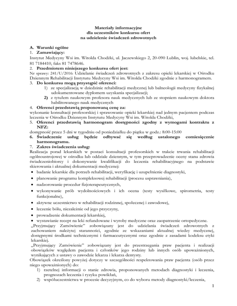 Materiały informacyjne dla uczestników konkursu ofert na udzielenie świadczeń zdrowotnych A. Warunki ogólne 1. Zamawiający: Instytut Medycyny Wsi im. Witolda Chodźki, ul. Jaczewskiego 2, 20-090 Lublin, woj. lubelskie, tel. 81 7184410, faks 81 7478646. 2. Przedmiotem niniejszego konkursu ofert jest: Nr sprawy: 241/U/2016: Udzielanie świadczeń zdrowotnych z zakresu opieki lekarskiej w Ośrodku Dziennym Rehabilitacji Instytutu Medycyny Wsi im. Witolda Chodźki zgodnie z harmonogramem. 3. Do konkursu mogą przystąpić oferenci: 1) ze specjalizacją w dziedzinie rehabilitacji medycznej lub balneologii medycyny fizykalnej udokumentowane dyplomem uzyskania specjalizacji; 2) z tytułem naukowym profesora nauk medycznych lub ze stopniem naukowym doktora habilitowanego nauk medycznych 4. Oferenci przedstawią proponowaną cenę za: wykonanie konsultacji profesorskiej i sprawowanie opieki lekarskiej nad jednym pacjentem podczas leczenia w Ośrodku Dziennym Instytutu Medycyny Wsi im. Witolda Chodźki, 5. Oferenci przedstawią harmonogram dostępności zgodny z wymogami kontraktu z NFZ: dostępność przez 5 dni w tygodniu od poniedziałku do piątku w godz.: 8:00-15:00 6. Świadczenie usług będzie odbywać się według ustalonego comiesięcznie harmonogramu. 7. Zakres świadczenia usług: Realizacja porad lekarskich w postaci konsultacji profesorskich w trakcie trwania rehabilitacji ogólnoustrojowej w ośrodku lub oddziale dziennym, w tym przeprowadzenie oceny stanu zdrowia świadczeniobiorcy i dokonywanie kwalifikacji do leczenia rehabilitacyjnego na podstawie skierowania i aktualnej dokumentacji medycznej: badanie lekarskie dla potrzeb rehabilitacji, weryfikację i uzupełnienie diagnostyki, planowanie programu kompleksowej rehabilitacji (procesu usprawniania), nadzorowanie procedur fizjoterapeutycznych, wykonywanie prób wydolnościowych i ich ocena (testy wysiłkowe, spirometria, testy funkcjonalne), aktywne uczestnictwo w rehabilitacji rodzinnej, społecznej i zawodowej, leczenie bólu, niezależnie od jego przyczyny, prowadzenie dokumentacji lekarskiej, wystawianie recept na leki refundowane i wyroby medyczne oraz zaopatrzenie ortopedyczne. „Przyjmujący Zamówienie” zobowiązany jest do udzielania świadczeń zdrowotnych z zachowaniem należytej staranności, zgodnie ze wskazaniami aktualnej wiedzy medycznej, dostępnymi środkami technicznymi i farmaceutycznymi oraz zgodnie z zasadami kodeksu etyki lekarskiej. „Przyjmujący Zamówienie” zobowiązany jest do przestrzegania praw pacjenta i realizacji obowiązków względem pacjenta i członków jego rodziny lub innych osób upoważnionych, wynikających z ustawy o zawodzie lekarza i lekarza dentysty. Obowiązek określony powyżej dotyczy w szczególności respektowania praw pacjenta (osób przez niego upoważnionych) do: 1) rzetelnej informacji o stanie zdrowia, proponowanych metodach diagnostyki i leczenia, prognozach leczenia i ryzyku powikłań, 2) współuczestnictwa w procesie decyzyjnym, co do wyboru metody diagnostyki/leczenia, 1 3) wyrażania świadomej zgody na proponowaną diagnostykę i zabieg, po uprzednim poinformowaniu przez lekarza wykonującego zabieg o celu zabiegu, technice wykonania i ryzyku powikłań, 4) ochrony danych o stanie zdrowia, tajemnicy lekarskiej. 5) przestrzegania zasad tajemnicy zawodowej i obowiązków określonych w ustawie z dnia 29.08.1997 r. o ochronie danych osobowych. B. Warunki świadczenia usług Zamówienie może być udzielone osobie fizycznej prowadzącej indywidualną praktykę specjalistyczną wyłącznie w przedsiębiorstwie podmiotu leczniczego posiadającej co najmniej specjalizację w dziedzinie rehabilitacji medycznej lub balneologii medycyny fizykalnej udokumentowaną dyplomem uzyskania specjalizacji oraz tytuł naukowy profesora nauk medycznych lub stopień naukowy dr. habilitowanego nauk medycznych Realizacja usług odbywać się będzie na podstawie warunków przedstawionych w umowie, której wzór stanowi integralną część niniejszych materiałów. „Udzielający Zamówienia” oddaje do dyspozycji „Przyjmującego Zamówienie” aparaturę, sprzęt medyczny stanowiący wyposażenie „Udzielającego Zamówienia” i inne środki techniczne oraz pomocnicze niezbędne do realizacji niniejszej umowy. „Przyjmujący Zamówienie” zobowiązany jest do udzielania świadczeń zdrowotnych z zachowaniem należytej staranności, zgodnie ze wskazaniami aktualnej wiedzy medycznej, dostępnymi środkami technicznymi i farmaceutycznymi oraz zgodnie z zasadami kodeksu etyki lekarskiej. C. Czas trwania umowy Umowa zostanie zawarta na okres 12 miesięcy od dnia 01.07.2016 r. do dnia 30.06.2017r. Umowa ulega rozwiązaniu: 1) z upływem czasu, na który była zawarta; 2) z dniem zakończenia udzielania określonych świadczeń zdrowotnych; 3) wskutek oświadczenia jednej ze stron, z zachowaniem 30 dniowego okresu wypowiedzenia; 4) wskutek oświadczenia jednej ze stron, bez zachowania okresu wypowiedzenia, w przypadku gdy druga strona rażąco narusza istotne postanowienia umowy, w szczególności w przypadku: a) utraty uprawnień przez „Przyjmującego Zamówienie” niezbędnych do realizacji umowy. b) rażących naruszeń przez „Przyjmującego Zamówienie” zasad kodeksu etyki lekarskiej i c) ustawy o zawodzie lekarza i lekarza dentysty, d) nie respektowania zasad organizacji udzielania świadczeń określonych przez lekarza kierującego Oddziałem. D. Treść oferty Składana oferta musi zawierać: 1) Dane oferenta: nazwa, siedziba lub imię i nazwisko, adres, numer telefonu do kontaktu, 2) Aktualny wypis z rejestru podmiotów wykonujących działalność leczniczą, potwierdzający uprawnienie do wykonywania świadczeń zdrowotnych objętych przedmiotem konkursu, (wydruk pierwszej strony), 3) Aktualny wypis z CEIDG lub Krajowego Rejestru Sądowego oferenta, 4) Dane dotyczące kwalifikacji zawodowych oferenta: numer prawa wykonywania zawodu, kopia dyplomu poświadczaj