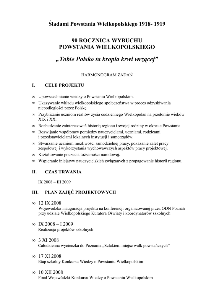 Śladami Powstania Wielkopolskiego 1918- 1919 90 ROCZNICA WYBUCHU POWSTANIA WIELKOPOLSKIEGO „Tobie Polsko ta kropla krwi wrzącej” HARMONOGRAM ZADAŃ I. • • • • • • • • CELE PROJEKTU Upowszechnianie wiedzy o Powstaniu Wielkopolskim. Ukazywanie wkładu wielkopolskiego społeczeństwa w proces odzyskiwania niepodległości przez Polskę. PrzybliŜanie uczniom realiów Ŝycia codziennego Wielkopolan na przełomie wieków XIX i XX. Rozbudzanie zainteresowań historią regionu i swojej rodziny w okresie Powstania. Rozwijanie współpracy pomiędzy nauczycielami, uczniami, rodzicami i przedstawicielami lokalnych instytucji i samorządów. Stwarzanie uczniom moŜliwości samodzielnej pracy, pokazanie zalet pracy zespołowej i wykorzystania wychowawczych aspektów pracy projektowej. Kształtowanie poczucia toŜsamości narodowej. Wspieranie inicjatyw nauczycielskich związanych z propagowanie historii regionu. II. CZAS TRWANIA IX 2008 – III 2009 III. PLAN ZAJĘĆ PROJEKTOWYCH • 12 IX 2008 Wojewódzka inauguracja projektu na konferencji organizowanej przez ODN Poznań przy udziale Wielkopolskiego Kuratora Oświaty i koordynatorów szkolnych • IX 2008 – I 2009 Realizacja projektów szkolnych • 3 XI 2008 Całodzienna wycieczka do Poznania „Szlakiem miejsc walk powstańczych” • 17 XI 2008 Etap szkolny Konkursu Wiedzy o Powstaniu Wielkopolskim • 10 XII 2008 Finał Wojewódzki Konkursu Wiedzy o Powstaniu Wielkopolskim • 16 XII 2008 Całodzienna wycieczka do Muzeów Regionalnych w Wągrowcu i Rogoźnie • 14 III 2009 Wojewódzkie podsumowanie projektu na Targach Edukacyjnych w Poznaniu • 16 III 2009 Zakończenie projektu na terenie ośrodka IV. PRZEBIEG ZAJĘĆ PROJEKTOWYCH • 12 IX 2008 Wojewódzka inauguracja projektu na konferencji organizowanej przez dyrekcję i pracowników Ośrodka Doskonalenia Nauczycieli w Poznaniu przy udziale Wielkopolskiego Kuratora Oświaty Pani ElŜbiety Leszczyńskiej i koordynatorów szkolnych - Podczas konferencji zgromadzeni wysłuchali m.in. wykładów: doktora Jarosława Łuczaka, pt. „Barwa i broń Powstania Wielkopolskiego” doktora Zdzisława Kościańskiego pt. „Biografie powstańców wielkopolskich” doktora Piotra Szaradowskiego pt. „Ikonografia Powstania Wielkopolskiego” • IX 2008 – I 2009 Przykładowe treści i umiejętności realizowane na poszczególnych przedmiotach: • • • • • • • • • Język polski – pisanie w określonej formie (sprawozdanie, opis), wygłaszanie tekstu z pamięci, prezentowanie wypracowanych form (plakaty, albumy…). Historia – przyczyny, przebieg i skutki PW, sławni Polacy w PW, dzieje Wielkopolski na przełomie XIX i XX wieku. Geografia – mapy Wlkp., plany Poznania (z przełomu XIX i XX wieku), zaznaczanie na planie, mapie miejsc waŜnych wydarzeń w PW. Muzyka – pieśń patriotyczna w PW; oprawa muzyczna wieczornicy, sylwetka Ignacego Jana Paderewskiego – pianisty, kompozytora patrioty. Plastyka – wystrój szkoły, plakaty, albumy, logo rocznicy. Informatyka – witryny internetowe z informacjami o PW. Internat – rozbudzanie patriotyzmu, prace z zeszytem ćwiczeń, wypełnianie kart pracy, praca w grupach, wycieczki zajęcia wychowawcze w-f - sprawnościowy bieg niepodległościowy. • 3 XI 2008 Całodzienna wycieczka do Poznania „Szlakiem miejsc walk powstańczych” - - Plan wycieczki: 800 wyjazd z MOW 900 przyjazd do stolicy Wielkopolski i przejście trasy: Bazar (z balkonu tego hotelu wieczorem 27 XII 1918 przemawiał Ignacy Jan Paderewski) – Plac Wolności (na którym powstańcy w styczniu 1919 składali uroczystą przysięgę) – ul. Franciszka Ratajczaka (nazwa upamiętnia pierwszego poległego powstańca) – ul. Św. Marcin (w hotelu Royal mieściło się główne dowództwo wojsk powstańczych) – Al. Niepodległości (przy jej końcu pomnik Powstańców Wielkopolskich) – powrót przez pasaŜ Apollo (w budynku dawnego kina Apollo obradował Sejm Dzielnicowy) – Stary Rynek – ul. Paderewskiego przed pomnik 15 Pułku Ułanów Poznańskich (oddział ten powstał w czasie powstania a następnie zasilił polskie wojsko w wojnie polsko – bolszewickiej) – cytadela (na jej stokach znajdują się m.in. groby powstańców) 1500 powrót do ośrodka Funkcję przewodnika pełnił pan Andrzej Surdyk, natomiast opiekunami były Panie: Irena Kasica, ElŜbieta Berendt i Mirosława WaŜniewicz. • 17 XI 2008 Etap szkolny Konkursu Wiedzy o Powstaniu Wielkopolskim Za pomocą Internetu o godzinie 900 pobraliśmy testy dostarczone przez ODN w Poznaniu i po ich powieleniu uczniowie przystąpili do jego rozwiązywania. WYNIKI EDYCJI SZKOLNEJ KONKURSU WIEDZY O POWSTANIU WIELKOPOLSKIM I miejsce Marlena Kasprowska III b II miejsce Monika Kasprzak III b III miejsce Paweł Nowak II b WyŜej wymienieni wychowankowie zakwalifikowali się do finału wojewódzkiego. Pozostałe miejsca: 4. Paulina Bendyk III b 5. Krzysztof Wantuch III c 6. Olga Szymańska III b 7. Marek Wajs III c 8. Łukasz Akincza III c 9. Sandra Kuczyńska III b 10. Kinga Mazur II b 11. Mateusz Czechowski III a 12. Barbara Kowalska III b 13. Przemysław Woliński II a 14. Marta Bereszyńska II b 15. Milena Matuszak III b Ewelina Michałowska III b 16. Magdalena Sztyblewska II b 17. Patryk Pietrzak I a 18. Robert Dybowski III a Adam Dzierzgwa III c 19. Adrian Perkowski II a 20. Konrad Kiciak II b 21. Marcin Malaika III c 22. Michał Foksiński III a 23. Mariusz Styziński II a Mateusz Wojtaszyk III c 24. Adam Opacki III c 25. Dawid Konopka III c 26. Marcin Waśkowski III c 27. Mateusz Kasierski II a 28. Angelika Musiałowska III b 29. Sylwia Nowak II b 30. Krzysztof Łukasik III a 31. Tomasz Cikacz III c 32. Daniel Herman I a 33. Mateusz Czerwiński III a • 10 XII 2008 Finał Wojewódzki Konkursu Wiedzy o Powstaniu Wielkopolskim Zwycięzcy etapu szkolnego pod opieką Pana Andrzeja Surdyka udali się do Poznania, gdzie w auli Wydziału Politologii UAM odbył się finał. Niestety ni
