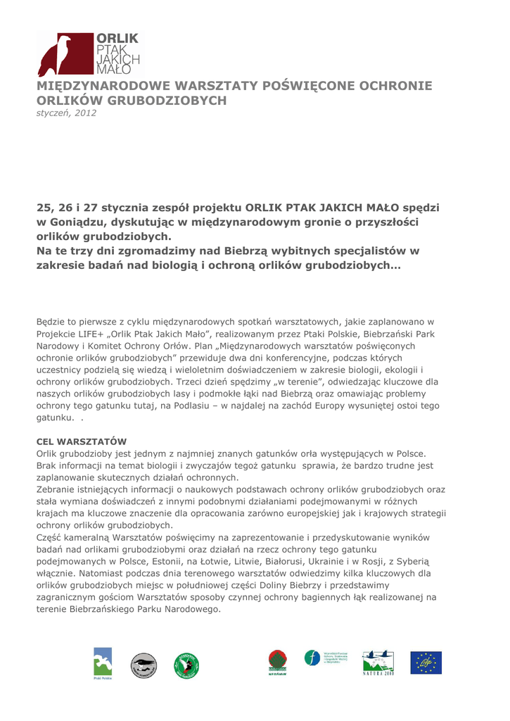 MIĘDZYNARODOWE WARSZTATY POŚWIĘCONE OCHRONIE ORLIKÓW GRUBODZIOBYCH styczeń, 2012 25, 26 i 27 stycznia zespół projektu ORLIK PTAK JAKICH MAŁO spędzi w Goniądzu, dyskutując w międzynarodowym gronie o przyszłości orlików grubodziobych. Na te trzy dni zgromadzimy nad Biebrzą wybitnych specjalistów w zakresie badań nad biologią i ochroną orlików grubodziobych… Będzie to pierwsze z cyklu międzynarodowych spotkań warsztatowych, jakie zaplanowano w Projekcie LIFE+ „Orlik Ptak Jakich Mało”, realizowanym przez Ptaki Polskie, Biebrzański Park Narodowy i Komitet Ochrony Orłów. Plan „Międzynarodowych warsztatów poświęconych ochronie orlików grubodziobych” przewiduje dwa dni konferencyjne, podczas których uczestnicy podzielą się wiedzą i wieloletnim doświadczeniem w zakresie biologii, ekologii i ochrony orlików grubodziobych. Trzeci dzień spędzimy „w terenie”, odwiedzając kluczowe dla naszych orlików grubodziobych lasy i podmokłe łąki nad Biebrzą oraz omawiając problemy ochrony tego gatunku tutaj, na Podlasiu – w najdalej na zachód Europy wysuniętej ostoi tego gatunku. . CEL WARSZTATÓW Orlik grubodzioby jest jednym z najmniej znanych gatunków orła występujących w Polsce. Brak informacji na temat biologii i zwyczajów tegoż gatunku sprawia, że bardzo trudne jest zaplanowanie skutecznych działań ochronnych. Zebranie istniejących informacji o naukowych podstawach ochrony orlików grubodziobych oraz stała wymiana doświadczeń z innymi podobnymi działaniami podejmowanymi w różnych krajach ma kluczowe znaczenie dla opracowania zarówno europejskiej jak i krajowych strategii ochrony orlików grubodziobych. Część kameralną Warsztatów poświęcimy na zaprezentowanie i przedyskutowanie wyników badań nad orlikami grubodziobymi oraz działań na rzecz ochrony tego gatunku podejmowanych w Polsce, Estonii, na Łotwie, Litwie, Białorusi, Ukrainie i w Rosji, z Syberią włącznie. Natomiast podczas dnia terenowego warsztatów odwiedzimy kilka kluczowych dla orlików grubodziobych miejsc w południowej części Doliny Biebrzy i przedstawimy zagranicznym gościom Warsztatów sposoby czynnej ochrony bagiennych łąk realizowanej na terenie Biebrzańskiego Parku Narodowego. MIĘDZYNARODOWE WARSZTATY POŚWIĘCONE OCHRONIE ORLIKÓW GRUBODZIOBYCH styczeń, 2012 ZAPROSZENI GOŚCIE Do udziału w warsztatach zaproszeni zostali specjaliści w dziedzinie badań nad orlikiem grubodziobym z Estonii, Litwy, Łotwy, Rosji, Ukrainy i Białorusi. Są to kraje, które stanowią główny obszar występowania orlików grubodziobych - od Polski do wschodnich krańców Rosji(ilustracja poniżej). Zasięg występowania orlika grubodziobego. Kolor czerwony - areał lęgowy, niebieski - zimowiska Źródło: http://www.koo.org.pl/krajowe-ptaki-szponiaste/orlik-grubodzioby# Kotlina Biebrzańska jest najdalej na zachód wysuniętym obszarem występowania populacji lęgowej orlika grubodziobego Aquila clanga – najrzadszego i najsłabiej poznanego europejskiego gatunku orła. MIĘDZYNARODOWE WARSZTATY POŚWIĘCONE OCHRONIE ORLIKÓW GRUBODZIOBYCH styczeń, 2012 Rosja to trzon europejskiej populacji orlika grubodziobego. Według najnowszych badań w jej europejskiej części gniazduje 600-800 par (Bommel 2004). O tamtejszej populacji i jej zagrożeniach opowie A. Mischenko, reprezentujący Rosyjskie Stowarzyszenie Ochrony Ptaków (Russian Society for Birds Conservation). Na temat trendów populacji i biologii lęgowej orlika grubodziobego na wschód od Wołgi i Uralu usłyszymy od Igora Karyakina. Sytuację orlików grubodziobych na Białorusi przedstawi nam Valery Dombrovski, który gościł już u siebie nasz zespół (http://www.orlikgrubodzioby.org.pl/artykul/jak-robia-to-inni). W swojej prezentacji skupi się przede wszystkim na charakterystyce środowiska i wymaganiach orlików grubodziobych, przedstawi wyniki badań zjawiska hybrydyzacji z orlikiem krzykliwym, jak również metodę badań przy użyciu kolorowych obrączek. Od 2007 roku stosujemy je również u naszych polskich ptaków. Jak duża jest populacja orlików grubodziobych na Białorusi? Wcześniejsze, znacznie zaniżone szacunki, wskazywały na występowanie zaledwie 10-15 par. Nowe oceny, oparte na eksploracji terenów wcześniej niedostatecznie poznanych, wskazują na gniazdowanie 150-200 par. Stosunkowo liczna populacja występuje na rozległych bagnach Prypeci (Dombrovski 2005). Występowanie niewielkiej liczby par lęgowych odnotowano także na Ukrainie – wg szacunków występowało tam w latach 1990-2000 30-45 par (Bommel 2004). O tym, jak populacja kształtuje się obecnie opowie nam Sergey Domashevsky. Litwa to już zmierzch populacji tego gatunku! (Treinys 2005). Dlaczego orlik grubodzioby wycofuje się z Litwy i czy jeszcze może gdzieś w tym kraju gniazdować dowiemy się od Rimgaudasa Treinysa. Podobnie sytuacja orlików grubodziobych przedstawia się na Łotwie. Tamtejszą populację szacuje się na około 0-5 par (Bommel 2004). Ugis Bergmanis wyjaśni nam przyczyny tak słabej liczebności i obecny stan wiedzy na temat występowania tego gatunku w jego kraju. Dużo uwagi podczas naszych spotkań poświęcimy wymianie doświadczeń dotyczących nadajników satelitarnych. Podczas gdy śledzimy wędrówki naszych biebrzańskich orlików grubodziobych, (http://www.orlikgrubodzioby.org.pl/artykul/mapy-przelotow) wiele jeszcze musimy się nauczyć. Goście z Estonii Ain Nurmla iUrmas Sellis przedstawią wyniki badań orlików grubodziobych przy użyciu nadajników satelitarnych GPS – trasy migracji i miejsca zimowania. Podzielą się z nami również swoimi doświadczeniami z pracą z nadajnikami: wady i zalety, problemy techniczne itp. W Estonii lęgnie się obecnie już tylko kilka par orlików grubodziobych oraz do kilkunastu osobników w parach z orlikiem krzykliwym, ale jeszcze niedawno populacja szacowana była na 20-30 par (Vali et al. 2005, Vali 2011). MIĘDZYNARODOWE WAR