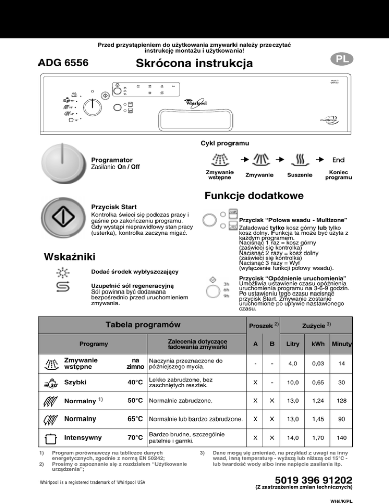 Przed przystąpieniem do użytkowania zmywarki należy przeczytać instrukcję montażu i użytkowania! PL Skrócona instrukcja ADG 6556 Cykl programu Programator Zasilanie On / Off Zmywanie wstępne Zmywanie Suszenie Koniec programu Funkcje dodatkowe Przycisk Start Kontrolka świeci się podczas pracy i gaśnie po zakończeniu programu. Gdy wystąpi nieprawidłowy stan pracy (usterka), kontrolka zaczyna migać. Przycisk “Połowa wsadu - Multizone” Załadować tylko kosz górny lub tylko kosz dolny. Funkcja ta może być użyta z każdym programem. Nacisnąć 1 raz = kosz górny (zaświeci się kontrolka) Nacisnąć 2 razy = kosz dolny (zaświeci się kontrolka) Nacisnąć 3 razy = Wył (wyłączenie funkcji połowy wsadu). Wskaźniki Dodać środek wybłyszczający Przycisk “Opóźnienie uruchomienia” Umożliwia ustawienie czasu opóźnienia uruchomienia programu na 3-6-9 godzin. Po ustawieniu tego czasu nacisnąć przycisk Start. Zmywanie zostanie uruchomione po upływie nastawionego czasu. Uzupełnić sól regeneracyjną Sól powinna być dodawana bezpośrednio przed uruchomieniem zmywania. Tabela programów Zalecenia dotyczące ładowania zmywarki Programy 1) 2) Proszek 2) Zużycie 3) A B Litry kWh Minuty Zmywanie wstępne na Naczynia przeznaczone do zimno późniejszego mycia. - - 4,0 0,03 14 Szybki zabrudzone, bez 40°C Lekko zaschniętych resztek. X - 10,0 0,65 30 Normalny 1) 50°C Normalnie zabrudzone. X X 13,0 1,24 128 Normalny 65°C Normalnie lub bardzo zabrudzone. X X 13,0 1,45 90 Intensywny 70°C patelnie i garnki. X X 14,0 1,70 140 Bardzo brudne, szczególnie Program porównawczy na tabliczce danych energetycznych, zgodnie z normą EN 50242; Prosimy o zapoznanie się z rozdziałem “Użytkowanie urządzenia”; Whirlpool is a registered trademark of Whirlpool USA 3) Dane mogą się zmieniać, na przykład z uwagi na inny wsad, inną temperaturę - wyższą lub niższą od 15°C lub twardość wody albo inne napięcie zasilania itp. 5019 396 91202 (Z zastrzeżeniem zmian technicznych) Jak używać zmywarki Dodatkowe wskazówki znajdują się w poszczególnych rozdziałach instrukcji użytkowania. Załaczyć urządzenie Załączanie automatyczne poprzez obrót pokrętła programatora (w przypadku pokrętła wciskanego należy je najpierw wyciągnąć). Duża komora A: Jak napełnić dozownik proszku A Do każdego cyklu zmywania. B C Mała komora B: Tylko do programów ze zmywaniem wstępnym. Sprawdzić środek wybłyszczający Wskażnik mechaniczny C lub kontrolka elektryczna na panelu sterowania (zależnie od modelu). Sprawdzić sól regenerującą Tylko dla zmywarek z systemem zmiękczania wody. Wskażnik mechaniczny D lub kontrolka elektryczna na panelu sterowania (zależnie od modelu). Załadować kosze Prosimy o zapoznanie się z zaleceniami odnośnie układania naczyń. Zamknąć drzwi, otworzyć kurek wody Wybrać program Wybrać funkcje dodatkowe Cykl zmywania Nacisnąć przycisk START Wyłączyć urządzenie Zakręcić kurek wody, wyładować kosze Ustawić żądany program. Zaświeci się odpowiednia kontrolka. Jeżeli są konieczne (zależnie od modelu). Zaświeci się odpowiadająca im kontrolka. Wybrany program zostanie zapamiętany (także wtedy, gdy nie ma prądu). “Aby zmienić program” Wcisnąć i przytrzymać wciśnięty przycisk START przez 2 sek. do chwili aż zgaśnie kontrolka Start; Wybrać nowy program i ponownie nacisnąć przycisk START. - Drzwi należy otwierać tylko wówczas, gdy jest to konieczne (Uwaga: wydostająca się para). - Jeżeli urządzenie zostanie wyłączone przed końcem programu to po ponownym załączeniu rozpocznie pracę od miejsca w którym zostało wyłączone. Tylko wtedy, gdy zgaśnie podświetlenie przycisku START: ustawić pokrętło w pozycji wyjściowej (w przypadku pokrętła wciskanego, wcisnąć je do oporu). UWAGA: gdy otwiera się drzwi, wydostaje się para! Wyładować zmywarkę rozpoczynając od dolnego kosza. Wskazówki dotyczące ładowania zmywarki i wyposażenia koszy Kosz górny: zależnie od modelu urządzenia 1): Wspornik wielofunkcyjny (A) Zależnie od położenia stosowany do np. długich przyborów kuchennych, filiżanek, szklanek. Możliwe są trzy jego położenia. Wsporniki naczyń (B): Zależnie od położenia stosowany do np. talerzy, filiżanek i kieliszków. Wspornik obrotowy do szklanek (C) 2): Zależnie od położenia stosowany do np. małych szklanek lub kieliszków. Połowa wsadu: Załadować tylko kosz górny. Włożyć koszyk na sztućce (D) do kosza górnego. Regulacja wysokość pionowej kosza (także załadowanego): • Ustawienie dolne: pociągnąć dwa uchwyty kosza (E) w kierunku na zewnątrz i obniżyć kosz. • Ustawienie górne: pociągnąć do góry dwa uchwyty (E) tak, aby zablokować kosz (Ustawienie fabryczne). Boki kosza winny być na jednakowym poziomie. Kosz dolny: Zależnie od modelu ze wspornikami talerzy składanymi lub stałymi(F). Połowa wsadu: Załadować tylko kosz dolny. Większa moc zmywania, zwłaszcza dla patelni i garnków. Koszyk na sztućce (G) lub (H): Niektóre modele są wyposażone w kratkę, (I) która można włożyć do koszyka na sztućce tak, aby je oddzielić. Koszyk na sztućce (D) tylko do urządzeń z funkcją połowy wsadu. Przybory, którymi można się zranić, należy włożyć do koszyka rękojeściami do góry. Nie należy myć w zmywarce przedmiotów nie nadających się do tego, na przykład wykonanych z drewna, aluminium, z tworzyw, cyny, srebra, nakryć dekorowanych (nie emaliowanych). Dostępne do zakupu u sprzedawcy: 1) Wspornik wielofunkcyjny (A) - N. Seria AMH 369. 2) Obrotowy wspornik na kieliszki (C) - N. Seria WGH 1000. WH/III/PL Co zrobić, gdy... Jeżeli wystąpią usterki w działaniu zmywarki, prosimy o sprawdzenie poniższych punktów, zanim zwrócicie się Państwo do Serwisu (* prosimy także o zapoznanie się z odpowiednim rozdziałem w instrukcji obsługi). Problem Przyczyna Rozwiązanie Urządzenie nie dział