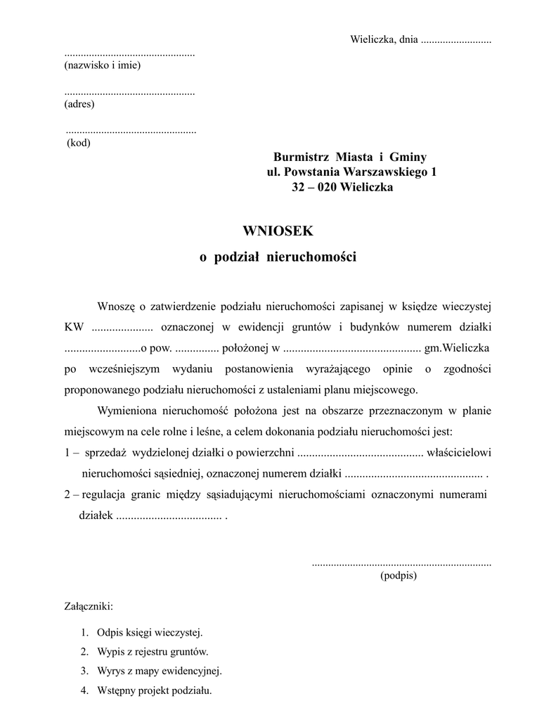 Wieliczka, dnia .......................... ................................................ (nazwisko i imie) ................................................ (adres) ................................................ (kod) Burmistrz Miasta i Gminy ul. Powstania Warszawskiego 1 32 – 020 Wieliczka WNIOSEK o podział nieruchomości Wnoszę o zatwierdzenie podziału nieruchomości zapisanej w księdze wieczystej KW ..................... oznaczonej w ewidencji gruntów i budynków numerem działki ..........................o pow. ............... położonej w ............................................... gm.Wieliczka po wcześniejszym wydaniu postanowienia wyrażającego opinie o zgodności proponowanego podziału nieruchomości z ustaleniami planu miejscowego. Wymieniona nieruchomość położona jest na obszarze przeznaczonym w planie miejscowym na cele rolne i leśne, a celem dokonania podziału nieruchomości jest: 1 – sprzedaż wydzielonej działki o powierzchni ........................................... właścicielowi nieruchomości sąsiedniej, oznaczonej numerem działki ............................................... . 2 – regulacja granic między sąsiadującymi nieruchomościami oznaczonymi numerami działek .................................... . .................................................................. (podpis) Załączniki: 1. Odpis księgi wieczystej. 2. Wypis z rejestru gruntów. 3. Wyrys z mapy ewidencyjnej. 4. Wstępny projekt podziału.