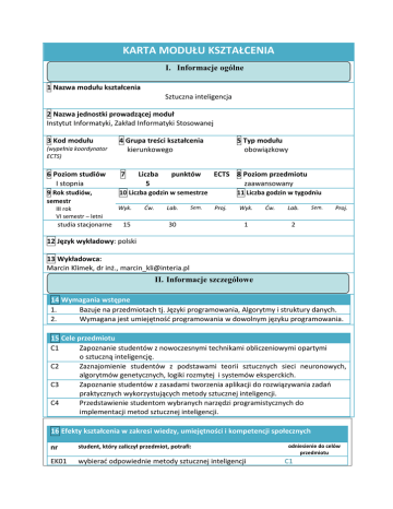 KARTA MODUŁU KSZTAŁCENIA I. Informacje ogólne 1 Nazwa modułu kształcenia Sztuczna inteligencja 2 Nazwa jednostki prowadzącej moduł Instytut Informatyki, Zakład Informatyki Stosowanej 3 Kod modułu (wypełnia koordynator ECTS) 4 Grupa treści kształcenia kierunkowego 6 Poziom studiów I stopnia 7 9 Rok studiów, semestr 10 Liczba godzin w semestrze III rok VI semestr – letni studia stacjonarne Wyk. 15 Liczba 5 Ćw. punktów Lab. Sem. 30 5 Typ modułu obowiązkowy ECTS 8 Poziom przedmiotu zaawansowany 11 Liczba godzin w tygodniu Proj. Wyk. 1 Ćw. Lab. Sem. Proj. 2 12 Język wykładowy: polski 13 Wykładowca: Marcin Klimek, dr inż., [email protected] II. Informacje szczegółowe 14 Wymagania wstępne 1. Bazuje na przedmiotach tj. Języki programowania, Algorytmy i struktury danych. 2. Wymagana jest umiejętność programowania w dowolnym języku programowania. 15 Cele przedmiotu C1 Zapoznanie studentów z nowoczesnymi technikami obliczeniowymi opartymi o sztuczną inteligencję. C2 Zaznajomienie studentów z podstawami teorii sztucznych sieci neuronowych, algorytmów genetycznych, logiki rozmytej i systemów eksperckich. C3 Zapoznanie studentów z zasadami tworzenia aplikacji do rozwiązywania zadań praktycznych wykorzystujących metody sztucznej inteligencji. C4 Przedstawienie studentom wybranych narzędzi programistycznych do implementacji metod sztucznej inteligencji. 16 Efekty kształcenia w zakresi wiedzy, umiejętności i kompetencji społecznych nr student, który zaliczył przedmiot, potrafi: EK01 wybierać odpowiednie metody sztucznej inteligencji odniesienie do celów przedmiotu C1 EK02 EK03 EK04 EK05 dla konkretnych, praktycznych problemów konstruować algorytmy genetyczne w konkretnym zastosowaniu, dobierać odpowiednie parametry algorytmu, reprezentację problemu itp. budować sieci neuronowe dla konkretnego problemu, oceniać przydatność ich zastosowania, potrafi dobrać odpowiednią strukturę sieci neuronowej oraz właściwy algorytm uczący adekwatnie do rozwiązywanego zadania tworzyć systemy ekspertowe z wykorzystaniem logiki rozmytej wybierać właściwe narzędzia (programistyczne) do modelowania problemu za pomocą metod sztucznej inteligencji C2, C3 C2, C3 C2 C4 17 Treści programowe forma zajęć – wykłady W1 W2 W3 W4 W5 W6 Sztuczna inteligencja – definicja, historia. Inteligentne metody obliczeniowe. Test Turinga. Języki sztucznej inteligencji. Narzędzia. Sieci neuronowe. Algorytmy uczenia i typy sztucznych sieci neuronowych. Perceptron. Sieci wielowarstwowe. Sieci Kohonena. Sieci Hopfielda. Algorytmy genetyczne i ewolucyjne. Implementacja algorytmów dla wybranych zadań praktycznych (optymalizacja funkcji, problem komiwojażera, problem szeregowania zadań). Różne operatory genetyczne dla reprezentacji binarnej i całkowitoliczbowej. Logika rozmyta. Sterowniki oparte na logice rozmytej. Rozmywanie, wyostrzanie. System ekspertowy. Reprezentacja wiedzy. Rozmyty system ekspertowy. Języki programowania systemów ekspertowych. Inne, wybrane metody sztucznej inteligencji: Systemy agentowe. Algorytmy mrówkowe. liczba godzin S liczba godzin NS odniesienie do efektów kształcenia dla przedmiotu 1 EK05 4 EK03 4 EK02 1 EK04 2 EK04 2 EK01 W7 Metaheurystyka symulowanego wyżarzania. Sztuczna inteligencja w grach komputerowych. suma godzin forma zajęć – laboratoria L1 L2 L3 L4 L5 L6 L7 Wykorzystanie neuronu jako klasyfikatora. Ograniczenia pojedynczego neuronu. Perceptron jako bramka logiczna. Uczenie z nauczycielem. Sieć neuronowa dla bramki XOR. Wykorzystanie sieci wielowarstwowych dla zagadnienia rozpoznawania obrazu (ikonek 9x9) Wykorzystanie sieci Kohonena w zagadnieniu klasteryzacji. Uczenie bez nauczyciela (algorytmy WTA, WTM). Funkcje sąsiedztwa. Budowa w C# algorytmu genetycznego z binarnymi chromosomami dla problemu optymalizacji funkcji. Implementacja operatorów krzyżowania, mutacji. Selekcja rankingowa, metodą koła ruletki, turniejowa. Budowa w C# algorytmu genetycznego z reprezentacją permutacyjną chromosomów dla klasycznego problemu komiwojażera. Operatory krzyżowania, mutacji dla reprezentacji permutacyjnej. Stworzenie prostego systemu ekspertowego w dowolnym narzędziu np. Prologu. suma godzin 1 EK01 15 liczba godzin S liczba godzin NS odniesienie do efektów kształcenia dla przedmiotu 2 EK03 4 EK03 4 EK03 4 EK03 6 EK02 6 EK02 4 EK04, EK05 30 18 Narzędzia/metody dydaktyczne 1. 2. Podczas laboratoriów praca indywidualna studentów: pisanie programów komputerowych, budowanie sieci neuronowych dla konkretnych zadań, opracowywanie elementów algorytmu genetycznego dla problemu optymalizacji funkcji itp. Laboratoria w części odbywają się przy tablicy: wspólnie ze studentami wykonywanie obliczeń dotyczących poszczególnych metod sztucznej inteligencji tj. przeprowadzenie kroku uczenia w sieciach wielowarstwowych, w sieciach Kohonena, określenie kodowania, funkcji przystosowania w algorytmie genetycznym itp. 3. 4. Wykład prowadzony z wykorzystaniem projektora multimedialnego. Wykłady przygotowane w formie prezentacji PowerPoint. Podczas wykładów prezentowane są także wybrane programy komputerowe zaimplementowane w C# tj. sieć neuronowa wielowarstwowa do realizacji bramki XOR, algorytm genetyczny, siłowy i sieć Hopfielda dla klasycznego problemu komiwojażera, problemu szeregowania zadań produkcyjnych itp. 19 Sposoby oceny (F – formująca, P – podsumowująca) F1. F2. F3 F4 F5 F6 P1 Ocena za wykonane sprawozdania z zajęć z sieci neuronowych z obliczeniami w arkuszu kalkulacyjnym lub oddane programy realizujące zadania do wykonania w sprawozdaniu). Łącznie do wykonania cztery sprawozdania (programy) z laboratoriów L1-L4. Kolokwium pisemne z sieci neuronowych. Ocena realizacji projektu zaliczeniowego do zrealizowania w domu (implementacja algorytmu genetycznego rozwiązującego wybrany problem optymalizacyjny). Kolokwium pisemne z algorytmów genetycznych. Ocena ciągła pracy indywidualnej podcza