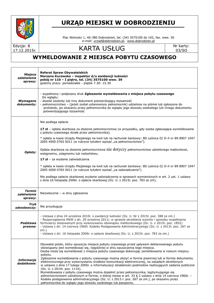 URZĄD MIEJSKI W DOBRODZIENIU Plac Wolności 1, 46-380 Dobrodzień, tel. (34) 3575100 do 102, fax. wew. 30 e-mail: [email protected], www.dobrodzien.pl Edycja: 8 17.12.2015r. KARTA USŁUG Nr karty: 03/SO WYMELDOWANIE Z MIEJSCA POBYTU CZASOWEGO Miejsce załatwienia sprawy: Referat Spraw Obywatelskich Marzena Kurowska – inspektor d/s ewidencji ludności pokój nr 110 – I piętro, tel. (34) 3575100 wew. 39 godziny pracy: poniedziałek - piątek 7.30- 15.30 Wymagane dokumenty: - wypełniony i podpisany druk Zgłoszenie wymeldowania z miejsca pobytu czasowego Do wglądu: - dowód osobisty lub inny dokument potwierdzający tożsamość - pełnomocnictwo – (jeżeli został ustanowiony pełnomocnik) udzielone na piśmie lub zgłoszone do protokołu, po okazaniu przez pełnomocnika do wglądu jego dowodu osobistego lub innego dokumentu potwierdzającego tożsamość Nie podlega opłacie 17 zł – opłata skarbowa za złożenie pełnomocnictwa (w przypadku, gdy osoba zgłaszająca wymeldowanie z pobytu czasowego działa przez pełnomocnika). * opłata w kasie Urzędu Miejskiego na kwit lub na rachunek bankowy: BS Leśnica O/ D-ń nr 89 8907 1047 2005 4000 0765 0011 (w rubryce tytułem wpisać „za pełnomocnictwo”). Opłaty: Opłata skarbowa za złożenie pełnomocnictwa wstępnemu, zstępnemu lub rodzeństwu. nie dotyczy pełnomocnictwa udzielonego małżonkowi, 17 zł – za wydanie zaświadczenia * opłata w kasie Urzędu Miejskiego na kwit lub na rachunek bankowy: BS Leśnica O/ D-ń nr 89 8907 1047 2005 4000 0765 0011 (w rubryce tytułem wpisać „za zaświadczenie”). Nie podlega opłacie skarbowej wydanie zaświadczenia w sprawach wymienionych w art. 2 ust. 1 ustawy z dnia 16 listopada 2006r. o opłacie skarbowej (Dz. U. z 2015r. poz. 783 ze zm). Termin załatwienia sprawy: Tryb odwoławczy: Podstawa prawna: Informacje dodatkowe: Niezwłocznie – w dniu zgłoszenia Nie przysługuje - Ustawa z dnia 24 września 2010r. o ewidencji ludności (Dz. U. Nr z 2015r. poz. 388 ze zm.) - Rozporządzenia MSW z dn. 29 września 2011r. w sprawie określania wzorów i sposobu wypełniania formularzy stosowanych przy wykonywaniu obowiązku meldunkowego (Dz. U. z 2015r. poz. 1852) - Ustawa z dn. 14 czerwca 1960r. Kodeks Postępowania Administracyjnego (Dz. U. z 2013r. poz. 267 ze zm.) - Ustawa z dn. 16 listopada 2006r. o opłacie skarbowej (Dz. U. z 2015r. poz. 783 ze zm.) Obywatel polski, który opuszcza miejsce pobytu czasowego przed upływem deklarowanego pobytu obowiązany jest wymeldować się, najpóźniej w dniu opuszczenia tego miejsca. Osoba może się wymeldować z miejsca pobytu czasowego dokonując zameldowania w nowym miejscu pobytu. Zgłoszenie wymeldowania z pobytu czasowego można złożyć w formie pisemnej lub w formie dokumentu elektronicznego przy wykorzystaniu środków komunikacji elektronicznej, na zasadach określonych w ustawie z dnia 17 lutego 2005r. o informatyzacji działalności podmiotów realizujących zadania publiczne (Dz. U. z 2014r. poz. 1114). Wymeldowania z pobytu czasowego można dopełnić przez pełnomocnika, legitymującego się pełnomocnictwem udzielonym w formie, o której mowa w art. 33 § 2 ustawy z dnia 14 czerwca 1960r. – Kodeks postępowania administracyjnego (Dz. U. z 2013 r. poz. 267 ze zm.), po okazaniu przez pełnomocnika do wglądu jego dowodu osobistego lub paszportu. Za osobę nie posiadającą zdolności do czynności prawnych lub posiadającą ograniczoną zdolność do czynności prawnych obowiązek meldunkowy wykonuje jej przedstawiciel ustawowy, opiekun prawny lub inna osoba sprawująca nad nią faktyczną opiekę w miejscu ich wspólnego pobytu. Osobie na jej wniosek może być wydane zaświadczenie stwierdzające dopełnienie obowiązku wymeldowania się. Jeżeli okres pobytu czasowego trwającego ponad 3 miesiące odpowiada okresowi zgłoszonemu przy zameldowaniu, osoba opuszczająca miejsce tego pobytu jest zwolniona od obowiązku wymeldowania się. Zgłoszenie zgonu dokonane w urzędzie stanu cywilnego, zgodnie z przepisami prawa o aktach stanu cywilnego, zastępuje wymeldowanie osoby zmarłej z miejsca pobytu czasowego. Formularze wniosków i druki do pobrania: Druk Zgłoszenie wymeldowania z miejsca pobytu czasowego, druk do złożenia pełnomocnictwa oraz wniosek o wydanie zaświadczenia można pobrać w Referacie Spraw Obywatelskich tut. Urzędu – pokój nr 110, bądź skorzystać z załączonych wzorów druków. Opracowała: Ewa Kalisz – inspektor ds. ewidencji ludności, dn. 20.07.2005r. Aktualizowała: Marzena Kurowska – inspektor ds. ewidencji ludności, dn. 17.12.2015r. Zatwierdził: Waldemar Krafczyk - Sekretarz Gminy, dn. 17.12.2015r.