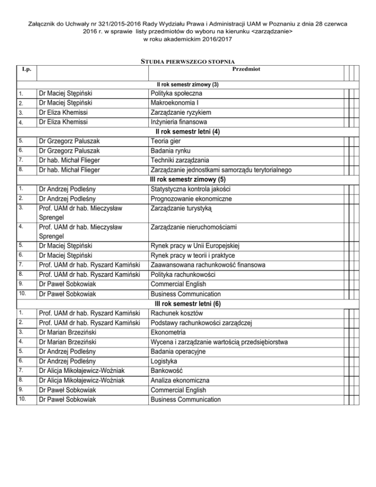 Załącznik do Uchwały nr 321/2015-2016 Rady Wydziału Prawa i Administracji UAM w Poznaniu z dnia 28 czerwca 2016 r. w sprawie listy przedmiotów do wyboru na kierunku <zarządzanie> w roku akademickim 2016/2017 STUDIA PIERWSZEGO STOPNIA Lp. Przedmiot II rok semestr zimowy (3) 1. 2. 3. 4. 5. 6. 7. 8. 1. 2. 3. 4. 5. 6. 7. 8. 9. 10. 1. 2. 3. 4. 5. 6. 7. 8. 9. 10. Dr Maciej Stępiński Dr Maciej Stępiński Dr Eliza Khemissi Dr Eliza Khemissi Dr Grzegorz Paluszak Dr Grzegorz Paluszak Dr hab. Michał Flieger Dr hab. Michał Flieger Dr Andrzej Podleśny Dr Andrzej Podleśny Prof. UAM dr hab. Mieczysław Sprengel Prof. UAM dr hab. Mieczysław Sprengel Dr Maciej Stępiński Dr Maciej Stępiński Prof. UAM dr hab. Ryszard Kamiński Prof. UAM dr hab. Ryszard Kamiński Dr Paweł Sobkowiak Dr Paweł Sobkowiak Prof. UAM dr hab. Ryszard Kamiński Prof. UAM dr hab. Ryszard Kamiński Dr Marian Brzeziński Dr Marian Brzeziński Dr Andrzej Podleśny Dr Andrzej Podleśny Dr Alicja Mikołajewicz-Woźniak Dr Alicja Mikołajewicz-Woźniak Dr Paweł Sobkowiak Dr Paweł Sobkowiak Polityka społeczna Makroekonomia I Zarządzanie ryzykiem Inżynieria finansowa II rok semestr letni (4) Teoria gier Badania rynku Techniki zarządzania Zarządzanie jednostkami samorządu terytorialnego III rok semestr zimowy (5) Statystyczna kontrola jakości Prognozowanie ekonomiczne Zarządzanie turystyką Zarządzanie nieruchomościami Rynek pracy w Unii Europejskiej Rynek pracy w teorii i praktyce Zaawansowana rachunkowość finansowa Polityka rachunkowości Commercial English Business Communication III rok semestr letni (6) Rachunek kosztów Podstawy rachunkowości zarządczej Ekonometria Wycena i zarządzanie wartością przedsiębiorstwa Badania operacyjne Logistyka Bankowość Analiza ekonomiczna Commercial English Business Communication Załącznik do Uchwały nr 321/2015-2016 Rady Wydziału Prawa i Administracji UAM w Poznaniu z dnia 28 czerwca 2016 r. w sprawie listy przedmiotów do wyboru na kierunku <zarządzanie> w roku akademickim 2016/2017 STUDIA DRUGIEGO STOPNIA Przedmiot Lp. 1. 2. Dr hab. Maria Majewska Dr hab. Maria Majewska 3. 1. 2. 3. 4. 5. Dr hab. Maria Majewska Dr Eliza Khemissi Prof. UAM dr hab. Marcin Orlicki Dr Piotr Gosieniecki II rok semestr zimowy (3) Międzynarodowe stosunki gospodarcze Finanse międzynarodowe Seminarium magisterskie II roksemestr letni (4) Analiza strategiczna Zarządzanie produkcją i operacjami Ubezpieczenia gospodarcze Prawo karne skarbowe Seminarium magisterskie