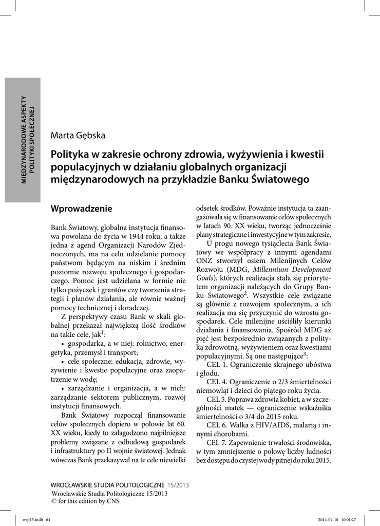 MIĘDZYNARODOWE ASPEKTY POLITYKI SPOŁECZNEJ Marta Gębska Polityka w zakresie ochrony zdrowia, wyżywienia i kwestii populacyjnych w działaniu globalnych organizacji międzynarodowych na przykładzie Banku Światowego Wprowadzenie Bank Światowy, globalna instytucja finansowa powołana do życia w 1944 roku, a także jedna z agend Organizacji Narodów Zjednoczonych, ma na celu udzielanie pomocy państwom będącym na niskim i średnim poziomie rozwoju społecznego i gospodarczego. Pomoc jest udzielana w formie nie tylko pożyczek i grantów czy tworzenia strategii i planów działania, ale równie ważnej pomocy technicznej i doradczej. Z perspektywy czasu Bank w skali globalnej przekazał największą ilość środków na takie cele, jak1: • gospodarka, a w niej: rolnictwo, energetyka, przemysł i transport; • cele społeczne: edukacja, zdrowie, wyżywienie i kwestie populacyjne oraz zaopatrzenie w wodę; • zarządzanie i organizacja, a w nich: zarządzanie sektorem publicznym, rozwój instytucji finansowych. Bank Światowy rozpoczął finansowanie celów społecznych dopiero w połowie lat 60. XX wieku, kiedy to załagodzono najpilniejsze problemy związane z odbudową gospodarek i infrastruktury po II wojnie światowej. Jednak wówczas Bank przekazywał na te cele niewielki odsetek środków. Poważnie instytucja ta zaangażowała się w finansowanie celów społecznych w latach 90. XX wieku, tworząc jednocześnie plany strategiczne i inwestycyjne w tym zakresie. U progu nowego tysiąclecia Bank Światowy we współpracy z innymi agendami ONZ stworzył osiem Milenijnych Celów Rozwoju (MDG, Millennium Development Goals), których realizacja stała się priorytetem organizacji należących do Grupy Banku Światowego2. Wszystkie cele związane są głównie z rozwojem społecznym, a ich realizacja ma się przyczynić do wzrostu gospodarek. Cele milenijne uściśliły kierunki działania i finansowania. Spośród MDG aż pięć jest bezpośrednio związanych z polityką zdrowotną, wyżywieniem oraz kwestiami populacyjnymi. Są one następujące3: CEL 1. Ograniczenie skrajnego ubóstwa i głodu. CEL 4. Ograniczenie o 2/3 śmiertelności niemowląt i dzieci do piątego roku życia. CEL 5. Poprawa zdrowia kobiet, a w szczególności matek — ograniczenie wskaźnika śmiertelności o 3/4 do 2015 roku. CEL 6. Walka z HIV/AIDS, malarią i innymi chorobami. CEL 7. Zapewnienie trwałości środowiska, w tym zmniejszenie o połowę liczby ludności bez dostępu do czystej wody pitnej do roku 2015. 1 2 3 WROCŁAWSKIE STUDIA POLITOLOGICZNE 15/2013 Wrocławskie Studia Politologiczne 15/2013 © for this edition by CNS wsp15.indb 64 2014-04-10 10:01:27 65 Strategia Banku Światowego w zakresie zdrowia, wyżywienia i kwestii populacyjnych Najnowsza globalna strategia Banku Światowego w zakresie zdrowia, wyżywienia i kwestii populacyjnych (HNP, Heath, Nutrition & Population4) powstała w 2007 roku. W czerwcu 2006 roku plan strategii został przedstawiony Komitetowi ds. Rozwoju Efektywności (CODE, Committee on Development Effectiveness) funkcjonującemu w Banku. Plan przedstawiono do konsultacji partnerom globalnym, ekspertom Banku oraz kadrze zarządzającej, w wyniku czego ustalono tzw. kierunki strategiczne. Drugi etap prac polegał na dyskusjach i uzgadnianiu szczegółów w ramach konsultacji między CODE a globalnymi partnerami i poszczególnymi państwami ze wszystkich regionów świata. W sumie w przygotowaniu strategii najbardziej aktywnie uczestniczyło: 9 państw-beneficjentów, 65 globalnych partnerów, w tym dwustronne i multilateralne organizacje oraz organizacje społeczeństwa obywatelskiego, oraz 160 osób — kadry zarządzającej i ekspertów ds. zdrowia, wyżywienia i kwestii populacyjnych Banku5. Strategia HNP nadaje kierunek działania, pozostawiając szczegóły techniczne do ustalenia państwom członkowskim ze względu na zróżnicowane możliwości wdrażania i specyfikę problemów wynikających z odmiennej sytuacji społecznej, politycznej, kulturowej czy religijnej w kraju. Co więcej, strategia nie rekomenduje konkretnych reform ani zaleceń 4 5 do realizacji w państwach, nawet najbiedniejszych, przeżywających trudności społeczne czy po konfliktach. Strategia kładzie nacisk raczej na wyzwania i możliwości zaangażowania Banku i jego globalnych partnerów w celu udzielenia pomocy pożyczkowej i niefinansowej państwom potrzebującym. Podstawą określenia wyzwań Strategii HNP były następujące dokumenty6: analizy w zakresie finansowania sektora zdrowia i polityki żywnościowej, globalny program działań Banku Światowego w zakresie HIV/ AIDS z 2006 roku (Bank Global Program Action Plan for HIV/AIDS) oraz nowe ustalenia w zakresie zdrowia seksualnego i reprodukcji z 2006 roku. Strategiczne cele, mające poprawić warunki życia i zdrowia najbiedniejszych i niedostosowanych grup ludności, są następujące7: 1. poprawa dostarczania usług dla najbiedniejszych w zakresie HNP w celu polepszenia jakości ich życia przez globalne i krajowe instytucje; 2. zapobieganie ubóstwu w wyniku choroby poprzez udostępnianie pomocy finansowej; 3. poprawa stabilności i trwałości finansowania sektora HNP, zapewnienie jego stabilnej pozycji w polityce makroekonomicznej i fiskalnej, a tym samym poprawa konkurencyjności całego państwa; 4. poprawa zarządzania, sposobów rozliczania i transparentności. Aby powyższe cele mogły być zrealizowane na poziomie państw, Bank Światowy wyznaczył pięć głównych kierunków działania na lata 2007–2017. Są one następujące8: 1. silne nastawienie na wyniki działania (nie tylko koncepcje) w zakresie HNP; 2. zwiększenie udziału Banku w wysiłkach państw na rzecz wzmocnienia i organizacji efektywnych i stabilnych systemów zdrowia; 3. zapewnienie synergii między wzmacnianiem systemu zdrowia a interwencjami MIĘDZYNARODOWE ASPEKTY POLITYKI SPOŁECZNEJ Głównym problemem badawczym podjętym w niniejszej pracy je