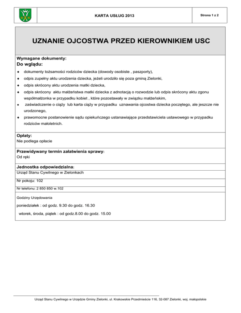 KARTA USŁUG 2013 Strona 1 z 2 UZNANIE OJCOSTWA PRZED KIEROWNIKIEM USC Wymagane dokumenty: Do wglądu: ♦ dokumenty tożsamości rodziców dziecka (dowody osobiste , paszporty), ♦ odpis zupełny aktu urodzenia dziecka, jeżeli urodziło się poza gminą Zielonki, ♦ odpis skrócony aktu urodzenia matki dziecka, ♦ odpis skrócony aktu małżeństwa matki dziecka z adnotacją o rozwodzie lub odpis skrócony aktu zgonu współmałżonka w przypadku kobiet , które pozostawały w związku małżeńskim, ♦ zaświadczenie o ciąży lub karta ciąży w przypadku uznawania ojcostwa dziecka poczętego, ale jeszcze nie urodzonego, ♦ prawomocne postanowienie sądu opiekuńczego ustanawiające przedstawiciela ustawowego w przypadku rodziców małoletnich. Opłaty: Nie podlega opłacie Przewidywany termin załatwienia sprawy: Od ręki Jednostka odpowiedzialna: Urząd Stanu Cywilnego w Zielonkach Nr pokoju: 102 Nr telefonu: 2 850 850 w.102 Godziny Urzędowania poniedziałek : od godz. 9.30 do godz. 16.30 wtorek, środa, piątek : od godz.8.00 do godz. 15.00 Urząd Stanu Cywilnego w Urzędzie Gminy Zielonki, ul. Krakowskie Przedmieście 116, 32-087 Zielonki, woj. małopolskie KARTA USŁUG 2013 Strona 2 z 2 Tryb odwoławczy: Nie dotyczy Podstawa prawna: art.7 ust.3a , art.43 ustawy z dnia 29 września 1986 roku Prawo o aktach stanu cywilnego( t.j. Dz. U. z 2011 roku, Nr 212, poz. 1264), • art. 72 – 77, art.89,90' ustawy z dnia 25 lutego 1964 roku Kodeks rodzinny i opiekuńczy (t.j. Dz. U. z 2012 roku, poz. 788) Uwagi: ♦ Uznanie ojcostwa następuje gdy mężczyzna od którego dziecko pochodzi oświadczy,że jest ojcem dziecka , a matka dziecka potwierdzi, że ojcem tego dziecka jest ten mężczyzna. ♦ Jeżeli kierownik USC odmówił przyjęcia oświadczeń koniecznych do uznania ojcostwa mężczyzna i kobieta mogą wystąpić do sądu opiekuńczego o uznanie ojcostwa. ♦ Uznanie ojcostwa nie może nastąpić po osiągnięciu przez dziecko pełnoletności. Urząd Stanu Cywilnego w Urzędzie Gminy Zielonki, ul. Krakowskie Przedmieście 116, 32-087 Zielonki, woj. małopolskie