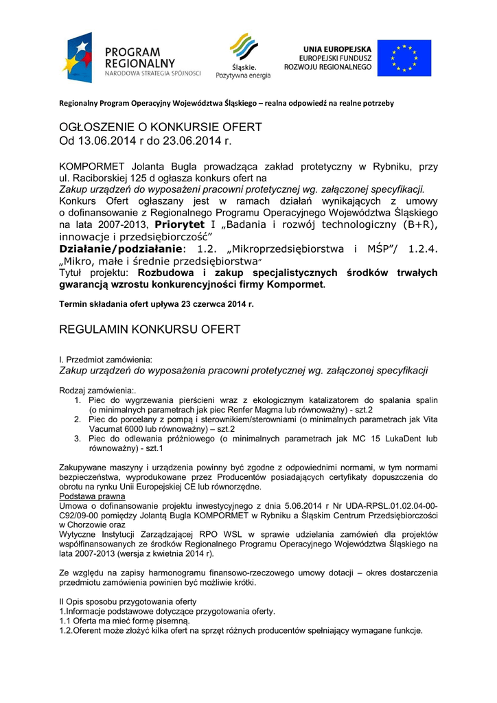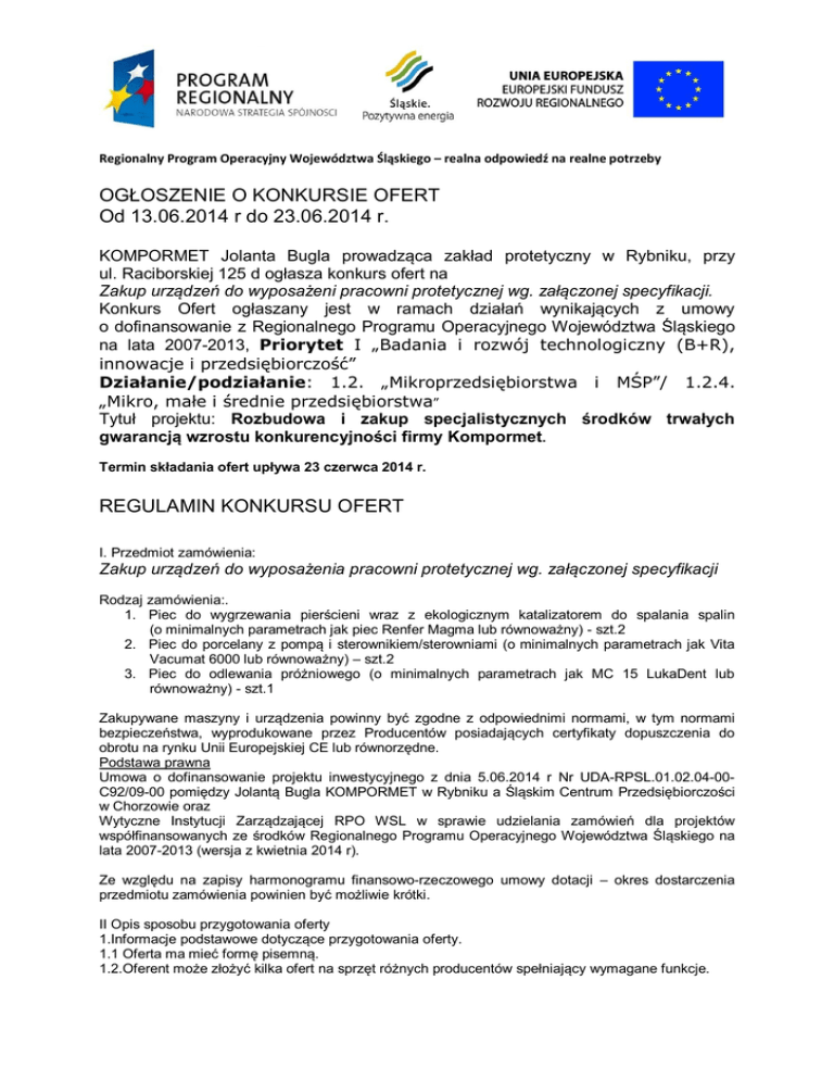 Regionalny Program Operacyjny Województwa Śląskiego – realna odpowiedź na realne potrzeby OGŁOSZENIE O KONKURSIE OFERT Od 13.06.2014 r do 23.06.2014 r. KOMPORMET Jolanta Bugla prowadząca zakład protetyczny w Rybniku, przy ul. Raciborskiej 125 d ogłasza konkurs ofert na Zakup urządzeń do wyposażeni pracowni protetycznej wg. załączonej specyfikacji. Konkurs Ofert ogłaszany jest w ramach działań wynikających z umowy o dofinansowanie z Regionalnego Programu Operacyjnego Województwa Śląskiego na lata 2007-2013, Priorytet I „Badania i rozwój technologiczny (B+R), innowacje i przedsiębiorczość” Działanie/podziałanie: 1.2. „Mikroprzedsiębiorstwa i MŚP”/ 1.2.4. „Mikro, małe i średnie przedsiębiorstwa” Tytuł projektu: Rozbudowa i zakup specjalistycznych środków trwałych gwarancją wzrostu konkurencyjności firmy Kompormet. Termin składania ofert upływa 23 czerwca 2014 r. REGULAMIN KONKURSU OFERT I. Przedmiot zamówienia: Zakup urządzeń do wyposażenia pracowni protetycznej wg. załączonej specyfikacji Rodzaj zamówienia:. 1. Piec do wygrzewania pierścieni wraz z ekologicznym katalizatorem do spalania spalin (o minimalnych parametrach jak piec Renfer Magma lub równoważny) - szt.2 2. Piec do porcelany z pompą i sterownikiem/sterowniami (o minimalnych parametrach jak Vita Vacumat 6000 lub równoważny) – szt.2 3. Piec do odlewania próżniowego (o minimalnych parametrach jak MC 15 LukaDent lub równoważny) - szt.1 Zakupywane maszyny i urządzenia powinny być zgodne z odpowiednimi normami, w tym normami bezpieczeństwa, wyprodukowane przez Producentów posiadających certyfikaty dopuszczenia do obrotu na rynku Unii Europejskiej CE lub równorzędne. Podstawa prawna Umowa o dofinansowanie projektu inwestycyjnego z dnia 5.06.2014 r Nr UDA-RPSL.01.02.04-00C92/09-00 pomiędzy Jolantą Bugla KOMPORMET w Rybniku a Śląskim Centrum Przedsiębiorczości w Chorzowie oraz Wytyczne Instytucji Zarządzającej RPO WSL w sprawie udzielania zamówień dla projektów współfinansowanych ze środków Regionalnego Programu Operacyjnego Województwa Śląskiego na lata 2007-2013 (wersja z kwietnia 2014 r). Ze względu na zapisy harmonogramu finansowo-rzeczowego umowy dotacji – okres dostarczenia przedmiotu zamówienia powinien być możliwie krótki. II Opis sposobu przygotowania oferty 1.Informacje podstawowe dotyczące przygotowania oferty. 1.1 Oferta ma mieć formę pisemną. 1.2.Oferent może złożyć kilka ofert na sprzęt różnych producentów spełniający wymagane funkcje. Regionalny Program Operacyjny Województwa Śląskiego – realna odpowiedź na realne potrzeby 1.3 Oferta powinna zawierać wyliczenie ceny w PLN (z ewentualnym podaniem waluty i ceny zakupu od producenta). 1.4. Oferta może być częściowa - na wybrane urządzenia z zamówienia. 2. Oferta musi zawierać: 2.1 Dane identyfikacyjne oferenta: pełna nazwa, adres pocztowy, numery telefonów, faxu, e-mail, strona internetowa www., numer konta bankowego. 2.1.a Aktualny wpis do ewidencji działalności gospodarczej lub obraz wydruku w PDF/wydruk aktualny z właściwego rejestru (CEIDG/KRS) 2.2. Listę oferowanych urządzeń z danymi technicznymi i funkcjonalnościami z podaniem cen jednostkowych. 2.3. Proponowaną cenę łączną za przedmiot zamówienia w wartości netto i brutto wraz z walutą (w szczególności jeżeli zostanie zastosowany rabat) 2.4. Termin/Datę ważności oferty. 2.5. Termin dostarczenia maszyn i urządzeń do Zamawiającego 2.6. Warunki płatności. 2.7. Warunki i termin obowiązywania gwarancji 2.8..Podpis (w przypadku dostarczenia oferty drogą elektroniczną – co najmniej imię i nazwisko osoby sporządzającej ofertę wraz z telefonem kontaktowym) III. Wybór oferty i ogłoszenie warunków przetargu. 1. Otwarcie ofert rozpocznie się dnia 23.06.2014 o godzinie 12.00 na posiedzeniu Komisji w budynku Pracowni KOMPORMET w Rybniku, przy ulicy Raciborskiej 125d i jest jawne w części związanej z samym jej otwarciem i podaniem ceny (nie dotyczy to pełnego odczytania ich treści i okazania ich zawartości). 2. Wybór najkorzystniejszej oferty nastąpi w oparciu o następujące kryteria: a. cena 80%. b. termin realizacji dostawy 20%. 3. W konkursie Komisja może wybrać niektóre urządzenia z przedstawionej oferty danego oferenta. 4. Ogłoszenie wyników przetargu: Zamawiający zawiadomi o wyniku konkursu pisemnie (mailem) lub telefonicznie niezwłocznie po dokonaniu wyboru. Wybrany oferent otrzyma zamówienie w terminie 7 dni kalendarzowych od ogłoszenia wyników postępowania. IV Miejsce i termin składania ofert: 1.Oferty należy przesłać drogą mailową/pocztową lub złożyć osobiście w siedzibie firmy KOMPORMET Jolanta Bugla ul. Raciborska 125d Rybnik 44-200 2. Nieprzekraczalny termin złożenia oferty: 23.06.2014 r. 3. Oferty złożone po tym terminie nie będą brały udziału w przetargu. Oferty wysłane pocztą/ kurierem muszą dotrzeć do dniu 23.06.2014r. do siedziby Zamawiającego, w przeciwnym razie nie będą brane pod uwagę. V. Tryb udzielania wyjaśnień na temat przetargu. 1. Osobą upoważniona do porozumiewania się z oferentami jest pani Wiktoria Kusz pod nr telefonicznym 780-136-716 lub e-mail: [email protected] VI. Postanowienia końcowe: 1. Zamawiający zastrzega sobie prawo do zamknięcia przetargu bez wybrania którejkolwiek z ofert bez podania przyczyny na każdym etapie postępowania. 2. Zamawiający zastrzega sobie prawo wykluczenia z przetargu i odrzucenia z przyczyn formalnych tych oferentów, którzy złożą oświadczenia lub podadzą informacje niezgodne ze stanem faktycznym. 3. Zamawiający zastrzega sobie prawo do swobodnego wyboru dostawcy oraz do wyboru tylko niektórych urządzeń/maszyn z oferty danego Oferenta. 4. Oferent ponosi wszystkie koszty związane z uczestnictwem w postępowaniu, w tym koszty złożenia i przygotowania oferty, niezależnie od wyniku postępowania. Regionalny Program Operacyjny Wojewód