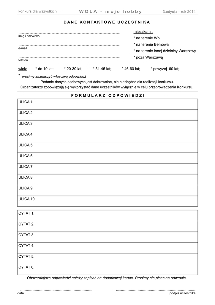 konkurs dla wszystkich WOLA - moje hobby 3.edycja – rok 2014 D A N E K O N TA K T O W E U C Z E S T N I K A …......................................................................................................................... imię i nazwisko * na terenie Woli ….......................................................................................................................... e-mail * na terenie Bemowa * na terenie innej dzielnicy Warszawy …......................................................................................................................... telefon wiek: mieszkam : * do 19 lat; * 20-30 lat; * 31-45 lat; * poza Warszawą * 46-60 lat; * powyżej 60 lat; * prosimy zaznaczyć właściwą odpowiedź Podanie danych osobowych jest dobrowolne, ale niezbędne dla realizacji konkursu. Organizatorzy zobowiązują się wykorzystać dane uczestników wyłącznie w celu przeprowadzenia Konkursu. FORMULARZ ODPOWIEDZI ULICA 1. ULICA 2. ULICA 3. ULICA 4. ULICA 5. ULICA 6. ULICA 7. ULICA 8. ULICA 9. ULICA 10. CYTAT 1. CYTAT 2. CYTAT 3. CYTAT 4. CYTAT 5. CYTAT 6. Obszerniejsze odpowiedzi należy zapisać na dodatkowej kartce. Prosimy nie pisać na odwrocie. ….............................................................................. data …..................................................................................... podpis uczestnika