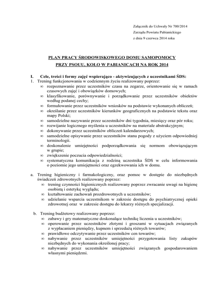 Załącznik do Uchwały Nr 700/2014 Zarządu Powiatu Pabianickiego z dnia 9 czerwca 2014 roku PLAN PRACY ŚRODOWISKOWEGO DOMU SAMOPOMOCY PRZY PSOUU, KOŁO W PABIANICACH NA ROK 2014 I. Cele, treści i formy zajęć wspierająco - aktywizujących z uczestnikami ŚDS: 1. Trening funkcjonowania w codziennym życiu realizowany poprzez: • rozpoznawanie przez uczestników czasu na zegarze, orientowanie się w ramach czasowych zajęć i obowiązków domowych; • klasyfikowanie, porównywanie i porządkowanie przez uczestników obiektów według podanej cechy; • formułowanie przez uczestników wniosków na podstawie wykonanych obliczeń; • określanie przez uczestników kierunków geograficznych na podstawie tekstu oraz mapy Polski; • samodzielne nazywanie przez uczestników dni tygodnia, miesięcy oraz pór roku; • rozwijanie logicznego myślenia u uczestników na materiale abstrakcyjnym; • dokonywanie przez uczestników obliczeń kalendarzowych; • samodzielne opisywanie przez uczestników stanu pogody z użyciem odpowiedniej terminologii. • doskonalenie umiejętności podporządkowania się normom obowiązującym w grupie; • zwiększenie poczucia odpowiedzialności; • systematyczna komunikacja z rodziną uczestnika ŚDS w celu informowania o poziomie jego umiejętności oraz egzekwowania ich w domu. a. Trening higieniczny i farmakologiczny, oraz pomoc w dostępie do niezbędnych świadczeń zdrowotnych realizowany poprzez: • trening czynności higienicznych realizowany poprzez zwracanie uwagi na higienę osobistą i estetykę wyglądu; • kształtowanie zachowań prozdrowotnych u uczestników; • udzielanie wsparcia uczestnikom w zakresie dostępu do psychiatrycznej opieki zdrowotnej oraz w zakresie dostępu do lekarzy różnych specjalizacji. b. Trening budżetowy realizowany poprzez: • zabawy i gry matematyczne doskonalące technikę liczenia u uczestników; • operowanie przez uczestników złotymi i groszami w sytuacjach związanych z wypłacaniem pieniędzy, kupnem i sprzedażą różnych towarów; • prawidłowe odczytywanie przez uczestników cen towarów; • nabywanie przez uczestników umiejętności przygotowania listy zakupów niezbędnych do wykonania określonej pracy; • nabywanie przez uczestników umiejętności związanych gospodarowaniem własnymi pieniędzmi. c. Trening kulinarny i gospodarstwa domowego: • zwiększenie u uczestników umiejętności czynności samoobsługi; • nabywanie przez uczestników umiejętności doboru diety do swojego stanu zdrowia (cukrzyca, nadwaga, niedowaga); • nabywanie przez uczestników umiejętności zagotowania wody, zrobienia prostych kanapek, drobnego posiłku, sałatki; • dbanie przez uczestników o zasady bhp; • wzbudzenie u uczestników motywacji do udziału w czynnościach gospodarstwa domowego w ośrodku i w domu; • nabywanie przez uczestników umiejętności związanych z obsługą urządzeń i sprzętu AGD (robot kuchenny, malakser, toster, blender, lodówka, zamrażarka, zmywarka); • doskonalenie przez uczestników umiejętności przygotowania stołów i dekoracji na imprezy okolicznościowe; • dbanie przez uczestników o porządek we własnym mieszkaniu; • planowanie wraz z uczestnikami ich tygodniowych dyżurów na treningach kulinarnych i gospodarstwa domowego; • nabywanie przez uczestników umiejętności z zakresu obsługi pralki automatycznej; • przygotowanie przez uczestników bielizny do prania, sortowanie pod względem kolorów, pranie tkanin w odpowiedniej temperaturze; • planowanie swoich zamierzeń z uwzględnieniem obowiązków domowych. d. Trening techniczny realizowany poprzez następujące zajęcia: • Introligatorstwo, • Stolarstwo z elementami rzeźbiarstwa, • Techniczne majsterkowanie. 2. Trening umiejętności społecznych i interpersonalnych realizowany poprzez: • integrowanie uczestników z ich rodziną i środowiskiem lokalnym; • nabywanie przez uczestników umiejętności w zakresie korzystania i zachowania się w komunikacji publicznej; • doskonalenie u uczestników umiejętności słuchania ze zrozumieniem; • uświadamianie uczestnikom odpowiedzialności za swoje wypowiedzi, zachowania i czyny; • nabywanie przez uczestników i doskonalenie u nich umiejętności nawiązywania kontaktów i podtrzymywania rozmowy z członkami rodziny; • umiejętne i samodzielne napisanie przez uczestnika swojego imienia i nazwiska; • wykonywanie przez uczestników prac zgodnie z poleceniami; • dostrzeganie przez uczestników konieczności szukania pomocy w sytuacji zagrożenia i wypadku; • rozwijanie u uczestników umiejętności przezwyciężenia barier poznawczoemocjonalnych i motywacyjnych (np. nieśmiałości, obawy przed nieznanym); • utrzymywanie kontaktów z rodziną uczestników, rozmowy indywidualne, wsparcie i pomoc rodzinie. 3. Trening umiejętności spędzania wolnego czasu realizowany poprzez: • Wyrabianie u uczestników nawyków czynnego wypoczynku; • kształtowanie u uczestników potrzeby uczestnictwa w życiu kulturalnym; • • • • • • • doskonalenie u uczestników umiejętności komunikowania się z kolegami podczas gier planszowych; rozwijanie u uczestników zainteresowania literaturą i czytelnictwem poprzez aktywny udział w Dyskusyjnym Klubie Książki Osób Niepełnosprawnych; motywowanie uczestników do aktywnego uczestnictwa w imprezach kulturalno – rozrywkowych organizowanych na terenie miasta; przestrzeganie przez uczestników zasady fair play podczas gier; rozwiązywanie przez uczestników krzyżówek panoramicznych, obrazkowych itp.; gry logiczne rozwijanie u uczestników konstruktywne i strategiczne myślenie; motywowanie uczestników do wybiórczego oglądania TV i wyboru programów zgodnie z zainteresowaniami. a. Trening obsługi komputera: • obsługa przez uczestników programu Paint, Word, kreatorów sprzętu cyfrowego typu dyktafon i aparat fotograficzny; • nabywanie przez uczestników umieję