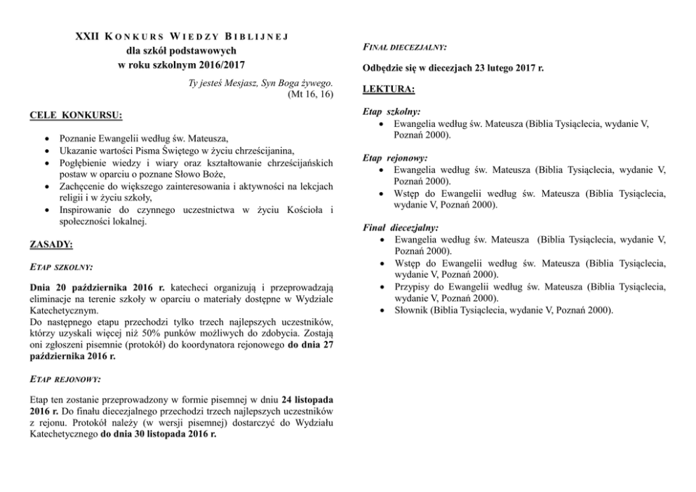 XXII K O N K U R S W I E D Z Y B I B L I J N E J dla szkół podstawowych w roku szkolnym 2016/2017 Ty jesteś Mesjasz, Syn Boga żywego. (Mt 16, 16) CELE KONKURSU: Poznanie Ewangelii według św. Mateusza, Ukazanie wartości Pisma Świętego w życiu chrześcijanina, Pogłębienie wiedzy i wiary oraz kształtowanie chrześcijańskich postaw w oparciu o poznane Słowo Boże, Zachęcenie do większego zainteresowania i aktywności na lekcjach religii i w życiu szkoły, Inspirowanie do czynnego uczestnictwa w życiu Kościoła i społeczności lokalnej. ZASADY: ETAP SZKOLNY: Dnia 20 października 2016 r. katecheci organizują i przeprowadzają eliminacje na terenie szkoły w oparciu o materiały dostępne w Wydziale Katechetycznym. Do następnego etapu przechodzi tylko trzech najlepszych uczestników, którzy uzyskali więcej niż 50% punków możliwych do zdobycia. Zostają oni zgłoszeni pisemnie (protokół) do koordynatora rejonowego do dnia 27 października 2016 r. ETAP REJONOWY: Etap ten zostanie przeprowadzony w formie pisemnej w dniu 24 listopada 2016 r. Do finału diecezjalnego przechodzi trzech najlepszych uczestników z rejonu. Protokół należy (w wersji pisemnej) dostarczyć do Wydziału Katechetycznego do dnia 30 listopada 2016 r. FINAŁ DIECEZJALNY: Odbędzie się w diecezjach 23 lutego 2017 r. LEKTURA: Etap szkolny: Ewangelia według św. Mateusza (Biblia Tysiąclecia, wydanie V, Poznań 2000). Etap rejonowy: Ewangelia według św. Mateusza (Biblia Tysiąclecia, wydanie V, Poznań 2000). Wstęp do Ewangelii według św. Mateusza (Biblia Tysiąclecia, wydanie V, Poznań 2000). Finał diecezjalny: Ewangelia według św. Mateusza (Biblia Tysiąclecia, wydanie V, Poznań 2000). Wstęp do Ewangelii według św. Mateusza (Biblia Tysiąclecia, wydanie V, Poznań 2000). Przypisy do Ewangelii według św. Mateusza (Biblia Tysiąclecia, wydanie V, Poznań 2000). Słownik (Biblia Tysiąclecia, wydanie V, Poznań 2000).