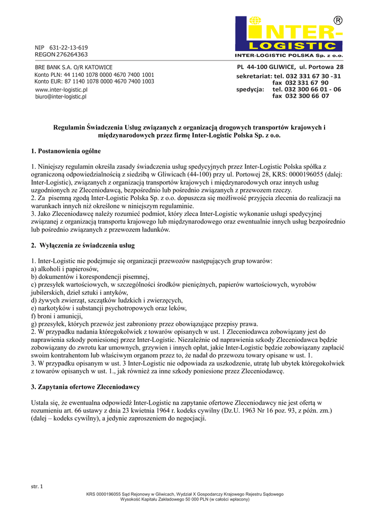 NIP 631-22-13-619 REGON 276264363 BRE BANK S.A. O/R KATOWICE Konto PLN: 44 1140 1078 0000 4670 7400 1001 Konto EUR: 87 1140 1078 0000 4670 7400 1003 www.inter-logistic.pl [email protected] PL 44-100 GLIWICE, ul. Portowa 28 sekretariat: tel. 032 331 67 30 - 31 fax 032 331 67 90 spedycja: tel. 032 300 66 01 - 06 fax 032 300 66 07 Regulamin Świadczenia Usług związanych z organizacją drogowych transportów krajowych i międzynarodowych przez firmę Inter-Logistic Polska Sp. z o.o. 1. Postanowienia ogólne 1. Niniejszy regulamin określa zasady świadczenia usług spedycyjnych przez Inter-Logistic Polska spółka z ograniczoną odpowiedzialnością z siedzibą w Gliwicach (44-100) przy ul. Portowej 28, KRS: 0000196055 (dalej: Inter-Logistic), związanych z organizacją transportów krajowych i międzynarodowych oraz innych usług uzgodnionych ze Zleceniodawcą, bezpośrednio lub pośrednio związanych z przewozem rzeczy. 2. Za pisemną zgodą Inter-Logistic Polska Sp. z o.o. dopuszcza się możliwość przyjęcia zlecenia do realizacji na warunkach innych niż określone w niniejszym regulaminie. 3. Jako Zleceniodawcę należy rozumieć podmiot, który zleca Inter-Logistic wykonanie usługi spedycyjnej związanej z organizacją transportu krajowego lub międzynarodowego oraz ewentualnie innych usług bezpośrednio lub pośrednio związanych z przewozem ładunków. 2. Wyłączenia ze świadczenia usług 1. Inter-Logistic nie podejmuje się organizacji przewozów następujących grup towarów: a) alkoholi i papierosów, b) dokumentów i korespondencji pisemnej, c) przesyłek wartościowych, w szczególności środków pieniężnych, papierów wartościowych, wyrobów jubilerskich, dzieł sztuki i antyków, d) żywych zwierząt, szczątków ludzkich i zwierzęcych, e) narkotyków i substancji psychotropowych oraz leków, f) broni i amunicji, g) przesyłek, których przewóz jest zabroniony przez obowiązujące przepisy prawa. 2. W przypadku nadania któregokolwiek z towarów opisanych w ust. 1 Zleceniodawca zobowiązany jest do naprawienia szkody poniesionej przez Inter-Logistic. Niezależnie od naprawienia szkody Zleceniodawca będzie zobowiązany do zwrotu kar umownych, grzywien i innych opłat, jakie Inter-Logistic będzie zobowiązany zapłacić swoim kontrahentom lub właściwym organom przez to, że nadał do przewozu towary opisane w ust. 1. 3. W przypadku opisanym w ust. 3 Inter-Logistic nie odpowiada za uszkodzenie, utratę lub ubytek któregokolwiek z towarów opisanych w ust. 1., jak również za inne szkody poniesione przez Zleceniodawcę. 3. Zapytania ofertowe Zleceniodawcy Ustala się, że ewentualna odpowiedź Inter-Logistic na zapytanie ofertowe Zleceniodawcy nie jest ofertą w rozumieniu art. 66 ustawy z dnia 23 kwietnia 1964 r. kodeks cywilny (Dz.U. 1963 Nr 16 poz. 93, z późn. zm.) (dalej – kodeks cywilny), a jedynie zaproszeniem do negocjacji. str. 1 KRS 0000196055 Sąd Rejonowy w Gliwicach, Wydział X Gospodarczy Krajowego Rejestru Sądowego Wysokość Kapitału Zakładowego 50 000 PLN (w całości wpłacony) NIP 631-22-13-619 REGON 276264363 BRE BANK S.A. O/R KATOWICE Konto PLN: 44 1140 1078 0000 4670 7400 1001 Konto EUR: 87 1140 1078 0000 4670 7400 1003 www.inter-logistic.pl [email protected] PL 44-100 GLIWICE, ul. Portowa 28 sekretariat: tel. 032 331 67 30 - 31 fax 032 331 67 90 spedycja: tel. 032 300 66 01 - 06 fax 032 300 66 07 4. Przyjęcie zlecenia do realizacji 1. Inter-Logistic przyjmuje do realizacji zlecenia otrzymane pisemnie, drogą e-mailową lub faxem, wyłącznie według wzoru zlecenia opublikowanego na stronie www.inter-logistic.pl. 2. Przy zawarciu umowy obowiązuje następująca procedura: a) Zleceniodawca uzyskuje wzór zlecenia ze strony internetowej Inter-Logistic - www.inter-logistic.pl, b) wypełniony druk zlecenia, podpisany osobiście przez Zleceniodawcę zostaje złożony Inter-Logistic przynajmniej na 3 (trzy) dni robocze przed planowaną wysyłką. c) Inter-Logistic wysyła na wskazany przez Zleceniodawcę adres e-mail lub fax potwierdzenie przyjęcia zlecenia do realizacji. 3. Ustala się, iż momentem zawarcia umowy jest przesłanie przez Inter-Logistic potwierdzenia przyjęcia zlecenia do realizacji. 4. Ustala się, iż bez wiedzy i woli Inter-Logistic nie mogą nastąpić żadne zmiany angażujące odpowiedzialność finansową i prawną Inter-Logistic, w tym również dotyczące kosztów wykonania przewozu przez przewoźnika. 5. Inter-Logistic Polska Sp. z o.o. nie wyraża zgody na zastosowanie tzw kwoty specjalnego interesu (art 26 Konwencji CMR) oraz wpisu wartości towaru w list przewozowy CMR (art 24 Konwencji CMR). 6. Ustala się, że podanie wartości towaru w zleceniu ma charakter wyłącznie informacyjny i nie jest deklaracją wartości wg art 24 Konwencji CMR 5. Kary umowne Inter-Logistic Polska Sp. z o.o. zastrzega sobie prawo do naliczenia kar umownych względem Zleceniodawcy w następujących sytuacjach: 1. Anulacja zlecenia Anulacja zlecenia wiąże się z obciążeniem min. 50% uzgodnionej ceny frachtu do wysokości frachtu włącznie. 2. Postoje Zastosowanie mają indywidualne uzgodnienia Inter-Logistic Poska Sp. z o.o. z przewoźnikiem, Zleceniodawca wyraża zgodę na zapłatę na rzecz Inter-Logistic Polska Sp. z o.o. ustalonych w tym trybie kosztów przestojowego. Czas wolny od opłat: - czas wolny od opłat licząc od momentu przyjazdu samochodu na miejsce załadunku/rozładunku to 12 h na wykonanie czynności załadunkowych i 12 h na rozładunek towaru - czas wolny od opłat licząc od momentu przyjazdu samochodu na Urząd Celny (dotyczy odprawy eksportowej, granicznej i importowej) to 12h na wykonanie czynności celnych - ładunki częściowe – ze względu na specyfikę organizacji transportów w systemie doładunków czas wolny od opłat to 2 h przeznaczone na załadunek lub rozładunek towaru. Po przekroczeniu w/w czasu zastrzegamy sobie prawo wycofania samochodu oraz obciążenia zleceniodawcy całą wysokoś