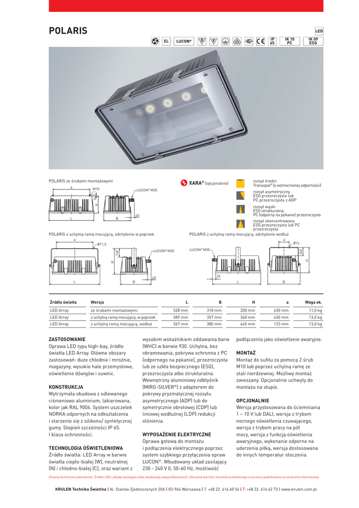 POLARIS LED D EL POLARIS ze śrubami montażowymi rozsył średni Transopal® (o wzmocnionej odporności) XARA® (opcjonalnie) M10 LUCON M20 ® rozsył asymetryczny ESG przezroczysta lub PC przezroczysta z ADP H 14 L rozsył wąski ESG strukturalna, PC (odporny na pękanie) przezroczysta rozsył skoncentrowany ESG przezroczysta lub PC przezroczysta POLARIS z uchylną ramą mocującą, odchylenie wzdłuż 40 B POLARIS z uchylną ramą mocującą, odchylenie w poprzek a Ø11,5 Ø14 LUCON® M20 LUCON® M20 H H 140 a F L Źródło światła IK 09 ESG 245 a IK 10 PC IP 65 39 40 B Wersja L B L B H a Waga ok. LED Array ze śrubami montażowymi 528 mm 318 mm 200 mm 430 mm 11,0 kg LED Array z uchylną ramą mocującą, w poprzek 589 mm 357 mm 340 mm 430 mm 13,0 kg LED Array z uchylną ramą mocującą, wzdłuż 567 mm 380 mm 445 mm 123 mm 13,0 kg ZASTOSOWANIE Oprawa LED typu high-bay, źródło światła LED Array. Główne obszary zastosowań: duże chłodnie i mroźnie, magazyny, wysokie hale przemysłowe, oświetlenie dźwigów i suwnic. KONSTRUKCJA Wytrzymała obudowa z odlewanego ciśnieniowo aluminium, lakierowana, kolor jak RAL 9006. System uszczelek NORKA odpornych na odkształcenia i starzenie się z silikonu/ syntetycznej gumy. Stopień szczelności IP 65. I klasa ochronności. TECHNOLOGIA OŚWIETLENIOWA Źródło światła: LED Array w barwie światła ciepło-białej (W), neutralnej (N) i chłodno-białej (C), oraz wariant z wysokim wskaźnikiem oddawania barw (WHC) w barwie 930. Uchylna, bez obramowania, pokrywa ochronna z PC (odpornego na pękanie), przezroczysta lub ze szkła bezpiecznego (ESG), przezroczysta albo strukturalna. Wewnętrzny aluminiowy odbłyśnik (MIRO-SILVER®) z adapterem do pokrywy pryzmatycznej rozsyłu asymetrycznego (ADP) lub do symetrycznie obrotowej (CDP) lub liniowej wzdłużnej (LDP) redukcji olśnienia. WYPOSAŻENIE ELEKTRYCZNE Oprawa gotowa do montażu i podłączenia elektrycznego poprzez system szybkiego przyłączenia opraw LUCON®. Wbudowany układ zasilający 230 - 240 V 0, 50-60 Hz, możliwość podłączenia jako oświetlenie awaryjne. MONTAŻ Montaż do sufitu za pomocą 2 śrub M10 lub poprzez uchylną ramę ze stali nierdzewnej. Możliwy montaż zwieszany. Opcjonalnie uchwyty do montażu na słupie. OPCJONALNIE Wersja przystosowana do ściemniania 1 – 10 V lub DALI, wersja z trybem nocnego oświetlenia czuwającego, wersja z trybem pracy na pół mocy, wersja z funkcją oświetlenia awaryjnego, wykonanie odporne na uderzenia piłką, wersja dostosowana do innych temperatur otoczenia. Zmiany techniczne zastrzeżone. Źródła LED i układy zasilające stale zwiększają swoją efektywność. Aktualne wartości strumienia świetlnego oraz moce publikowane są na stronie internetowej. KRULEN Technika Świetlna | Al. Stanów Zjednoczonych 20A | 03-964 Warszawa | T. +48 22. 616 60 54 | T. +48 22. 616 62 73 | www.krulen.com.pl POLARIS Wersja Temperatura barwowa/K Strumień świetlny*/lm Moc systemu**/W Temperatura otoczenia Kod produktu 186W 830/3000 15440 115 -35°C do +45°C 988 187 03 AB 248W 830/3000 19900 162 -35°C do +40°C 988 248 03 AB 186N 840/4000 16110 115 -35°C do +45°C 988 187 04 AB 248N 840/4000 20820 162 -35°C do +40°C 988 248 04 AB 186C 750/5000 18250 115 -35°C do +45°C 988 187 05 AB 248C 750/5000 23520 162 -35°C do +40°C 988 248 05 AB Wysoki CRI 186WHC 930/3000 12700 115 -35°C do +45°C 988 187 01 AB 248WHC 930/3000 16350 162 -35°C do +40°C 988 248 01 AB * ** wartość strumienia świetlnego w TC 55°C wartości przybliżone Składając zamówienie litery należy zastąpić cyframi wg poniższych oznaczeń Pokrywa ochronna / A Montaż / B 4 = PC (odporny na pękanie) przezroczysta 6 = szkło bezpieczne (ESG) przezroczysta 7 = szkło bezpieczne (ESG) strukturalna 1 = do sufitu poprzez śruby 2 x M10 2 = uchylna rama mocująca, odchylenie wzdłuż 3 = uchylna rama mocująca, odchylenie w poprzek 6 = przystosowana do montażu zwieszanego POLARIS AKCESORIA Wersja Kod produktu Pokrywa ADP, asymetryczna redukcja olśnienia (rozsył asymetryczny) 988 501 Pokrywa CDP, symetrycznie obrotowa redukcja olśnienia 988 502 Pokrywa LDP, liniowa wzdłużna redukcja olśnienia 988 503 Pokrywa z PMMA Transopal®, rozsył średni 988 504 Uchwyt do montażu oprawy w bliskiej odległości od sufitu (para) 982 109 Uchwyt do montażu sufitowego oprawy w wersji odpornej na uderzenia piłką (para) 982 110 Adapter do montażu oprawy z ramą uchylną na słupie Ø 70 – 89 mm 982 125 Adapter do montażu oprawy z ramą uchylną na słupie Ø 89 – 108 mm 982 126 Klosz przykrywający z ramą 982 103 Adapter z możliwością nachylenia i blokady 8° - 53°, do montażu na słupie od Ø 76 mm 982 128 POLARIS OPCJONALNIE Wersja Układ zasilający DALI Układ zasilający z możliwością ściemniania 1-10 V Kod produktu 100 502 100 501 Wykonanie odporne na uderzenia piłką z uchwytem mocującym do sufitu (para) Na życzenie Wykonanie odporne na uderzenia piłką z uchwytem mocującym z blokadą Na życzenie Wykonanie w kolorze RAL Na życzenie Wersja z trybem nocnego oświetlenia czuwającego Na życzenie Wersja z trybem pracy na pół mocy Na życzenie Funkcja oświetlenia awaryjnego w trybie pracy ciągłej, z bezhalogenowym przewodem przyłączeniowym (2 m), 2 x 3 x 1,5 mm² Na życzenie Wykonanie odporne na inne temperatury otoczenia Na życzenie LUCON® - system szybkiego przyłączenia oprawy, dodatkowy Wykonanie odporne na wodę chlorowaną 100 111 Na życzenie Powłoka ochronna PC 988 010 XARA®-DMSI.12-I-DALI = XARA® sensor światła i ruchu, praca w temperaturze otoczenia do -40°C (od III kwartału 2016) 100 303 KRULEN Technika Świetlna | Al. Stanów Zjednoczonych 20A | 03-964 Warszawa | T. +48 22. 616 60 54 | T. +48 22. 616 62 73 | www.krulen.com.pl H POLARIS AKCESORIA Ø 76 SW17 43 L B > POLARIS z adapterem do słupa Ø 76 mm z możliwością nachylenia i blokady 8°- 53° adapter kod produktu 982 128 a H 14 M10 L B 40 > Adapter do r
