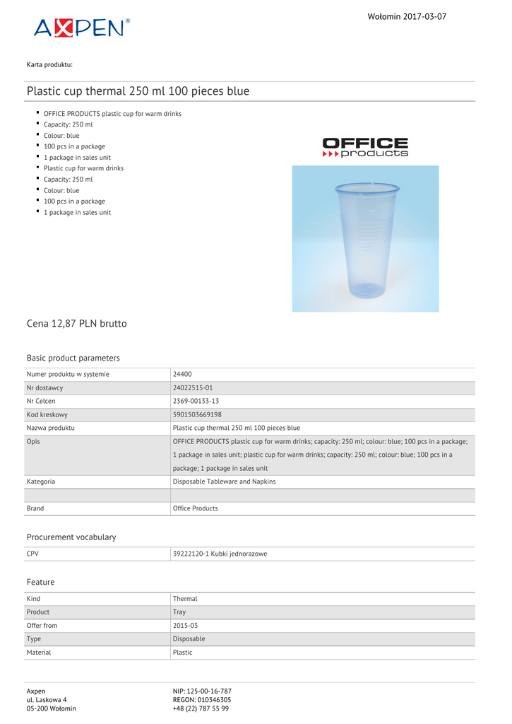 Wołomin 2017-03-07 Karta produktu: Plastic cup thermal 250 ml 100 pieces blue OFFICE PRODUCTS plastic cup for warm drinks Capacity: 250 ml Colour: blue 100 pcs in a package 1 package in sales unit Plastic cup for warm drinks Capacity: 250 ml Colour: blue 100 pcs in a package 1 package in sales unit Cena 12,87 PLN brutto Basic product parameters Numer produktu w systemie 24400 Nr dostawcy 24022515-01 Nr Celcen 2369-00133-13 Kod kreskowy 5901503669198 Nazwa produktu Plastic cup thermal 250 ml 100 pieces blue Opis OFFICE PRODUCTS plastic cup for warm drinks; capacity: 250 ml; colour: blue; 100 pcs in a package; 1 package in sales unit; plastic cup for warm drinks; capacity: 250 ml; colour: blue; 100 pcs in a package; 1 package in sales unit Kategoria Disposable Tableware and Napkins Brand Office Products Procurement vocabulary CPV 39222120-1 Kubki jednorazowe Feature Kind Thermal Product Tray Offer from 2015-03 Type Disposable Material Plastic Axpen ul. Laskowa 4 05-200 Wołomin NIP: 125-00-16-787 REGON: 010346305 +48 (22) 787 55 99 Wołomin 2017-03-07 Karta katalogowa produktu cd. Plastic cup thermal 250 ml 100 pieces blue Dimensions Capacity (ml) 250 Certifications Hit Hit New product Standard Colour Colour Transparent blue Serdecznie zapraszamy do współpracy Axpen zespół. Axpen ul. Laskowa 4 05-200 Wołomin NIP: 125-00-16-787 REGON: 010346305 +48 (22) 787 55 99