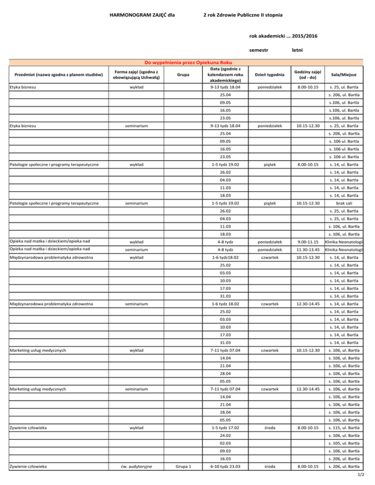 HARMONOGRAM ZAJĘĆ dla 2 rok Zdrowie Publiczne II stopnia rok akademicki …………………………………………….. 2015/2016 semestr letni Do wypełnienia przez Opiekuna Roku Przedmiot (nazwa zgodna z planem studiów) Etyka biznesu Etyka biznesu Patologie społeczne i programy terapeutyczne Forma zajęć (zgodna z obowiązującą Uchwałą) Grupa wykład seminarium Data (zgodnie z kalendarzem roku akademickiego) Dzień tygodnia Godziny zajęć (od - do) 9-13 tydz 18.04 poniedziałek 8.00-10.15 s. 206, ul. Bartla 09.05 s.106, ul. Bartla 16.05 s.106, ul. Bartla 23.05 s.106, ul. Bartla poniedziałek 10.15-12.30 s. 206, ul. Bartla 09.05 s. 106 ul. Bartla 16.05 s. 106 ul. Bartla 23.05 s. 106 ul. Bartla 1-5 tydz 19.02 seminarium piątek 8.00-10.15 s. 14, ul. Bartla 04.03 s. 14, ul. Bartla 11.03 s. 14, ul. Bartla 1-5 tydz 19.02 s. 14, ul. Bartla piątek 10.15-12.30 dzieckiem w szkole Międzynarodowa problematyka zdrowotna s. 25, ul. Bartla s. 25, ul. Bartla 11.03 s. 106, ul. Bartla s. 106, ul. Bartla 4-8 tydz poniedziałek 9.00-11.15 Klinika Neonatologii seminarium 4-8 tydz poniedziałek 11.30-13.45 Klinika Neonatologii wykład 1-6 tydz18.02 czwartek 10.15-12.30 s. 14, ul. Bartla 25.02 s. 14, ul. Bartla 03.03 s. 14, ul. Bartla 10.03 s. 14, ul. Bartla 17.03 s. 14, ul. Bartla s. 14, ul. Bartla 31.03 Międzynarodowa problematyka zdrowotna seminarium 1-6 tydz 18.02 czwartek 12.30-14.45 wykład s. 14, ul. Bartla 03.03 s. 14, ul. Bartla 10.03 s. 14, ul. Bartla 17.03 s. 14, ul. Bartla 7-11 tydz 07.04 s. 14, ul. Bartla czwartek 10.15-12.30 Żywienie człowieka Żywienie człowieka seminarium s. 106, ul. Bartla 21.04 s. 106, ul. Bartla 28.04 s. 106, ul. Bartla 7-11 tydz 07.04 wykład ćw. audytoryjne s. 106, ul. Bartla czwartek 12.30-14.45 s. 106, ul. Bartla 14.04 s. 106, ul. Bartla 21.04 s. 106, ul. Bartla 28.04 s. 106, ul. Bartla 05.05 s. 106, ul. Bartla 1-5 tydz 17.02 Grupa 1 s. 106, ul. Bartla 14.04 05.05 Marketing usług medycznych s. 14, ul. Bartla 25.02 31.03 Marketing usług medycznych brak sali 04.03 18.03 wykład s. 14, ul. Bartla 26.02 26.02 Opieka nad matka i dzieckiem/opieka nad dzieckiem szkolei dzieckiem/opieka nad Opieka nadwmatka s. 25, ul. Bartla 25.04 18.03 Patologie społeczne i programy terapeutyczne s. 25, ul. Bartla 25.04 9-13 tydz 18.04 wykład Sala/Miejsce środa 8.00-10.15 s. 115, ul. Bartla 24.02 s. 106, ul. Bartla 02.03 s. 105, ul. Bartla 09.03 s. 106, ul. Bartla 16.03 s. 206, ul. Bartla 6-10 tydz 23.03 środa 8.00-10.15 s. 206, ul. Bartla 1/2 HARMONOGRAM ZAJĘĆ dla 2 rok Zdrowie Publiczne II stopnia rok akademicki …………………………………………….. 2015/2016 semestr letni Do wypełnienia przez Opiekuna Roku Przedmiot (nazwa zgodna z planem studiów) Forma zajęć (zgodna z obowiązującą Uchwałą) Grupa Data (zgodnie z kalendarzem roku akademickiego) Dzień tygodnia Godziny zajęć (od - do) 06.04 s. 202, ul. Bartla 13.04 s. 202, ul. Bartla 20.04 s. 202, ul. Bartla s. 202, ul. Bartla 27.04 Żywienie człowieka ćw. audytoryjne Grupa 2 1-5 tydz 17.02 środa 10.15-12.30 02.03 s. 20, ul. Bartla 09.03 s. 106, ul. Bartla s. 206, ul. Bartla 16.03 seminarium 1-5 tydz 17.02 środa 12.30-14.00 wykład Media w zdrowiu publicznym/PR w ochronie zdrowia seminarium s. 206, ul. Bartla 02.03 s. 206, ul. Bartla 09.03 s. 206, ul. Bartla 12-14 tydz 12.05 s. 206, ul. Bartla czwartek 10.15-12.45 12-15 tydz 12.05 s. 25, ul. Bartla s. 25, ul. Bartla 19.05 s. 25, ul. Bartla 02.06 Media w zdrowiu publicznym/PR w ochronie zdrowia Język obcy s. 206, ul. Bartla 24.02 16.03 Media w zdrowiu publicznym/PR w ochronie zdrowia s. 20, ul. Bartla s. 20, ul. Bartla 24.02 Żywienie człowieka Sala/Miejsce czwartek 12.45-15.00 s. 25, ul. Bartla 19.05 s. 25, ul. Bartla 02.06 s. 25, ul. Bartla 09.06 s. 25, ul. Bartla seminarium 13 tydz 20.05 piątek 8.30-10.45 lektorat 1-15 tydz czwartek 8.30-10.00 s. 25, ul. Bartla 2/2