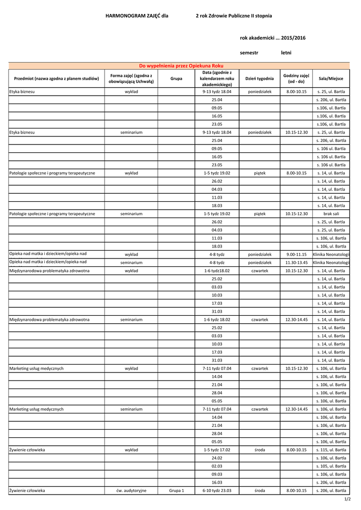 HARMONOGRAM ZAJĘĆ dla 2 rok Zdrowie Publiczne II stopnia rok