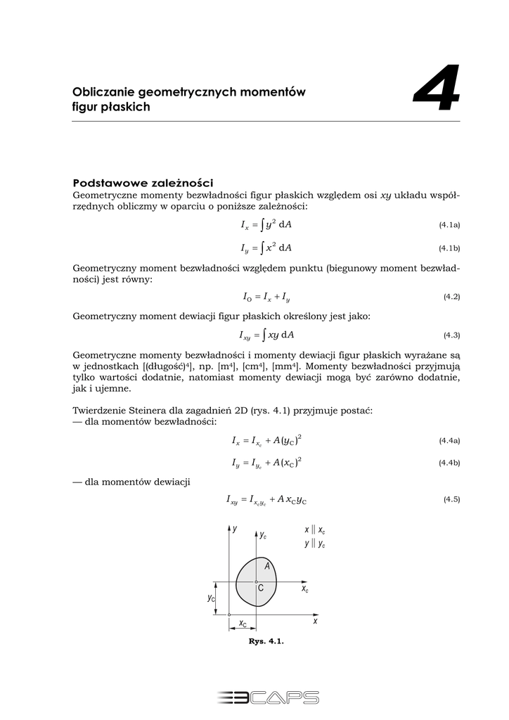 Obliczanie geometrycznych momentów figur płaskich 4 Podstawowe zależności Geometryczne momenty bezwładności figur płaskich względem osi xy układu współrzędnych obliczmy w oparciu o poniższe zależności: I x = ∫ y 2 dA (4.1a) I y = ∫ x 2 dA (4.1b) Geometryczny moment bezwładności względem punktu (biegunowy moment bezwładności) jest równy: IO = Ix + Iy (4.2) Geometryczny moment dewiacji figur płaskich określony jest jako: I xy = ∫ xy dA (4.3) Geometryczne momenty bezwładności i momenty dewiacji figur płaskich wyrażane są w jednostkach [(długość)4], np. [m4], [cm4], [mm4]. Momenty bezwładności przyjmują tylko wartości dodatnie, natomiast momenty dewiacji mogą być zarówno dodatnie, jak i ujemne. Twierdzenie Steinera dla zagadnień 2D (rys. 4.1) przyjmuje postać: — dla momentów bezwładności: I x = I xc + A (y C )2 (4.4a) I y = I yc + A (x C )2 (4.4b) — dla momentów dewiacji I xy = I xc yc + A x Cy C Rys. 4.1. (4.5) 2 Dynamika Zadanie 4.1. Wyprowadzić ogólny wzór na położenie środka ciężkości wycinka koła o promieniu R i kącie rozwarcia 2φ (rys. 4.2). Rys. 4.2. Rozwiązanie Wprowadzamy układ współrzędnych jak na rys. 4.3. Rys. 4.3. Wybieramy wycinek o kącie rozwarcia dβ (rys. 4.3). Zakładając, że wycinek ten jest bardzo mały, możemy potraktować go jako trójkąt o długości podstawy dl równej: d l = R dβ i wysokości R. Położenie środka ciężkości określa współrzędna ydl równa: y dl = 2 R cos β 3 Położenie środka ciężkości możemy zapisać następująco: yC = ∑ Ai yi ∑ Ai gdzie Ai oznacza pole i-tego wycinka, natomiast yi – położenie jego środka ciężkości. Powyższa zależność przyjmie postać: ⎛1 ⎞ ⎛R ⎞ ∑ ⎜⎝ 2 dl R ⎟⎠ ⋅ y dl ∫ ⎜⎝ 2 ⎟⎠ y dl dl = = yC = ⎛1 ⎞ ⎛R ⎞ ∑ ⎜⎝ 2 dl R ⎟⎠ ∫ ⎜⎝ 2 ⎟⎠ dl = +φ ⎛R 2 ⎞ ∫ ⎜⎝ 2 ⋅ 3 R cos β ⎟⎠ R dβ −φ +φ ⎛ R2 ⎞ ⎟ dβ ⎟ 2 ⎠ −φ ∫ ⎜⎜⎝ R3 +φ sin β −φ = 3 2 = R +φ β −φ 2 2 sin φ − sin(−φ ) 2 sin φ R = R φ − (−φ ) φ 3 3 Dla wybranych wycinków koła (np. półkola, ćwiartki), do wyznaczenia środków ciężkości można stosować drugie twierdzenie Pappusa-Guldina, które mówi, że objętość bryły powstałej na skutek obrotu powierzchni płaskiej wokół osi leżącej w tej samej płaszczyźnie co powierzchnia i nie przecinającej jej, jest równe iloczynowi pola powierzchni i drogi jaką przebywa podczas obrotu środek ciężkości tej powierzchni. Obliczanie geometrycznych momentów figur płaskich 3 W dalszej części znajdziemy środek ciężkości półkola o promieniu R (rys. 4.4). Rys. 4.4. Pole powierzchni półkola A jest równe: A= π R2 2 W wyniku pełnego obrotu półokręgu wokół osi y (rys. 4.4) otrzymamy kulę o objętości V równej: V = 4 π R3 3 Droga s jaką przebywa środek ciężkości C jest równa (rys. 4.4): s = 2π x C Zgodnie z drugim twierdzeniem Pappusa-Guldina mamy: A ⋅s =V 2 πR 4 ⋅ 2π x C = π R 3 2 3 4 xC = R 3π W oparciu o wyprowadzony wcześniej wzór ogólny mamy: 2 xC = R 3 ⎛π ⎞ sin⎜ ⎟ ⎝2⎠ = 4 R π 3π 2 Zadanie 4.2. Obliczyć główne centralne momenty bezwładności figury przedstawionej na rys. 4.5. Wymiary podano w [mm]. Rozwiązanie Obieramy układ współrzędnych jak na rys. 4.6. Rozpatrywaną figurę podzielimy na dwa prostokąty oznaczone odpowiednio 1 (prostokąt pionowy o wymiarach 4×60 mm) i 2 (prostokąt poziomy o wymiarach 36×4 mm). 4 Dynamika Rys. 4.5. Rys. 4.6. Wyznaczamy położenie środka ciężkości figury, w oparciu o poniższe zależności: xC = ∑ Ai x i ∑ Ai = A1 x1 + A2 x 2 A1 + A2 yC = ∑ Ai yi ∑ Ai = A1 y1 + A2 y 2 A1 + A2 gdzie Ai jest polem powierzchni i-tej figury, natomiast xi i yi są współrzędnymi środka ciężkości i-tej figury. Zgodnie z rys. 4.6 mamy: — dla prostokąta 1 A1 = 4 ⋅ 60 = 240 mm2 x1 = 2 mm y1 = 30 mm — dla prostokąta 2 A2 = 36 ⋅ 4 = 144 mm2 x 2 = 22 mm y 2 = 2 mm Współrzędne środka ciężkości całej figury są więc równe: xC = 240 ⋅ 2 + 144 ⋅ 22 = 9,5 mm 240 + 144 yC = 240 ⋅ 30 + 144 ⋅ 2 = 19,5 mm 240 + 144 Obliczanie geometrycznych momentów figur płaskich 5 Przystąpimy teraz do obliczenia momentów bezwładności poszczególnych prostokątów względem osi xc i yc układu współrzędnych o środku w punkcie C (rys. 4.7). Osie te są osiami centralnymi całej rozpatrywanej figury. Wykorzystujemy twierdzenie Steinera: — dla prostokąta 1 I xc 1 = I x1 + A1(y1 − y C )2 = 4 ⋅ 60 3 + 240 ⋅ (30 − 19,5)2 = 98460 mm4 12 I yc 1 = I y1 + A1(x1 − x C )2 = 43 ⋅ 60 + 240 ⋅ (2 − 9,5)2 = 13820 mm4 12 — dla prostokąta 2 I xc 2 = I x 2 + A2 (y 2 − y C )2 = 36 ⋅ 43 + 144 ⋅ (2 − 19,5)2 = 44292 mm4 12 I yc 2 = I y 2 + A2 (x 2 − x C )2 = 363 ⋅ 4 + 240 ⋅ (22 − 9,5)2 = 38052 mm4 12 Rys. 4.7. Ostatecznie centralne momenty bezwładności rozpatrywanej figury są równe: I xc = I xc 1 + I xc 2 = 98460 + 44292 = 142752 mm4 I yc = I yc 1 + I yc 2 = 13820 + 38052 = 51872 mm4 Aby określić główne centralne momenty bezwładności rozpatrywanej figury należy znaleźć główne osie bezwładności, czyli takie, dla których moment dewiacji figury będzie równy zeru. Wzory transformujące momenty bezwładności i dewiacji względem centralnego układu współrzędnych do układu obróconego o kąt φ (rys. 4.8) są następujące: I ξ = I xc cos 2 φ + I yc sin2 φ − I xc yc sin 2φ I η = I xc sin2 φ + I yc cos 2 φ + I xc yc sin 2φ I ξη = 1 (I x − I yc ) sin 2φ + I xc yc cos 2φ 2 c Moment dewiacji względem osi głównych jest równy zeru. Tak więc przekształcając ostatni z powyższych wzorów otrzymamy kąt φ, o który należy obrócić układ osi xc i yc, aby uzyskać zerowe momenty dewiacji. 6 Dynamika Rys. 4.8. 1 (I x − I yc )sin 2φ + I xc yc cos 2φ = 0 2 c 1 (I y − I xc )sin 2φ = I xc yc cos 2φ 2 c tg 2φ = 2 I x c yc I yc − I x c Musimy jeszcze po
