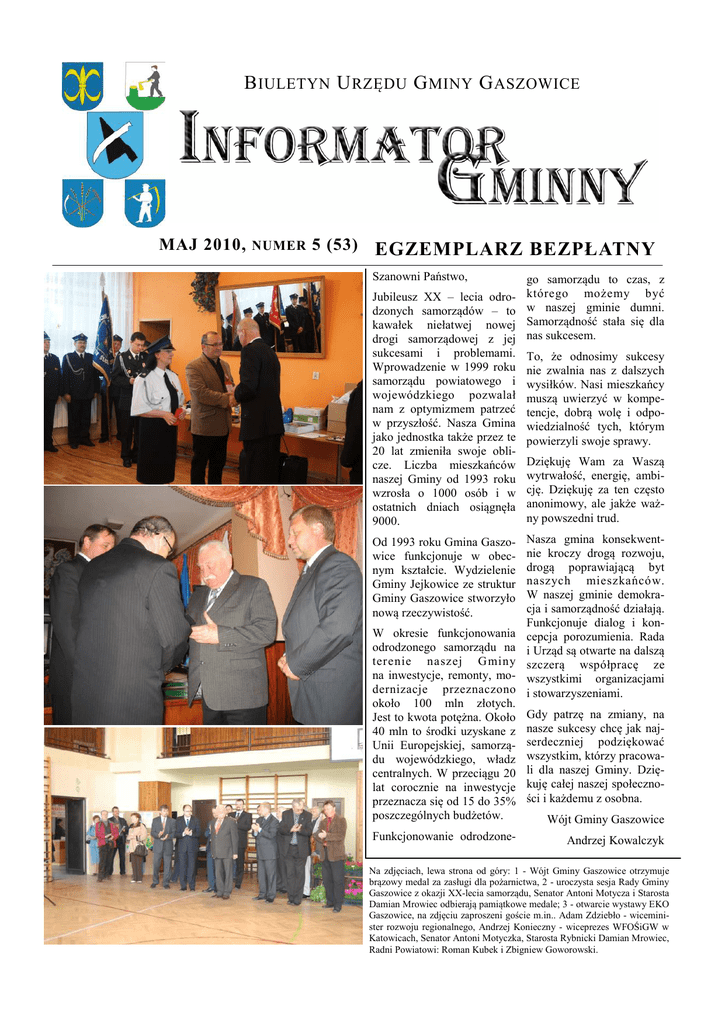 B IULETYN U RZĘDU G MINY G ASZOWICE MAJ 2010, UMER 5 (53) EGZEMPLARZ BEZPŁATY Szanowni Państwo, Jubileusz XX – lecia odrodzonych samorządów – to kawałek niełatwej nowej drogi samorządowej z jej sukcesami i problemami. Wprowadzenie w 1999 roku samorządu powiatowego i wojewódzkiego pozwalał nam z optymizmem patrzeć w przyszłość. Nasza Gmina jako jednostka także przez te 20 lat zmieniła swoje oblicze. Liczba mieszkańców naszej Gminy od 1993 roku wzrosła o 1000 osób i w ostatnich dniach osiągnęła 9000. Od 1993 roku Gmina Gaszowice funkcjonuje w obecnym kształcie. Wydzielenie Gminy Jejkowice ze struktur Gminy Gaszowice stworzyło nową rzeczywistość. W okresie funkcjonowania odrodzonego samorządu na terenie naszej Gminy na inwestycje, remonty, modernizacje przeznaczono około 100 mln złotych. Jest to kwota potężna. Około 40 mln to środki uzyskane z Unii Europejskiej, samorządu wojewódzkiego, władz centralnych. W przeciągu 20 lat corocznie na inwestycje przeznacza się od 15 do 35% poszczególnych budżetów. Funkcjonowanie odrodzone- go samorządu to czas, z którego możemy być w naszej gminie dumni. Samorządność stała się dla nas sukcesem. To, że odnosimy sukcesy nie zwalnia nas z dalszych wysiłków. Nasi mieszkańcy muszą uwierzyć w kompetencje, dobrą wolę i odpowiedzialność tych, którym powierzyli swoje sprawy. Dziękuję Wam za Waszą wytrwałość, energię, ambicję. Dziękuję za ten często anonimowy, ale jakże ważny powszedni trud. Nasza gmina konsekwentnie kroczy drogą rozwoju, drogą poprawiającą byt naszych mieszkańców. W naszej gminie demokracja i samorządność działają. Funkcjonuje dialog i koncepcja porozumienia. Rada i Urząd są otwarte na dalszą szczerą współpracę ze wszystkimi organizacjami i stowarzyszeniami. Gdy patrzę na zmiany, na nasze sukcesy chcę jak najserdeczniej podziękować wszystkim, którzy pracowali dla naszej Gminy. Dziękuję całej naszej społeczności i każdemu z osobna. Wójt Gminy Gaszowice Andrzej Kowalczyk Na zdjęciach, lewa strona od góry: 1 - Wójt Gminy Gaszowice otrzymuje brązowy medal za zasługi dla pożarnictwa, 2 - uroczysta sesja Rady Gminy Gaszowice z okazji XX-lecia samorządu, Senator Antoni Motycza i Starosta Damian Mrowiec odbierają pamiątkowe medale; 3 - otwarcie wystawy EKO Gaszowice, na zdjęciu zaproszeni goście m.in.. Adam Zdziebło - wiceminister rozwoju regionalnego, Andrzej Konieczny - wiceprezes WFOŚiGW w Katowicach, Senator Antoni Motyczka, Starosta Rybnicki Damian Mrowiec, Radni Powiatowi: Roman Kubek i Zbigniew Goworowski. S TR . 2 MAJ 2010, I GMIY TURIEJ SOŁECKI Zapraszamy do udziału w pierwszym turnieju sołeckim Gminy Gaszowice, który odbędzie się 13 czerwca 2010 r. na terenie rekreacyjnym przy OSP w Łukowie Śląskim. Początek godzina 14.00 NUMER 5 (53) SKORZYSTAJ Z DOTACJI DO 30 CZERWCA 2010 R. OSTATIE WOLE MIEJSCA Urząd Gminy Gaszowice oraz Wojewódzki Fundusz Ochrony Środowiska w Katowicach informują o możliwości skorzystania z dotacji na zakup i montaż ekologicznego kotła węglowego w wysokości 4.934,88 zł. O dotację do kotłów węglowych z automatycznym podajnikiem (retortowy lub tłokowy) opalanych MIAŁEM lub EKOGROSZKIEM można ubiegać się po złożeniu stosownego wniosku. Drużyny reprezentujące poszczególne wsie rywalizować będą Wzory wniosków dostępne w Referacie Ochrony Środowiw następujących konkurencjach: ska, Rozwoju Gminy, Gminnym Centrum Informacji (pokój plażowa piłka siatkowa, przeciąga- nr 03) oraz na stronie internetowej www.gaszowice.pl. nie liny, skrobanie ziemniaków, wbijanie gwoź- Informacje na ten temat można uzyskać pod numerem telefodzi, sztafeta rodzinna, rzut piłką do kosza, przeci- nu 032 43 27 144. Serdecznie zapraszamy. nanie drewnianego klocka, paintball, hydronetka. Szczegółowych udzielają sołtysi. informacji Serdecznie zapraszamy do wspólnej zabawy. DODATKOWE ELEMETY SKATE PARKU W GASZOWICACH Gaszowicki skate park wzbogacił się o nowe elementy t.j. half pipe z bank rampem, launch ramp z poręczą a także dodatkową poręcz. Elementy zostały wybrane po konsultacjach z młodzieżą użytkującą skate park. Zapraszamy miłośników sportów ekstremalnych do korzystania ze skate parku, który znajduje się na terenie byłych kortów tenisowych GCI za budynkiem OKiS-u w Gaszowicach. ZGŁOSZEIE EKSPLOATACJI PRZYDOMOWEJ OCZYSZCZALI ŚCIEKÓW Informujemy użytkowników indywidualnych przydomowych oczyszczalni ścieków o obowiązku zgłoszenia do eksploatacji tychże instalacji. Wzory druków zgłoszeniowych można otrzymać w Referacie Ochrony Środowiska tutejszeReferat Ochrony Środ. go Urzędu Gminy. Ośrodek Kultury i Sportu w Gaszowicach organizuje w dniu 26 czerwca 2010 r. WYCIECZKĘ DO SADOMIERZA W programie wycieczki: zwiedzanie Sandomierza śladami ojca Mateusza, zwiedzanie Zamku w Baranowie Sandomierskim, pobyt w europejskiej stolicy bajki – Pacanowie. Wyjazd godz. 500 z parkingu przy OKiSie Koszt: 50 zł od osoby Zapisy w kawiarni Ośrodka Kultury ZAPRASZAMY WSZYSTKICH CHĘTNYCH PODSUMOWAIE EKO WYSTAWY Wystawa EKO Gaszowice, pierwsza w historii naszej Gminy, to dowód na to, że leży nam na sercu poprawa jakości życia mieszkańców naszej Gminy. Program ograniczenia niskiej emisji, program budowy sieci kanalizacyjnej oraz budowa przydomowych oczyszczalni ścieków to namacalne dowody naszej troski o poprawę warunków środowiskowych. W ostatnich 10 latach wybudowaliśmy wspólnie z sąsiednią gminą małą oczyszczalnię ścieków, korzysta z niej już około 800 mieszkańców. Wspólnie z naszymi partnerami z Rybnika i Jejkowice wybudowaliśmy ponad 40 km sieci kanalizacyjnej, z której już w najbliższym czasie będzie mogło skorzystać kolejnych 3,5 tyś. mieszkańców. Te wszystkie działania to efekt bardzo dobrego wykorzystania pieniędzy pochodzących z UE – w ostatnich latach to ponad 30 mln PLN oraz bardzo dobrej współpracy z Zar