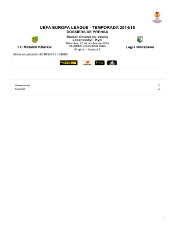 UEFA EUROPA LEAGUE - TEMPORADA 2014/15 DOSSIERS DE PRENSA Stadion Dinamo im. Valeriy Lobanovskyi - Kyiv FC Metalist Kharkiv Miércoles, 22 de octubre de 2014 18.00HEC (19.00 hora local) Grupo L - Jornada 3 Legia Warszawa Última actualización 20/10/2014 11:38HEC Alineaciones Leyenda 2 4 1 FC Metalist Kharkiv - Legia Warszawa Dossier de prensa Miércoles 22 octubre 2014 - 18.00CET (19.00 hora local) Stadion Dinamo im. Valeriy Lobanovskyi, Kyiv Alineaciones FC Metalist Kharkiv UEFA Europa League - Play-off (21/08/2014) Ruch Chorzów 0-0 FC Metalist Kharkiv FC Metalist Kharkiv: Shust, Villagra, Edmar, Cleiton Xavier, Torres (53 Krasnopyorov), Kulakov, Yussuf, Gueye, Osman, Jajá (64 Homenyuk), Rebenok (28/08/2014) FC Metalist Kharkiv 1-0 Ruch Chorzów (glob: 1-0) Goles: 1-0 Cleiton Xavier 105+1 (P) Pr. FC Metalist Kharkiv: Shust, Edmar, Cleiton Xavier, Homenyuk, Pshenychnykh, Kulakov, Yussuf, Gueye, Krasnopyorov, Jajá (62 Villagra), Rebenok (68 Radchenko) Fase de grupos Grupo L Club J G E P GF GC pts Legia Warszawa 2 2 0 0 2 0 6 KSC Lokeren OV 2 1 0 1 1 1 3 Trabzonspor AŞ 2 1 0 1 2 2 3 FC Metalist Kharkiv 2 0 0 2 1 3 0 Jornada 1 (18/09/2014) FC Metalist Kharkiv 1-2 Trabzonspor AŞ Goles: 0-1 Constant 25, 1-1 Homenyuk 61, 1-2 A. Papadopoulos 90+4 FC Metalist Kharkiv: Goryainov, Villagra, Torsiglieri, Bolbat (80 Radchenko), Cleiton Xavier (93 Kulakov), Homenyuk, Pshenychnykh, Gueye, Krasnopyorov, Jajá (82 Rebenok), Kobin Jornada 2 (02/10/2014) KSC Lokeren OV 1-0 FC Metalist Kharkiv Goles: 1-0 De Pauw 74 FC Metalist Kharkiv: Dišljenković, Villagra, Bolbat (68 Kulakov), Edmar, Cleiton Xavier, Homenyuk, Pshenychnykh (85 Berezovchuk), Yussuf, Gueye, Krasnopyorov, Kobin (61 Radchenko) Jornada 3 (22/10/2014) FC Metalist Kharkiv-Legia Warszawa Jornada 4 (06/11/2014) Legia Warszawa-FC Metalist Kharkiv Jornada 5 (27/11/2014) Trabzonspor AŞ-FC Metalist Kharkiv Jornada 6 (11/12/2014) FC Metalist Kharkiv-KSC Lokeren OV Legia Warszawa UEFA Champions League - Segunda fase de clasificación (16/07/2014) Legia Warszawa 1-1 Saint Patrick's Athletic FC Goles: 0-1 Fagan 38, 1-1 Radović 90+1 Legia Warszawa: Kuciak, Jodłowiec, Iñaki Astiz, Brzyski, Kosecki (77 Duda), Hélio Pinto (66 Vrdoljak), Rzeźniczak, Broź, Radović, Żyro, Orlando Sá (16 Saganowski) (23/07/2014) 2 FC Metalist Kharkiv - Legia Warszawa Dossier de prensa Miércoles 22 octubre 2014 - 18.00CET (19.00 hora local) Stadion Dinamo im. Valeriy Lobanovskyi, Kyiv Saint Patrick's Athletic FC 0-5 Legia Warszawa (glob: 1-6) Goles: 0-1 Radović 25, 0-2 Żyro 69, 0-3 Radović 82, 0-4 Saganowski 87, 0-5 Byrne 90+2 (p.p.) Legia Warszawa: Kuciak, Jodłowiec, Duda (84 Saganowski), Iñaki Astiz, Brzyski, Kucharczyk (85 Kosecki), Vrdoljak, Rzeźniczak, Broź, Radović (88 Piech), Żyro Tercera fase de clasificación (30/07/2014) Legia Warszawa 4-1 Celtic FC Goles: 0-1 C. McGregor 8, 1-1 Radović 10, 2-1 Radović 36, 3-1 Żyro 84, 4-1 Kosecki 90+1 Legia Warszawa: Kuciak, Jodłowiec, Duda, Iñaki Astiz, Brzyski, Kucharczyk (75 Kosecki), Vrdoljak, Rzeźniczak, Broź, Radović, Żyro (88 Saganowski) (06/08/2014) Celtic FC 3-0 Legia Warszawa (glob: 4-4) Goles: 0-1 Żyro 36, 0-2 Kucharczyk 61 Legia Warszawa: Kuciak, Jodłowiec, Duda (86 Hélio Pinto), Iñaki Astiz, Brzyski, Kucharczyk (74 Kosecki), Vrdoljak, Rzeźniczak, Broź, Radović, Żyro (86 Bereszyński) UEFA Europa League - Play-off (21/08/2014) FC Aktobe 0-1 Legia Warszawa Goles: 0-1 Duda 48 Legia Warszawa: Kuciak, Dossa Júnior, Jodłowiec, Duda, Brzyski, Kucharczyk, Vrdoljak, Rzeźniczak, Broź, Radović, Żyro (28/08/2014) Legia Warszawa 2-0 FC Aktobe (glob: 3-0) Goles: 1-0 Kucharczyk 26, 2-0 Vrdoljak 66 (P) Legia Warszawa: Kuciak, Dossa Júnior, Jodłowiec, Duda (88 Saganowski), Brzyski, Kucharczyk (66 Kosecki), Vrdoljak, Rzeźniczak, Broź, Radović, Żyro Fase de grupos Jornada 1 (18/09/2014) Legia Warszawa 1-0 KSC Lokeren OV Goles: 1-0 Radović 58 Legia Warszawa: Kuciak, Dossa Júnior, Jodłowiec, Duda (92 Saganowski), Brzyski, Kucharczyk, Vrdoljak, Rzeźniczak, Broź, Radović, Żyro Jornada 2 (02/10/2014) Trabzonspor AŞ 0-1 Legia Warszawa Goles: 0-1 Kucharczyk 16 Legia Warszawa: Kuciak, Dossa Júnior, Jodłowiec, Duda, Brzyski, Kucharczyk (95 Kosecki), Vrdoljak, Rzeźniczak, Broź, Radović (91 Saganowski), Żyro Jornada 3 (22/10/2014) FC Metalist Kharkiv-Legia Warszawa Jornada 4 (06/11/2014) Legia Warszawa-FC Metalist Kharkiv Jornada 5 (27/11/2014) KSC Lokeren OV-Legia Warszawa Jornada 6 (11/12/2014) Legia Warszawa-Trabzonspor AŞ 3 FC Metalist Kharkiv - Legia Warszawa Dossier de prensa Miércoles 22 octubre 2014 - 18.00CET (19.00 hora local) Stadion Dinamo im. Valeriy Lobanovskyi, Kyiv Leyenda Competiciones Competiciones de clubes Competiciones de selecciones UCL: UEFA Champions League ECCC: Copa de Europa UEL: UEFA Europa League UCUP: Copa de la UEFA UCWC: Recopa de la UEFA SCUP: Supercopa de la UEFA UIC: Copa Intertoto de la UEFA ICF: Copa de Ferias EURO: Campeonato de Europa de Fútbol de la UEFA Mundial: Copa Mundial de la FIFA CONFCUP: Copa Confederaciones de la FIFA Amistosos: Partidos amistosos Amistosos U21: Amistosos Internacionales Sub-21 U21: Campeonato de Europa Sub-21 de la UEFA U17: Campeonato de Europa sub-17 U16: Campeonato de Europa Sub-16 de la UEFA U19: Campeonato de Europa sub-19 U18: Campeonato de Europa Sub-18 de la UEFA WWC: Copa Mundial Femenina de la FIFA EUROF: Campeonato de Europa femenino de la UEFA Fases de la competición Otras abreviaturas F: Final 1ª FG: Primera fase de grupos 3ª FC: Tercera fase de clasificación 3ªR: Tercera ronda Prelim.: Ronda preliminar 1/4: Cuartos de final Previa: Ronda previa RC1: Primera ronda de clasificación FG: Fase de grupos (t.p.): Tras prórroga 2ª FG: Segunda fase de N°: Número grupos gd: Partido resuelto por los 1ªR: Primera ronda goles a domicilio 2ªR: Segunda ronda J: Partidos jugados 1/8: Octavos de final Pos.: Posición 1/2: Semifinales pts: Puntos R16: Octavos de final R: Expulsión (tarjeta roja) R32: Diec