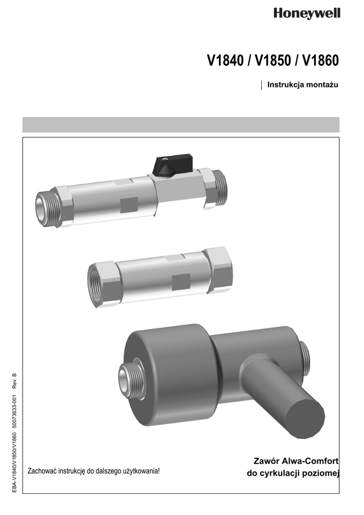 V1840 / V1850 / V1860 EBA-V1840/V1850/V1860 50073633-001 Rev. B Einbauanleitung Instrukcja montażu Anleitung zum späteren Gebrauch aufbewahren! Zachować instrukcję do dalszego użytkowania! Zawór Alwa-Comfort do cyrkulacji poziomej 1. Uwagi dot. bezpieczeństwa 3. Oznaczenia katalogowe Alwa-Comfort - montaż naścienny 1. Postępować wełu niniejszej instrukcji. Nr katalog. Przyłącze Zawór 2. Stosować urządzenie: kulowy Temp. • według jego przeznaczenia -V1840X0015 57°C gw. zewn. • w dobrym stanie -V1840Y0015 gw. wewn. • zgodnie z zasadami bezpieczeństwa i ochrony pracy. V1850X0015 gw. zewn. • 3. Należy zwrócić uwagę, że niniejsze urządzenie jest jedynie V1850Y0015 gw. wewn. • przeznaczone do aplikacji określonych w niniejszej instrukcji. V1850XX0015 złączka z gw. zewn. • V1850XY0015 złączka z gw. wewn. • Jakiekolwiek inne zastosowanie powoduje odrzucenie V1850XS0015 złączka do lutow • reklamacji oraz gwarancji. V1840X0015H 63°C gw. zewn. -4. Wszelkiie prace związane z montażem, uruchomieniem, V1840Y0015H gw. wewn. -serwisem oraz obsługą mogą być wykonanae tylko przez V1850X0015H gw. zewn. • personel wykwalifikowany. V1850Y0015H gw. wewn. • 5. Należy natychmiast usuwać wszelkie występujące usterki V1850XX0015H złączka z gw. zewn. • mogące wpływać na bezpieczeństwo. V1850XY0015H złączka z gw. wewn. • V1850XS0015H złączka do lutow • 1. Safety Guidelines Alwa-Comfort-UP - montaz podtynkowy 1. Follow the installation instructions. Nr katalogowy Temp. Przyłącze Zawór 2. Use the appliance stellung kulowy • according to its intended use V1860Y0015 57°C gw. wewn. • • in good condition V1866Y0015 MAPRESS • • with due regard to safety and risk of danger. V1867Y0015 SANRESS • V1860Y0015H 63°C gw. wewn. • 3. Note that the appliance is exclusively for use in the appliV1866Y0015H MAPRESS • cations detailed in these installation instructions. Any V1867Y0015H SANRESS • other use will not be considered to comply with require3. Options ments and would invalidate the warranty. Alwa-Comfort - on wall mounted versions 4. Please take note that any assembly, commissioning, OS. No. PreConnection with ball servicing and adjustment work may only be carried out by setting valve authorized persons. -V1840X0015 57°C External thread 5. Immediately rectify any malfunctions which may influence V1840Y0015 Internal thread -safety. V1850X0015 External thread • V1850Y0015 Internal thread • 2. Dane techniczne V1850XX0015 Threaded male • Medium Woda connection Temperatura pracy maks. 90 °C V1850XY0015 Threaded female • Ciśnienie pracy maks. 10 bar connection maks. 0,1 m3/h kv.min V1850XS0015 Soldered connection • V1840X0015H 63°C External thread -min. 0,6 m3/h kv.max V1840Y0015H Internal thread -≤ 0,1 m3/h kv.TD V1850X0015H External thread • Wilekość DN15 V1850Y0015H Internal thread • 2. Technical data V1850XX0015H Threaded male • connection Medium Water V1850XY0015H Threaded female • Operating temperature max. 90 °C connection Operating pressure max. 10 bar V1850XS0015H Soldered connection • max. 0.1 m3/h kv.min-value Alwa-Comfort-UP - under wall mounted versions min. 0.6 m3/h kv.max-value OS. No. PreConnection with ball ≤ 0.1 m3/h kv.TD-value setting valve Connection size DN15 V1860Y0015 57°C Internal thread • V1866Y0015 MAPRESS • V1867Y0015 SANRESS • V1860Y0015H 63°C Internal thread • V1866Y0015H MAPRESS • V1867Y0015H SANRESS • Honeywell GmbH 2 MU1H-1817GE23 R0812 4. Montaż 4.1. V1840.../V1850... 1. 1. 2. 2. 1. 1. 2. 2. V1850 V1840 Zawsze umieszczać zawór kulowy do góry! Zawsze umieszczać oznaczenie na wierzchu zaworu! ! 4.2. V1860... 2. 3. 2. 1. 1. 6. 5. 3. 8. 10. 9. 7. MU1H-1817GE23 R0812 11. 13,5 mm 10. 3 Honeywell GmbH 5. Obsługa 5.1. V1850... 5.2. V1860... 2. 1. 1. 6. • • • • • • 0DWHULDá\ 6. Korpus z brązu Wewnętrzne części z brązu Wkład regulacyjny z Fortron-u Sprężyna ze stali nierdzewnej Uszcelnienia O-Ring z EPDM Zawór kulowy ze stali nierdzewnej Odnośnie odpadów należy stosować się do lokalnych przepisów! Honeywell GmbH • • • • • • 4 Disposal Valve housing made of red bronze Inner parts made of red bronze Regulating cone made of Fortron Springs made of spring steel EPDM O-rings Ball valve made of stainless steel Observe the local requirements regarding correct waste recycling/disposal! MU1H-1817GE23 R0812 7. Zubehör 7. Accessories Überwurfmutter, Dichtung und Rotguss-Löttülle DN 15, für 15 mm Rohr-Ø VA7400A015 DN 15, für 16 mm Rohr-Ø VA7400A016 Union nut, sealing and red bronze soldering tailpiece DN 15, for 15 mm pipe-Ø VA7400A015 DN 15, for 16 mm pipe-Ø VA7400A016 Überwurfmutter, Dichtung und Rotguss-Aussengewindetülle DN 15 VA7401A015 Union nut, sealing and externally threaded red bronze tailpiece for external threads DN 15 VA7401A015 Überwurfmutter, Dichtung und Stahl-Schweißtülle DN 15 VA7402A015 Union nut, sealing and steel soldering tailpiece DN 15 VA7402A015 MAPRESS Edelstahl Pressverschraubung mit Dichtung DN 15, für 15 mm Rohr-∅ VA7403A015 DN 15, für 18 mm Rohr-∅ VA7403A018 Union nut with MAPRESS-fitting for external threads DN 15, for 15 mm pipe-∅ VA7403A015 DN 15, for 18 mm pipe-∅ VA7403A018 SANPRESS Rotguss Pressverschraubungen mit Dichtung DN 15, für 15 mm Rohr-∅ VA7404A015 DN 15, für 18 mm Rohr-∅ VA7404A018 SANPRESS System connection set (red bronze) DN 15, for 15 mm pipe-∅ VA7404A015 DN 15, for 18 mm pipe-∅ VA7404A018 Überwurfmutter, Dichtung und Rotguss-Tülle mit Innengewinde DN 15 VA7405A015 Union nut, sealing and internally threades red bronze teilpiece for external threads DN 15 VA7405A015 Dämmschale Insulation shell DN 15 VA2510E015 DN 15 VA2610A015 DN 15 VA2410G015 DN 15 VA2510E015 DN 15 VA2610A015 DN 15 VA2410G015 Ball Valve Kugelhahn Rosette Rosette MU1H-1817GE23 R0812 5 Honeywell GmbH Automation and Control Solutions Honeywell GmbH Hardhofweg 74821 MOSBACH GERMANY 