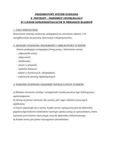 PRZEDMIOTOWY SYSTEM OCENIANIA Z PRZYRODY – PRZEDMIOT UZUPEŁNIAJĄCY W I LICEUM OGÓLNOKSZTAŁCĄCYM W PIEKARACH ŚLĄSKICH 1. CELE KSZTAŁCENIA Rozumienie metody naukowej, polegającej na stawianiu hipotez i ich weryfikowaniu za pomocą obserwacji i eksperymentów. 2. SPOSOBY OCENIANIA WIADOMOŚCI I UMIEJĘTNOŚCI UCZNIÓW: Ocenie podlegają następujące formy pracy i dokonania ucznia: - odpowiedź ustna; - aktywność; - kartkówka; - praca w grupach; - zadanie domowe; - udział w konkursach, olimpiadach; - wykonanie pomocy dydaktycznych 3. WARUNKI OCENIANIA OSIĄGNIĘĆ EDUKACYJNYCH UCZNIÓW: a) Bieżące ocenianie wiedzy i umiejętności ucznia powinno być dokonywane systematycznie. b) Oceny są jawne zarówno dla ucznia, jak i jego rodziców/prawnych opiekunów. c) Uczeń zapoznaje się z oceną, każda ocena wpisywana jest do dziennika papierowego kolorem niebieskim/czarnym oprócz oceny ze sprawdzianu, która wpisana jest kolorem czerwonym oraz do dziennika elektronicznego. d) Każda ocena jest przez nauczyciela uzasadniana. ODPOWIEDŹ USTNA: - każdy uczeń przynajmniej raz w semestrze powinien odpowiadać ustnie, odpowiedź powinna obejmować materiał co najwyżej trzech ostatnich tematów lekcyjnych, - ocena powinna być krótko uzasadniona przez nauczyciela. KARTKÓWKA: - kartkówka powinna obejmować materiał co najwyżej trzech ostatnich tematów i może być przeprowadzona bez zapowiedzi; - kartkówka może trwać do 20 minut; - kartkówka powinna być opatrzona komentarzem pisemnym nauczyciela; - kartkówka powinna być sprawdzona do jednego tygodnia. AKTYWNOŚĆ I PRACA W GRUPACH: Oceniany jest aktywny udział w lekcji. Zabieranie głosu w dyskusji, logiczne wnioskowanie, argumentowanie, prezentowanie własnego światopoglądu itp. Na każdej lekcji można otrzymać ocenę za aktywność,. ocena jest krótko uzasadniana. KONKURSY I OLIMPIADY PRZEDMIOTOWE: - za udział w konkursie/olimpiadzie od poziomu powiatu uczeń może otrzymać ocenę cząstkową bardzo dobrą, a za zdobycie wyróżnienia lub wysokiej lokaty ocenę cząstkową celującą. ZADANIA DOMOWE: - ustne zadania domowe sprawdzane są podczas lekcji, zaś pisemne poza nią. PRACE PROJEKTOWE (wykonywanie pomocy dydaktycznych): - przy ocenianiu prac projektowych bierze się pod uwagę wartość merytoryczną, poziom estetyczny, samodzielność i zaangażowanie podczas przygotowywania. e) Dopuszcza się wykonywanie kopii prac pisemnych na terenie szkoły. f) Uczeń, który w czasie prac pisemnych korzysta z niedozwolonych pomocy, otrzymuje ocenę niedostateczną bez możliwości poprawy tej oceny. g) Uczeń nieobecny podczas pisania kartkówki zobowiązany jest po powrocie do szkoły na pierwszej lekcji danego przedmiotu uzgodnić z nauczycielem termin i formę sprawdzenia wiadomości i umiejętności. Poprawa odbywa się poza zajęciami lekcyjnymi w terminie do 2 tygodni. Niedopełnienie przez ucznia tego obowiązku skutkuje oceną niedostateczną. . h) Uczeń, który z przyczyn nieuzasadnionych jest nieobecny tylko na lekcji na której pisana jest kartkówka nie ma możliwości pisania testu i otrzymuje ocenę niedostateczną i) Uczeń, który otrzymał ocenę niedostateczną, ma możliwość poprawy w terminie i formie ustalonej z nauczycielem. Ocena z poprawy jest kolejną oceną bieżącą uzyskaną przez ucznia. Poprawa odbywa się poza zajęciami lekcyjnymi w terminie do 2 tygodni. j) Uczeń może poprawiać oceny wyższe niż niedostateczna w terminie ustalonym z nauczycielem. Ocena z poprawy jest kolejną oceną bieżącą uzyskaną przez ucznia. Poprawa odbywa się poza zajęciami lekcyjnymi w terminie do 2 tygodni. 4. KRYTERIA OCENIANIA: a) skala oceniania kartkówek i sprawdzianów - bardzo dobry dobry dostateczny dopuszczający niedostateczny 100% - 86% 85% - 70% 69% - 50% 49% - 30% 29% - 0% Dopuszcza się uzyskanie przez ucznia oceny celującej jeżeli spełni wyznaczone przez PSO kryteria. b) Ocena pracy ucznia i jego postępów w nauce w przypadku przedmiotu przyroda, powinna odzwierciedlać przede wszystkim aktywność i inicjatywę podczas zajęć, wkład pracy, sumienność i rzetelność przy wykonywaniu różnego rodzaju zadań. Dopiero w drugiej kolejności należy ocenić opanowanie wiedzy. Nauczyciel stosuje przede wszystkim ocenianie kształtujące, niebędące czynnikiem segregującym uczniów, lecz stanowiące wskaźnik ich mocnych i słabych stron. 5. FORMY INFORMOWANIA UCZNIÓW Ocena jest jawna dla ucznia. Przestawiona jest ona wraz komentarzem na lekcji. 6. FORMY INFORMOWANIA RODZICÓW Rodzic/opiekun prawny otrzymuje informację o ocenie podczas zebrań, konsultacji lub spotkań indywidualnych Przedmiotowy system oceniania z przyrody jest integralną częścią Wewnątrzszkolnego Systemu Oceniania. Wszystkie sprawy nie ujęte w przedmiotowym systemie oceniania rozstrzygane będą zgodnie z WSO KRYTERIA OCENIANIA UCZNIÓW GEOGRAFII – POZIOM PODSTAWOWY Przy ocenianiu stosowane są następujące kryteria, odnoszące się do sześciostopniowej skali ocen Ocenę celującą otrzymuje uczeń, który: - twórczo rozwija własne uzdolnienia i zainteresowania, - pomysłowo i oryginalnie rozwiązuje nietypowe zadania, - posiada wiedzę wykraczającą poza obowiązujący program nauczania. Ocenę bardzo dobrą otrzymuje uczeń, który opanował pełen zakres wiadomości i umiejętności przewidzianych programem nauczania oraz potrafi: - sprawnie poruszać się w tematyce obejmującej zakres materiału z geografii, biologii, chemii i fizyki - samodzielnie rozwiązywać problemy, - wykazać się znajomością pojęć i terminów oraz umiejętnością poprawnego ich zastosowania w sytuacjach typowych i nietypowych, - posługiwać się poprawnie terminologią z poszczególnych przedmiotów, - samodzielnie zdobywać wiedzę i umiejętności, - w oparciu o źródła przeprowadzić analizę procesów i określić ich konsekwencje. Ocenę dobrą otrzymuje uczeń, który opanował wiadomości i u