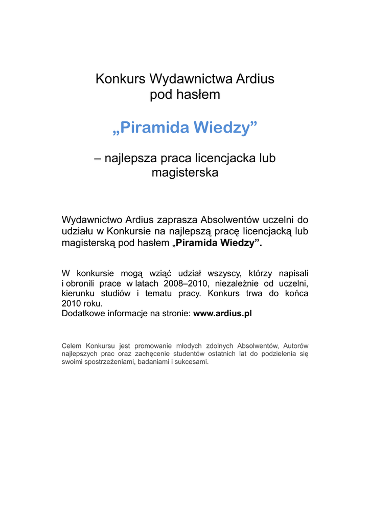 Konkurs Wydawnictwa Ardius pod hasłem „Piramida Wiedzy” – najlepsza praca licencjacka lub magisterska Wydawnictwo Ardius zaprasza Absolwentów uczelni do udziału w Konkursie na najlepszą pracę licencjacką lub magisterską pod hasłem „Piramida Wiedzy”. W konkursie mogą wziąć udział wszyscy, którzy napisali i obronili prace w latach 2008–2010, niezależnie od uczelni, kierunku studiów i tematu pracy. Konkurs trwa do końca 2010 roku. Dodatkowe informacje na stronie: www.ardius.pl Celem Konkursu jest promowanie młodych zdolnych Absolwentów, Autorów najlepszych prac oraz zachęcenie studentów ostatnich lat do podzielenia się swoimi spostrzeżeniami, badaniami i sukcesami. Regulamin Konkursu Organizator Konkursu: Organizatorem Konkursu i fundatorem nagrody jest Wydawnictwo Ardius, specjalizujące się w wydawaniu i promocji publikacji elektronicznych. Ogólne warunki udziału w Konkursie: 1. Konkurs skierowany jest do Absolwentów wyższych uczelni państwowych i niepaństwowych w całej Polsce, niezależnie od kierunku i rodzaju studiów oraz od wybranego tematu pracy. 2. Prace mogą być zgłaszane tylko przez Autorów. 3. Zgłoszenie pracy na stronie wydawnictwa http://www.ardius.pl/zarejestrujautora.html. Państwa tekst powinien zostać dołączony do zgłoszenia (format pracy Microsoft Word). 4. Zgłoszenie powinno dodatkowo zawierać: informację o dacie obrony, uzyskanej ocenie oraz dopisek „Konkurs Piramida Wiedzy”. 5. Prace można przesyłać od 15 marca 2010 do 31 grudnia 2010. Warunkiem zakwalifikowania do Konkursu jest pozytywna opinia komisji redakcyjnej Wydawnictwa Ardius, publikacja pracy lub podpisanie Umowy wydawniczej z autorem. 6. Wyniki Konkursu zostaną ogłoszone 30 stycznia 2011 na stronie internetowej wydawnictwa. 7. Uczestnicy Konkursu, którzy zostali zakwalifikowani do Konkursu otrzymają mailowo informację o przyjęciu zgłoszenia i umowie wydawniczej. Ocena prac oraz nagrody: 1. Najważniejszy wpływ na ocenę pracy będą miały: • zawartość merytoryczna (przeprowadzone badania, wykorzystane źródła, interpretacja wyników); • strona wizualna pracy (gramatyka i interpunkcja, poprawne tworzenie przypisów i bibliografii); • praktyczne, poznawcze walory pracy. 2. Nagrodą w Konkursie dla Autora najlepszej pracy jest kwota 2000 zł (słownie: dwa tysiące złotych). Nagrodzona zostanie tylko jedna praca (jeden Autor). Uwagi końcowe: 1. Organizator Konkursu zastrzega sobie prawo wykorzystania fragmentów prac oraz informacji o ich Autorach w materiałach informacyjnych pojawiających się na stronie Wydawnictwa Ardius. 2. We wszystkich szczegółowych kwestiach oraz takich, które nie zostały objęte Regulaminem decyzje będzie podejmowała redakcja Wydawnictwa Ardius. 3. Wszystkie pytania na temat Konkursu można kierować na adres Koordynatorki Konkursu, Magdaleny Wojtas: [email protected]. 4. Oficjalna strona internetowa Konkursu to strona wydawnictwa http://ardius.pl