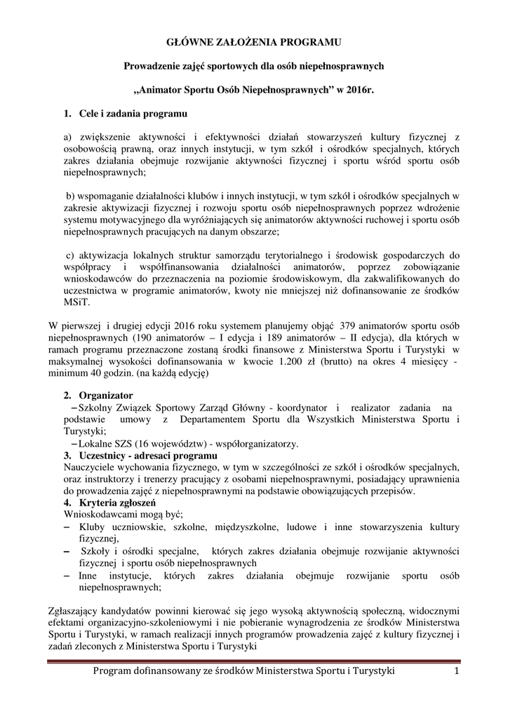GŁÓWNE ZAŁOŻENIA PROGRAMU Prowadzenie zajęć sportowych dla osób niepełnosprawnych „Animator Sportu Osób Niepełnosprawnych” w 2016r. 1. Cele i zadania programu a) zwiększenie aktywności i efektywności działań stowarzyszeń kultury fizycznej z osobowością prawną, oraz innych instytucji, w tym szkół i ośrodków specjalnych, których zakres działania obejmuje rozwijanie aktywności fizycznej i sportu wśród sportu osób niepełnosprawnych; b) wspomaganie działalności klubów i innych instytucji, w tym szkół i ośrodków specjalnych w zakresie aktywizacji fizycznej i rozwoju sportu osób niepełnosprawnych poprzez wdrożenie systemu motywacyjnego dla wyróżniających się animatorów aktywności ruchowej i sportu osób niepełnosprawnych pracujących na danym obszarze; c) aktywizacja lokalnych struktur samorządu terytorialnego i środowisk gospodarczych do współpracy i współfinansowania działalności animatorów, poprzez zobowiązanie wnioskodawców do przeznaczenia na poziomie środowiskowym, dla zakwalifikowanych do uczestnictwa w programie animatorów, kwoty nie mniejszej niż dofinansowanie ze środków MSiT. W pierwszej i drugiej edycji 2016 roku systemem planujemy objąć 379 animatorów sportu osób niepełnosprawnych (190 animatorów – I edycja i 189 animatorów – II edycja), dla których w ramach programu przeznaczone zostaną środki finansowe z Ministerstwa Sportu i Turystyki w maksymalnej wysokości dofinansowania w kwocie 1.200 zł (brutto) na okres 4 miesięcy minimum 40 godzin. (na każdą edycję) 2. Organizator − Szkolny Związek Sportowy Zarząd Główny - koordynator i realizator zadania na podstawie umowy z Departamentem Sportu dla Wszystkich Ministerstwa Sportu i Turystyki; − Lokalne SZS (16 województw) - współorganizatorzy. 3. Uczestnicy - adresaci programu Nauczyciele wychowania fizycznego, w tym w szczególności ze szkół i ośrodków specjalnych, oraz instruktorzy i trenerzy pracujący z osobami niepełnosprawnymi, posiadający uprawnienia do prowadzenia zajęć z niepełnosprawnymi na podstawie obowiązujących przepisów. 4. Kryteria zgłoszeń Wnioskodawcami mogą być; − Kluby uczniowskie, szkolne, międzyszkolne, ludowe i inne stowarzyszenia kultury fizycznej, − Szkoły i ośrodki specjalne, których zakres działania obejmuje rozwijanie aktywności fizycznej i sportu osób niepełnosprawnych − Inne instytucje, których zakres działania obejmuje rozwijanie sportu osób niepełnosprawnych; Zgłaszający kandydatów powinni kierować się jego wysoką aktywnością społeczną, widocznymi efektami organizacyjno-szkoleniowymi i nie pobieranie wynagrodzenia ze środków Ministerstwa Sportu i Turystyki, w ramach realizacji innych programów prowadzenia zajęć z kultury fizycznej i zadań zleconych z Ministerstwa Sportu i Turystyki Program dofinansowany ze środków Ministerstwa Sportu i Turystyki 1 Wnioskodawca zgłasza we wniosku deklarację o zabezpieczeniu pierwszej części wynagrodzenia dla animatora z innych źródeł na szczeblu lokalnym, minimum 1200 zł (brutto/ na edycję). Prawidłowo wypełnione wnioski kandydatów rozpatrują Lokalne SZS - współorganizatorzy. 5. Sposób wyboru uczestników Regionalne komisje Animatora Sportu Osób Niepełnosprawnych przy Lokalnych SZS, które są poszerzane o stosownych przedstawicieli rozpatrują nadesłane wnioski i dokonują wyboru uczestników programu. Komisje regionalne po analizie złożonych ofert dokonują wyboru kandydatów na I edycję marzec - czerwiec oraz na II edycję wrzesień - grudzień 2016; Ewentualne odwołania od decyzji Komisji Wojewódzkich rozpatruje Komisja Programu powołana przez Zarząd Główny SZS. 6. Sposób realizacji zadania − Z wyłonionymi (w wyniku przeprowadzonej procedury) uczestnikami programu lokalne SZS zawierają indywidualne umowy; − Zakres zadań animatora i sposób dokumentowania wykonanych prac określa umowa − Wnioskodawca odpowiada za ubezpieczenie uczestników zajęć prowadzonych w ramach zawartej umowy. − Liczba uczestników zajęć sportowych prowadzonych w ramach „Animator sportu osób niepełnosprawnych”, nie może być mniejsza niż 10 osób niepełnosprawnych, chyba, że sytuacja osób niepełnosprawnych (stopień niepełnosprawności/ możliwości funkcjonalne) wymusza mniejszą liczbę uczestników sekcji. Każdorazowo sytuacja taka musi być szczegółowo opisana i uzasadniona. − Praca instruktora/trenera/ animatora musi być udokumentowana w „dzienniku pracy instruktora/ trenera/animatora” i stanowi dla wnioskodawcy podstawę wypłaty dofinansowania ze środków Ministerstwa Sportu i Turystyki; − Osoby prowadzące zajęcia sportowe dla osób niepełnosprawnych –„Animator sportu osób niepełnosprawnych nie mogą prowadzić zajęć sekcji sportowych i tym samym pobierać wynagrodzenia z tego tytułu; 7. Sposób kontroli i nadzoru nad realizacją zadania − Nadzór nad realizowanym zadaniem sprawuje Departament Sportu dla Wszystkich Ministerstwa Sportu i Turystyki − Zarząd Główny SZS - organizator oraz Lokalne SZS, dokonują kontroli i oceny realizacji nawiązanych umów oraz rozliczają i opracowują kompleksowe sprawozdanie z realizacji przyjętego zadania; Załączniki do programu: - Wniosek o Animatora SON - Informacje i wskazówki do programu SON - Oświadczenie animatora SON - Dziennik pracy animatora SON Program dofinansowany ze środków Ministerstwa Sportu i Turystyki 2