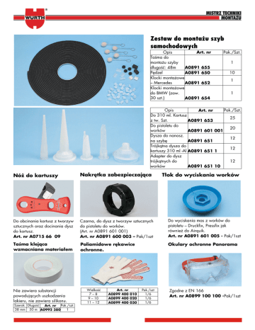Zestaw do montażu szyb samochodowych Opis Art. nr Taśma do montażu szyby długość: 48m A0891 655 Pędzel A0891 650 Klocki montażowe – Mercedes A0891 652 Klocki montażowe do BMW (zaw. 30 szt.) A0891 654 Pak./Szt. 1 10 1 1 Opis Pak./Szt. Art. nr Do 310 ml. Kartusz 25 z tw. Szt. A0891 653 Do pistoletu do 20 worków A0891 601 001 Dysza do nanosz. 12 na szybę A0891 651 Trójkątna dysza do 12 kartuszy 310 ml -Al A0891 651 1 Adapter do dysz 12 trójkątnych do worków A0891 651 10 Nóż do kartuszy Nakrętka zabezpieczająca Do obcinania kartusz z tworzyw sztucznych oraz docinania dysz do kartusz. Art. nr A0715 66 09 Czarna, do dysz z tworzyw sztucznych do pistoletu do worków. (Art. nr A0891 601 001) Art. nr A0891 600 003 – Pak/1szt Do wyciskania mas z worków do pistoletu – Druckfix, Pressfix jak również do Airquik. Art. nr A0891 601 005 - Pak/1szt Taśma klejąca wzmacniana materiałem Poliamidowe rękawice ochronne. Okulary ochronne Panorama Nie zawiera substancji powodujących uszkodzenia lakieru, nie zawiera silikonu. Szerok. Długość Art. nr Pak./szt. 38 mm 50 m A0992 380 1 Wielkość 7–8 9 – 10 11 – 12 Art. nr A0899 400 010 A0899 400 020 A0899 400 030 Pak./szt 1/6 1/6 1/6 Tłok do wyciskania worków Zgodne z EN 166 Art. nr A0899 100 100 -Pak/1szt