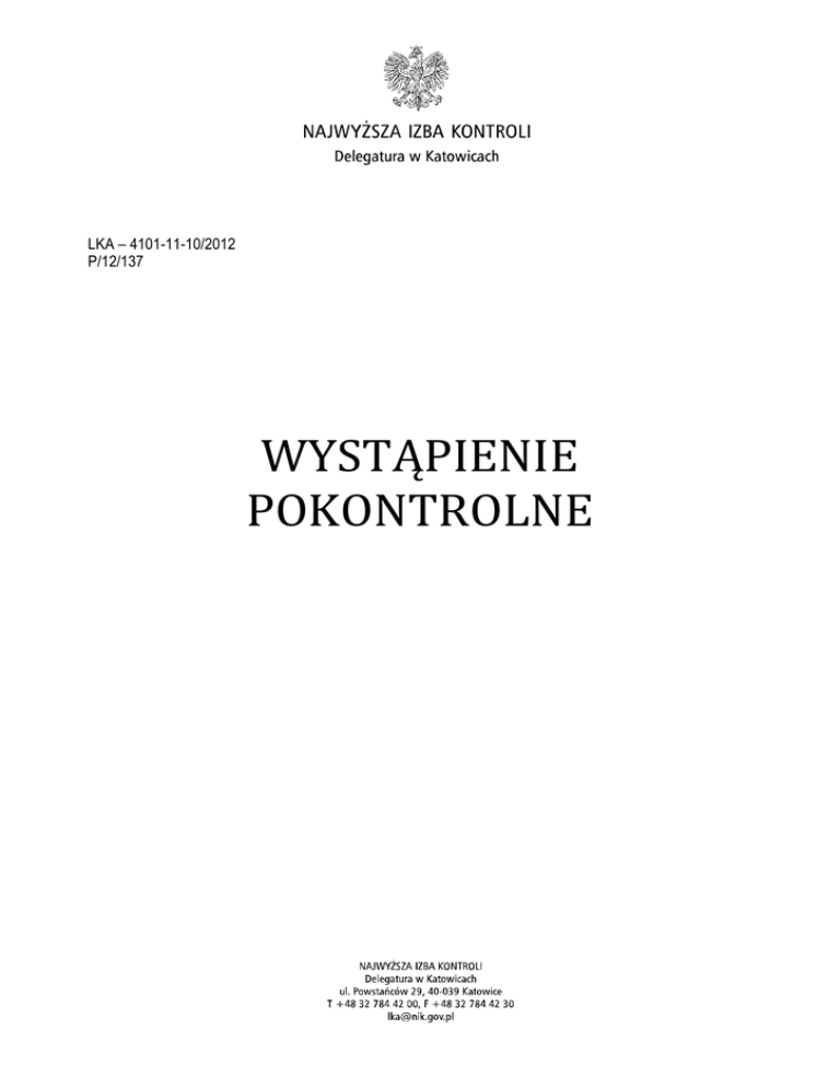 LKA – 4101-11-10/2012 P/12/137 WYSTĄPIENIE POKONTROLNE I. Dane identyfikacyjne kontroli Numer i tytuł kontroli P/12/137 - Realizacja przepisów ustawy o ochronie zdrowia przed następstwami uŜywania tytoniu i wyrobów tytoniowych w latach 2010-2012 Jednostka przeprowadzająca kontrolę NajwyŜsza Izba Kontroli Delegatura w Katowicach Kontroler Ryszard Pucek, główny specjalista kontroli państwowej, upowaŜnienie do kontroli nr 082787 z dnia 18 września 2012 r. (dowód: akta kontroli str. 1-2) Jednostka kontrolowana Zarząd Dróg Wojewódzkich w Katowicach (ZDW), Regon 276303005, ul. Lechicka 24, 40-609 Katowice Kierownik jednostki kontrolowanej mgr inŜ. Zbigniew Tabor, dyrektor (dowód: akta kontroli str. 3-4) II. Ocena kontrolowanej działalności Ocena ogólna Uzasadnienie oceny ogólnej NajwyŜsza Izba Kontroli ocenia pozytywnie1 działalność kontrolowanej jednostki w zbadanym zakresie. W ZDW prawidłowo realizowano przepisy ustawy z dnia 9 listopada 1995 r. o ochronie zdrowia przed następstwami uŜywania tytoniu i wyrobów tytoniowych2, zwanej dalej ustawą antynikotynową. Informacje o zakazie palenia tytoniu umieszczono w budynku w widocznych miejscach i zakazu tego przestrzegano. Nie odnotowano równieŜ skarg związanych z naruszeniem ww. ustawy, ani teŜ nie stwierdzono przypadków jej naruszania w Urzędzie. (dowód: akta kontroli str. 5-18) III. Opis ustalonego stanu faktycznego 1. Przestrzeganie zakazu palenia w obiektach. 1.1. Oznakowanie obiektów. Opis stanu faktycznego Na drzwiach wejściowych do budynku ZDW, jak równieŜ na drzwiach przed wejściami do poszczególnych stref budynku umieszczono oznaczenia tekstowe i graficzne informujące o zakazie palenia na terenie całego obiektu. Ustalone nieprawidłowości W działalności kontrolowanej jednostki w przedstawionym wyŜej zakresie nie stwierdzono nieprawidłowości. (dowód: akta kontroli str. 11-12) NajwyŜsza Izba Kontroli stosuje 3-stopniową skalę ocen: pozytywna, pozytywna mimo stwierdzonych nieprawidłowości, negatywna.. 1 2 Dz. U. Nr 10, poz. 55, ze zm. 1.2. Spełnianie wymogów ustawowych przez palarnie wyznaczone na terenie obiektów jednostki. Opis stanu faktycznego Na terenie siedziby ZDW nie wyznaczono palarni (w świetle przepisów ustawy antynikotynowej Dyrektor ZDW nie miał obowiązku tworzenia palarni). (dowód: akta kontroli str. 12) 1.3. Przestrzeganie zakazu palenia na terenie jednostki. Opis stanu faktycznego W toku oględzin, którymi objęto 46 pomieszczeń biurowych, pomieszczenia sekretariatu, 2 sale konferencyjne, pomieszczenie socjalne, 3 pomieszczenia sanitarne, salę przetargów, pomieszczenie obsługi petentów i portiernię, nie stwierdzono przypadków palenia papierosów w budynku ZDW. (dowód: akta kontroli str. 11-12) Ustalone nieprawidłowości W działalności kontrolowanej jednostki w przedstawionym wyŜej zakresie nie stwierdzono nieprawidłowości. 1.4. Obowiązki wynikające z ustawy antynikotynowej w świetle regulaminów obowiązujących w jednostce. Opis stanu faktycznego Zarządzeniem D/0131/14Z/09 z dnia 1 czerwca 1999 r. Dyrektor ZDW wprowadził Regulamin Pracy ZDW, w którym w §21 zapisano: „(…)Na terenie Zakładu palenie tytoniu jest dozwolone tylko w miejscach do tego wyznaczonych. W słuŜbowych pojazdach mechanicznych palenie tytoniu jest zabronione. Pracownik ma obowiązek stosować się do zarządzeń Dyrektora Zarządu Dróg Wojewódzkich w Katowicach zakazujących lub ograniczających palenie tytoniu.(…)”. W dniu 15 listopada 2010 r. Dyrektor ZDW wydał Zarządzenie nr D/0131/18Z/10. W punkcie pierwszym Zarządzenia zabronił palenia wyrobów tytoniowych w budynku ZDW. Podał teŜ, Ŝe: „(…)naruszenie zakazu palenia wyrobów tytoniowych podlega karze grzywny, orzekanej w trybie przepisów o postępowaniu w sprawach o wykroczenia(…)” (dowód: akta kontroli str. 6÷9) Dyrektor ZDW wyjaśnił, Ŝe na chwilę obecną w ZDW nie wyznaczył pomieszczenia, w którym wolno palić tytoń, rozwaŜa jednak utworzenie takiego miejsca, w formie altany zlokalizowanej na terenie ZDW, na zewnątrz budynku. (dowód: akta kontroli str. 19) Ustalone nieprawidłowości W działalności kontrolowanej jednostki w przedstawionym wyŜej zakresie nie stwierdzono nieprawidłowości. 1.5. Skargi i wnioski dotyczące realizacji przepisów ustawy antynikotynowej. Opis stanu faktycznego W okresie objętym kontrolą, do ZDW nie wpłynęły skargi i wnioski dotyczące realizacji przepisów ustawy antynikotynowej lub kwestii z nią związanych. (dowód: akta kontroli str. 13÷16) Ustalone nieprawidłowości W działalności kontrolowanej jednostki w przedstawionym wyŜej zakresie nie stwierdzono nieprawidłowości. 2 1.6. Problemy w realizacji ustawy antynikotynowej. Opis stanu faktycznego Dyrektor ZDW w powyŜszym zakresie podał, Ŝe: „(…) realizacja przepisów przedmiotowej ustawy, jak równieŜ zapisów ww. Zarządzenia nie stwarza i nigdy nie stwarzała problemów w tut. Zarządzie.(…)”. W sprawie ewentualnych zmian w przepisach, w celu zwiększenia skuteczności ochrony zdrowia przed następstwami uŜywania tytoniu i wyrobów tytoniowych, Dyrektor ZDW stwierdził, Ŝe: „(…) Jak wynika z tekstu Uzasadnienia komisyjnego projektu ustawy o zmianie ustawy o ochronie zdrowia przed następstwami uŜywania tytoniu i wyrobów tytoniowych (druk sejmowy nr 1030), dotyczącego nowelizacji jw., wprowadzane miękkie, a zatem niejednoznaczne regulacje zakazujące palenia tytoniu nie przynoszą konkretnych korzyści. Doświadczenia innych krajów, w których wprowadzono całkowity zakaz palenia – Włochy, Irlandia czy USA – dowiodły, iŜ warto wprowadzać zdecydowane przepisy zakazujące palenia tytoniu. Instrument regulacji prawnej spowodował zdecydowanie większe korzyści, niŜ bardzo niedogodne i kosztochłonne wieloletnie kampanie antynikotynowe i uświadamiające. Tym samym naleŜy stwierdzić, Ŝe rozwiązania prawne i organizacyjne mogą być skuteczn