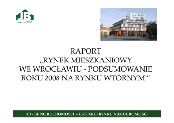 RAPORT „RYNEK MIESZKANIOWY WE WROCŁAWIU - PODSUMOWANIE ROKU 2008 NA RYNKU WTÓRNYM ” JOT- BE NIERUCHOMOŚCI – EKSPERCI RYNKU NIERUCHOMOŚCI ŚREDNIA CENA m.kw. MIESZKANIA W 2008 ROKU ( w PLN) 7000 6643 6315 6000 5676 6150 5000 4000 3000 2000 1000 0 I KWARTAŁ II KWARTAŁ III KWARTAŁ IV KWARTAŁ JOT- BE NIERUCHOMOŚCI – EKSPERCI RYNKU NIERUCHOMOŚCI ŚREDNIA CENA m.kw. MIESZKANIA W POSZCZEGÓLNYCH DZIELNICACH WROCŁAWIA 8000 7000 6000 6 220 6 800 6197 5000 5 830 5961 4000 3000 2000 1000 0 KRZYKI ŚRÓDMIEŚCIE PSIE POLE FABRYCZNA STARE MIASTO JOT- BE NIERUCHOMOŚCI – EKSPERCI RYNKU NIERUCHOMOŚCI POPULARNOŚĆ DZIELNIC WROCŁAWIA WŚRÓD KLIENTÓW 40% 35% 36 % 30% 26 % 25% 21 % 20% 15% 10 % 10% 5% 5% 0% KRZYKI ŚRÓDMIEŚCIE PSIE POLE FABRYCZNA STARE MIASTO JOT- BE NIERUCHOMOŚCI – EKSPERCI RYNKU NIERUCHOMOŚCI Według przeprowadzonych analiz średnia cena 1 m.kw. mieszkania we Wrocławiu, kupionego na rynku wtórnym, w roku 2008 wyniosła 6196zł Średnia powierzchnia kupowanego mieszkania wynosiła 51 m.kw. Średnia cena transakcyjna wynosiła 317 000 zł. Średnia różnica pomiędzy ceną ofertową a cena transakcyjną wyniosła 9%. Do najdroższych dzielnic należą Śródmieście i Krzyki, natomiast najtaniej kupimy mieszkanie w dzielnicy Fabryczna. Najwyższe ceny ofertowe pojawiają się w obrębie Rynku – Stare Miasto, jednakże mała liczba nieruchomości na sprzedaż oraz związana z tym niewielka liczba transakcji jest niereprezentatywna dla całości próby. Ważnym zauważenie jest fakt znacznego zbliżenia cen m.kw. w dzielnicach Krzyki, Psie Pole i Fabryczna. Krzyki, Śródmieście i Fabryczna to miejsca najchętniej wybierane przez Kupujących. JOT- BE NIERUCHOMOŚCI – EKSPERCI RYNKU NIERUCHOMOŚCI Które dzielnice są najbardziej popularne wśród Wrocławian? Preferencje Wrocławian są stałe. Dużym powodzeniem cieszą w dalszym ciągu Krzyki, na których powstaje najwięcej inwestycji. (np. Os. Przyjaźni, Willa Jazz Ołtaszyn, Wysoka). Także Śródmieście z racji dogodnej komunikacji i bliskości wyższych uczelni cieszy się niesłabnącym zainteresowaniem. Od niedawna natomiast do grona najpopularniejszych dołączyły osiedla w Fabrycznej np. osiedle Muchobór Wielki, na którym przybyło wiele nowych mieszkań. W następnej kolejności może to dotyczyć Żernik i Leśnicy. Co decyduje o atrakcyjności najpopularniejszych dzielnic? W pierwszej kolejności dogodny dojazd do centrum – miejsce pracy, uczelnie, po drugie prestiż, jakim w świadomości wrocławian cieszą się poszczególne dzielnice (np. Sępolno), a po trzecie rozwinięta infrastruktura usługowa. Mieszkania w jakich budynkach (ilość kondygnacji, materiały, wielkość) cieszą się największym powodzeniem wśród klientów? Największym zainteresowaniem cieszą się budynki nowe, w niskiej zabudowie (do czterech kondygnacji) na kameralnych osiedlach. Najszybciej sprzedają się mieszkania dwupokojowe o pow. 50-60 m.kw. Jakie mieszkania (ilość pokoi, strona świata, kondygnacja itp.) cieszą się największym powodzeniem? Czy w ostatnich miesiącach zmieniły się preferencje klientów? Największym zainteresowaniem cieszą się mieszkania dwupokojowe o pow. 50-60 m.kw. z balkonem, położone na I, II piętrze. Zdecydowanie gorzej sprzedają się mieszkania na parterze i ostatniej kondygnacji. W tym względzie ostatni rok nie przyniósł zmiany preferencji klientów. JOT- BE NIERUCHOMOŚCI – EKSPERCI RYNKU NIERUCHOMOŚCI ŚREDNIE CENY m.kw. MIESZKANIA W LATACH 2008-2005 ( w PLN) 7000 6000 6196 5000 6131 4000 4253 3000 3044 2000 1000 0 2008 2007 2006 2005 JOT- BE NIERUCHOMOŚCI – EKSPERCI RYNKU NIERUCHOMOŚCI ŚREDNIA POWIERZCHNIA KUPOWANYCH MIESZKAŃ W LATACH 2008-2005 ( w m.kw.) 70 60 59 50 56 52,5 40 51 30 20 10 0 2008 2007 2006 2005 JOT- BE NIERUCHOMOŚCI – EKSPERCI RYNKU NIERUCHOMOŚCI ŚREDNIA CENA TRANSAKCYJNA MIESZKAŃ W LATACH 2008-2005 ( w m.kw.) 350000 317 137 322 100 300000 250 560 250000 200000 170 503 150000 100000 50000 0 2008 2007 2006 2005 JOT- BE NIERUCHOMOŚCI – EKSPERCI RYNKU NIERUCHOMOŚCI LATA 2005-2008 W stosunku do roku 2007 cena 1 metra kwadratowego mieszkania wzrosła o 1%. W latach 2006-2007 wzrost cen wynosił 44%, natomiast pomiędzy rokiem 2005-2006 dynamika wzrostu cen wynosiła 39%. W 2008 roku kupowano powierzchniowo najmniejsze mieszkania od 4 lat, co wpłynęło na obniżenie średniej ceny transakcyjnej w stosunku do roku ubiegłego o ponad 1,5%. Średnia powierzchnia zakupionego w 2008 roku mieszkania była o blisko 8 m.kw. mniejsza, niż dla porównania w roku 2006. JOT- BE NIERUCHOMOŚCI – EKSPERCI RYNKU NIERUCHOMOŚCI WYNAJEM MIESZKAŃ / SPRZEDAŻ DOMÓW Średnia powierzchnia wynajmowanego mieszkania wynosiła 57 m.kw. Średnia cena wynajmu mieszkania wynosiła 1 980 zł. Wynajmujący otrzymywali od najemców dokładnie taką sumę jakiej żądali. Średnia cena transakcyjna domów wynosiła 1 615 000 zł i była średnio o 7 % niższa od ceny ofertowej. W przeciwieństwie do lat ubiegłych najwięcej chętnych znajdowały domy położone we Wrocławiu, a nie w miejscowościach podwrocławskich z wyjątkiem Bielan Wrocławskich i Ozorzyc cieszących się niesłabnącą popularnością. JOT- BE NIERUCHOMOŚCI – EKSPERCI RYNKU NIERUCHOMOŚCI JOT-BE Nieruchomości Sp. z o.o. ul. Piłsudskiego 8a, 50-049 Wrocław www.jot-be.pl Raport przygotowali: Michał Michałowicz – Marketing Manager – [email protected] / 697-222-482 Łukasz Lisik – Specjalista ds. Systemu Zarządzania Jakością ISO JOT- BE NIERUCHOMOŚCI – EKSPERCI RYNKU NIERUCHOMOŚCI