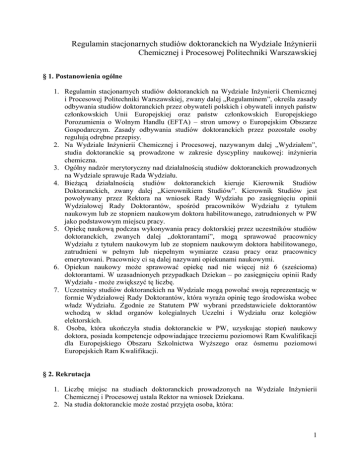 Regulamin stacjonarnych studiów doktoranckich na Wydziale Inżynierii Chemicznej i Procesowej Politechniki Warszawskiej § 1. Postanowienia ogólne 1. Regulamin stacjonarnych studiów doktoranckich na Wydziale Inżynierii Chemicznej i Procesowej Politechniki Warszawskiej, zwany dalej „Regulaminem”, określa zasady odbywania studiów doktoranckich przez obywateli polskich i obywateli innych państw członkowskich Unii Europejskiej oraz państw członkowskich Europejskiego Porozumienia o Wolnym Handlu (EFTA) – stron umowy o Europejskim Obszarze Gospodarczym. Zasady odbywania studiów doktoranckich przez pozostałe osoby regulują odrębne przepisy. 2. Na Wydziale Inżynierii Chemicznej i Procesowej, nazywanym dalej „Wydziałem”, studia doktoranckie są prowadzone w zakresie dyscypliny naukowej: inżynieria chemiczna. 3. Ogólny nadzór merytoryczny nad działalnością studiów doktoranckich prowadzonych na Wydziale sprawuje Rada Wydziału. 4. Bieżącą działalnością studiów doktoranckich kieruje Kierownik Studiów Doktoranckich, zwany dalej „Kierownikiem Studiów”. Kierownik Studiów jest powoływany przez Rektora na wniosek Rady Wydziału po zasięgnięciu opinii Wydziałowej Rady Doktorantów, spośród pracowników Wydziału z tytułem naukowym lub ze stopniem naukowym doktora habilitowanego, zatrudnionych w PW jako podstawowym miejscu pracy. 5. Opiekę naukową podczas wykonywania pracy doktorskiej przez uczestników studiów doktoranckich, zwanych dalej „doktorantami”, mogą sprawować pracownicy Wydziału z tytułem naukowym lub ze stopniem naukowym doktora habilitowanego, zatrudnieni w pełnym lub niepełnym wymiarze czasu pracy oraz pracownicy emerytowani. Pracownicy ci są dalej nazywani opiekunami naukowymi. 6. Opiekun naukowy może sprawować opiekę nad nie więcej niż 6 (sześcioma) doktorantami. W uzasadnionych przypadkach Dziekan – po zasięgnięciu opinii Rady Wydziału - może zwiększyć tę liczbę. 7. Uczestnicy studiów doktoranckich na Wydziale mogą powołać swoją reprezentację w formie Wydziałowej Rady Doktorantów, która wyraża opinię tego środowiska wobec władz Wydziału. Zgodnie ze Statutem PW wybrani przedstawiciele doktorantów wchodzą w skład organów kolegialnych Uczelni i Wydziału oraz kolegiów elektorskich. 8. Osoba, która ukończyła studia doktoranckie w PW, uzyskując stopień naukowy doktora, posiada kompetencje odpowiadające trzeciemu poziomowi Ram Kwalifikacji dla Europejskiego Obszaru Szkolnictwa Wyższego oraz ósmemu poziomowi Europejskich Ram Kwalifikacji. § 2. Rekrutacja 1. Liczbę miejsc na studiach doktoranckich prowadzonych na Wydziale Inżynierii Chemicznej i Procesowej ustala Rektor na wniosek Dziekana. 2. Na studia doktoranckie może zostać przyjęta osoba, która: 1 1) posiada tytuł zawodowy magistra, magistra inżyniera lub inny równorzędny, uzyskany w Polsce lub w innym kraju, przy czym zasady uznawania wykształcenia zdobytego za granicą określają odrębne przepisy; 2) uzyskała zgodę na opiekę naukową od pracownika Wydziału, posiadającego co najmniej stopień naukowy doktora habilitowanego w zakresie inżynierii chemicznej lub pokrewnej dyscypliny naukowej, spełniającego wymagania określone na podstawie art. 201 ustawy Prawo o szkolnictwie wyższym; 3) uzyskała od Dziekana Wydziału zgodę na wykonywanie tej pracy na Wydziale, stanowiącą zarazem zobowiązanie do zapewnienia właściwych warunków jej realizacji. 3. Rekrutacja na stacjonarne studia doktoranckie obywateli polskich oraz osób niebędących obywatelami polskimi, które korzystają z praw obywateli polskich odbywa się w drodze konkursu. Rekrutacja pozostałych osób niebędących obywatelami polskimi odbywa się na podstawie odrębnych przepisów. 4. Na potrzeby rekrutacji kandydaci na studia doktoranckie mają udostępniony wykaz pracowników Wydziału mogących pełnić funkcję opiekuna naukowego. Wykaz ten wraz z informacją o tematyce badań naukowych jest umieszczony na stronie internetowej Wydziału. 5. Czynności związane z rekrutacją na studia doktoranckie przeprowadza Wydziałowa Komisja Rekrutacyjna ds. Studiów Doktoranckich, zwana dalej „Komisją”, powołana przez Dziekana. Komisji przewodniczy Kierownik Studiów. Ponadto w skład Komisji wchodzi dwóch pracowników Wydziału uprawnionych do pełnienia funkcji promotora w przewodach doktorskich oraz dwóch przedstawicieli doktorantów, desygnowanych przez Wydziałową Radę Doktorantów. 6. Komisja przeprowadza postępowanie konkursowe na studia doktoranckie, biorąc pod uwagę: 1) wyniki egzaminu wstępnego z inżynierii chemicznej, matematyki i języka obcego; 2) przebieg studiów prowadzących do uzyskania dyplomu magisterskiego; 3) osiągnięcia kandydata wskazujące na jego predyspozycje do pracy badawczej, w tym publikacje oraz wyniki działalności w studenckim ruchu naukowym. 7. Niezbędnymi warunkami przyjęcia na studia doktoranckie są: uzyskanie oceny końcowej ze studiów II stopnia (magisterskich) co najmniej: dobry oraz uzyskanie pozytywnej oceny z egzaminu wstępnego, o którym mowa w ust. 6 pkt. 1. 8. Z egzaminu wstępnego zwolnione są osoby, które ukończyły studia II stopnia (magisterskie) na Wydziale i uzyskały ocenę końcową: celujący. 9. Z egzaminu wstępnego dodatkowo mogą być zwolnione osoby, które ukończyły studia II stopnia (magisterskie) na wydziałach o pokrewnym kierunku kształcenia i uzyskały ocenę końcową: celujący. Ostateczną decyzję o liczbie osób zwolnionych z egzaminu a nie będących absolwentami Wydziału podejmuje Kierownik Studiów w zależności od aktualnego limitu przyjęć na studia doktoranckie i liczby kandydatów zgłoszonych w danej rekrutacji. 10. Szczegółowy tryb przebiegu i oceny egzaminu wstępnego określono w załączniku nr 1 do Regulaminu. 11. Komisja może przeprowadzić dodatkową rozmowę kwalifikacyjną z kandydatami w celu wyłonienia osób zakwalifikowanych na 