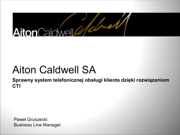 Aiton Caldwell SA Sprawny system telefonicznej obsługi klienta dzięki rozwiązaniom CTI Paweł Gruszecki Business Line Manager Aiton Caldwell SA Aiton Caldwell SA to lider polskiego rynku hostowanych usług telekomunikacyjnych dla małych i średnich przedsiębiorców oraz klientów indywidualnych. Głównym obszarem działania Grupy jest świadczenie usług SaaS (Software as a Service) opartych na zdalnym udostępnianiu oprogramowania poprzez sieć internet. Aiton Caldwell SA to: • 40% polskiego rynku Pure VoIP • 2% polskiego rynku MSP • Ponad 120.000 użytkowników indywidualnych i biznesowych • 3 linie produktowe: FreecoNet, Vanberg Systems, Smarto Spółka notowana jest na rynku NewConnect. Aiton Caldwell SA Aiton Caldwell SA zarządza trzema markami, które dedykowane są odrębnym segmentom rynku. Takie zróżnicowanie ma na celu jak najlepsze dopasowanie oferty do wymagań użytkowników. Oferta przeznaczona dla użytkowników domowych i małych firm Oferuje kompleksowe hostowane usługi dla firm z sektora MSP Zintegrowane usługi hostowane wspierające zarządzanie małymi firmami CTI – co to jest • Rozwiązania i technologie pozwalające na integrację systemów komputerowych z telefonią • Zdarzenia w systemie komputerowym wywołują akcję w systemie telekomunikacyjnym • Zdarzenia w systemie telekomunikacyjnym wywołują akcję w systemie komputerowym • Przykład zastosowania • Call Center i system CRM CTI – co to jest, cd. System komputerowy Telefonia • System CRM • Połączenia przychodzące • System ERP • Połączenia wychodzące • System BOK CTI • Call Center • System FK • IVR • System… • PBX CTI – możliwości • Screen pop-up • Identyfikacja osoby dzwoniącej • Identyfikacja celu połączenia • Pobieranie informacji od klienta przed połączeniem z konsultantem • Automatyczne dzwonienie • Zestawianie połączeń z poziomu komputera • Predictive dial CTI - możliwości • Zdalne zarządzanie telefonem • Odbieranie/odrzucanie połączeń • Przekierowania • Hold • DND • Kontrola i raportowanie • Zapis przebiegu i czasu trwania połączenia • Nagrywanie połączeń • Statystyki • Stały podgląd stanu konsultantów i linii/kolejki Call Center CTI - korzyści • Zadowolenie klienta • Klient przestaje być anonimowy • Krótszy czas obsługi klienta • Wyższa jakość obsługi klienta • Oszczędności • Wyższa wydajność pracy konsultanta • Mniej niepotrzebnych i powtarzających się czynności • Kontrola • Historia połączeń • Rejestrator połączeń • Statystyki CTI – rozwiązanie w chmurze • Możliwość współpracy z niemal każdym systemem komputerowym • Middleware • API • Usługa Zintegruj (CC XML) • Szybkie wdrożenie • System telekomunikacyjny gotowy niemal natychmiast • Integracja w zależności od stopnia skomplikowania • Skalowalność • Możliwość zmniejszenia/zwiększenia liczby stanowisk w każdym momencie • Pełna dowolność w modyfikacji usług dodanych CTI – rozwiązanie w chmurze, cd. • Zaawansowany system telekomunikacyjny bez inwestycji • Usługi w modelu SaaS • Abonament zamiast jednorazowej inwestycji • Zaawansowana funkcjonalność • • • • • • Pełna funkcjonalność PBX Wirtualny fax Call Center Usługi IVR (Komunikat, Menu, Warunek, Zintegruj) Telekonferencje Rejestrator rozmów Pytania? Aiton Caldwell SA Trzy Lipy 3 80-172 Gdańsk Paweł Gruszecki [email protected]