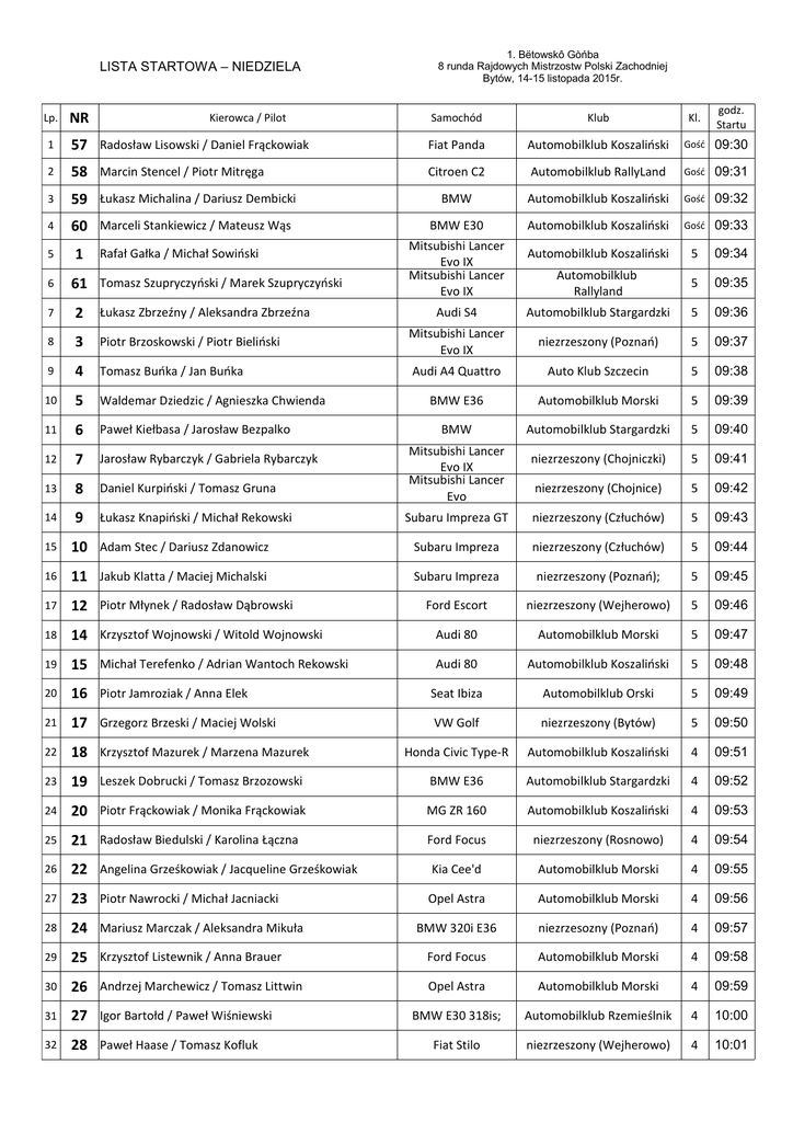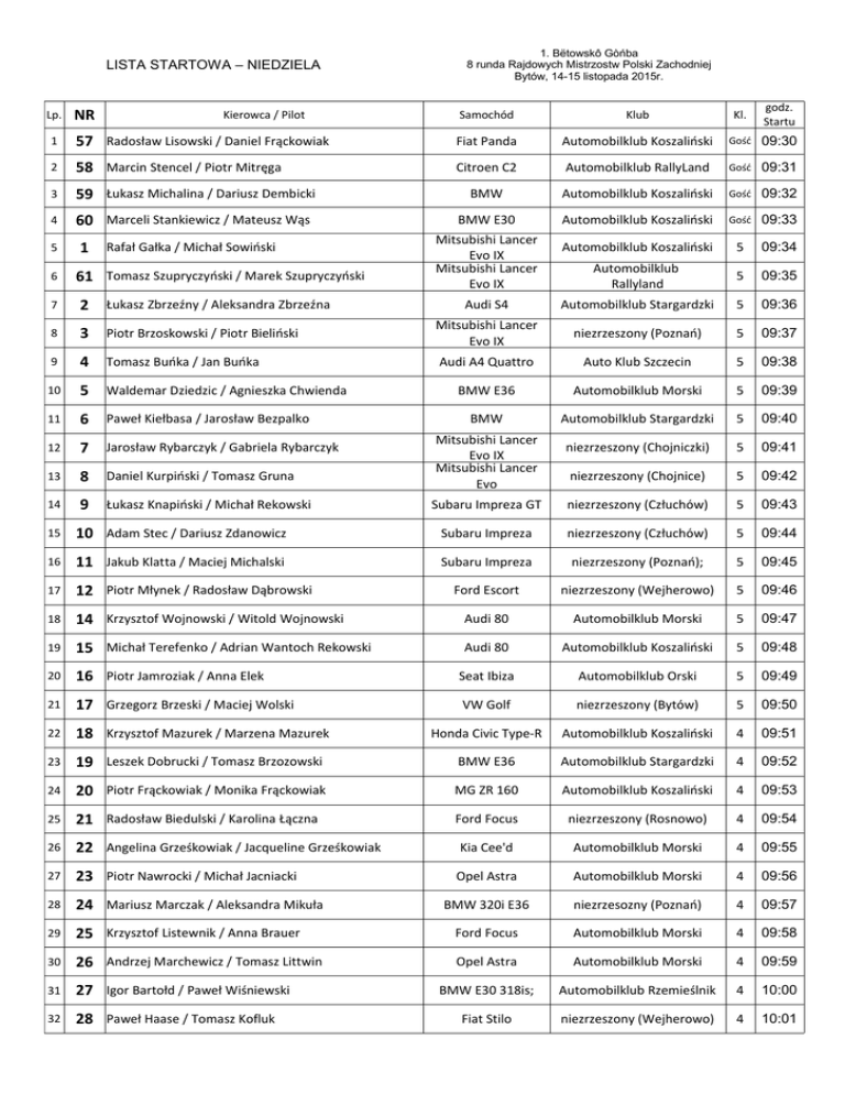 LISTA STARTOWA – NIEDZIELA Lp. NR Kierowca / Pilot 1. Bëtowskô Gòńba 8 runda Rajdowych Mistrzostw Polski Zachodniej Bytów, 14-15 listopada 2015r. Samochód Klub Kl. godz. Startu 1 57 Radosław Lisowski / Daniel Frąckowiak Fiat Panda Automobilklub Koszaliński Gość 09:30 2 58 Marcin Stencel / Piotr Mitręga Citroen C2 Automobilklub RallyLand Gość 09:31 3 59 Łukasz Michalina / Dariusz Dembicki BMW Automobilklub Koszaliński Gość 09:32 4 60 Marceli Stankiewicz / Mateusz Wąs BMW E30 Automobilklub Koszaliński Gość 09:33 Automobilklub Koszaliński 5 09:34 Automobilklub Rallyland 5 09:35 Audi S4 Automobilklub Stargardzki 5 09:36 5 6 1 Rafał Gałka / Michał Sowiński 61 Tomasz Szupryczyński / Marek Szupryczyński Mitsubishi Lancer Evo IX Mitsubishi Lancer Evo IX 7 2 Łukasz Zbrzeźny / Aleksandra Zbrzeźna 8 3 Piotr Brzoskowski / Piotr Bieliński Mitsubishi Lancer Evo IX niezrzeszony (Poznań) 5 09:37 9 4 Tomasz Buńka / Jan Buńka Audi A4 Quattro Auto Klub Szczecin 5 09:38 10 5 Waldemar Dziedzic / Agnieszka Chwienda BMW E36 Automobilklub Morski 5 09:39 11 6 Paweł Kiełbasa / Jarosław Bezpalko BMW Automobilklub Stargardzki 5 09:40 12 7 Jarosław Rybarczyk / Gabriela Rybarczyk niezrzeszony (Chojniczki) 5 09:41 13 8 Daniel Kurpiński / Tomasz Gruna niezrzeszony (Chojnice) 5 09:42 14 9 Łukasz Knapiński / Michał Rekowski Subaru Impreza GT niezrzeszony (Człuchów) 5 09:43 Mitsubishi Lancer Evo IX Mitsubishi Lancer Evo 15 10 Adam Stec / Dariusz Zdanowicz Subaru Impreza niezrzeszony (Człuchów) 5 09:44 16 11 Jakub Klatta / Maciej Michalski Subaru Impreza niezrzeszony (Poznań); 5 09:45 17 12 Piotr Młynek / Radosław Dąbrowski Ford Escort niezrzeszony (Wejherowo) 5 09:46 18 14 Krzysztof Wojnowski / Witold Wojnowski Audi 80 Automobilklub Morski 5 09:47 19 15 Michał Terefenko / Adrian Wantoch Rekowski Audi 80 Automobilklub Koszaliński 5 09:48 20 16 Piotr Jamroziak / Anna Elek Seat Ibiza Automobilklub Orski 5 09:49 21 17 Grzegorz Brzeski / Maciej Wolski VW Golf niezrzeszony (Bytów) 5 09:50 22 18 Krzysztof Mazurek / Marzena Mazurek Honda Civic Type-R Automobilklub Koszaliński 4 09:51 23 19 Leszek Dobrucki / Tomasz Brzozowski BMW E36 Automobilklub Stargardzki 4 09:52 24 20 Piotr Frąckowiak / Monika Frąckowiak MG ZR 160 Automobilklub Koszaliński 4 09:53 25 21 Radosław Biedulski / Karolina Łączna Ford Focus niezrzeszony (Rosnowo) 4 09:54 26 22 Angelina Grześkowiak / Jacqueline Grześkowiak Kia Cee'd Automobilklub Morski 4 09:55 27 23 Piotr Nawrocki / Michał Jacniacki Opel Astra Automobilklub Morski 4 09:56 28 24 Mariusz Marczak / Aleksandra Mikuła BMW 320i E36 niezrzesozny (Poznań) 4 09:57 29 25 Krzysztof Listewnik / Anna Brauer Ford Focus Automobilklub Morski 4 09:58 30 26 Andrzej Marchewicz / Tomasz Littwin Opel Astra Automobilklub Morski 4 09:59 31 27 Igor Bartołd / Paweł Wiśniewski BMW E30 318is; Automobilklub Rzemieślnik 4 10:00 32 28 Paweł Haase / Tomasz Kofluk Fiat Stilo niezrzeszony (Wejherowo) 4 10:01 33 29 Marcin Sysak / Filip Kurek 34 30 Bartosz Burski / Piotr Wójcicki 35 31 Marcin Strocen / Michał Walkusz 36 Honda Civic Type-R Automobilklub Koszaliński 4 10:02 Seat Ibiza GTI niezrzeszony (Gdańsk) 4 10:03 VW Golf niezrzeszony (Gdynia) 4 10:04 32 Przemysław Sawicki / Jarosław Raepka Ford Fiesta Automobilklub Morski 4 10:05 37 33 Barbara Albin-Czerwińska / Sławomir Albin Seat Ibiza niezrzeszony (Gdańsk) 4 10:06 38 36 Michał Iwańcio / Krzysztof Brodziński Honda Civic Automobilklub Koszaliński 3 10:07 39 37 Tomasz Bilski / Tomasz Kozicki Honda Civic KM Winogrady 3 10:08 40 38 Karol Lemański / Dariusz Chałupnik Honda CRX Auto Klub Szczecin 3 10:09 41 39 Damian Czekan / Karol Turkiewicz Citroen C2 Auto Klub Szczecin 3 10:10 42 40 Robert Wielochowski / Malwina Górgurewicz Honda Civic Automobilklub Morski 3 10:11 41* Bartłomiej Adamczak / Maciej Klonowski Peugeot 106 Automobilklub Morski 3 10:12 Citroen C2 Automobilklub Rallyland 3 10:13 Citroen Saxo Automobilklub Toruński 3 10:14 Citroen C2 Automobilklub Morski 3 10:15 Toyota Corolla Automobilklub Koszaliński 3 10:16 46* Krzysztof Ozorowski / Aleksander Kaliszkowski Opel Corsa Automobilklub Morski 3 10:17 49 47 Tomasz Piątkowski / Jarosław Wszelaki Honda Civic Automobilklub Stargardzki 2 10:18 50 48 Krzysztof Kłosowski / Anna Tarapata Suzuki Swift Automobilklub Zachodniopomorski 2 10:19 51 49 Jarosław Doliński / Grzegorz Doliński Citroen Saxo VTS Automobilklub Wielkopolski 2 10:20 52 50 Alexandre Barboukov / Maciej Kieremkampt Hyundai Accent Automobilklub Rallyland 2 10:21 53 51 Mikołaj Doliński / Dominika Dolińska Honda Civic niezrzeszony (Swarzędz) 2 10:22 54 52 Paweł Horanin / Łukasz Horanin Suzuki Swift Automobilklub Koszaliński 1 10:23 55 53 Tomasz Plata / Michał Świątkowiak Fiat CC Sporting Automobilklub Koszaliński 1 10:24 Fiat 126p Automobilklub Morski 1 10:25 43 44 42 Piotr Szupryczyński / Kamil Krażewski 45 43 Jakub Baran / Marcin Starszak 46 44 Robert Cirocki / Marek Kamzelski 47 45 Dawid Chamier-Gliszczyński / Krzysztof Kaczmarek 48 56 54* Mariusz Marksz / Joanna Zalewska-Marksz 57 55 Jarosław Budziński / Rafał Chyliński Fiat Seicento Automobilklub Morski 1 10:26 58 56 Paweł Żywicki / Adrian Ryś Fiat Seicento niezrzeszony (Studzienice) 1 10:27