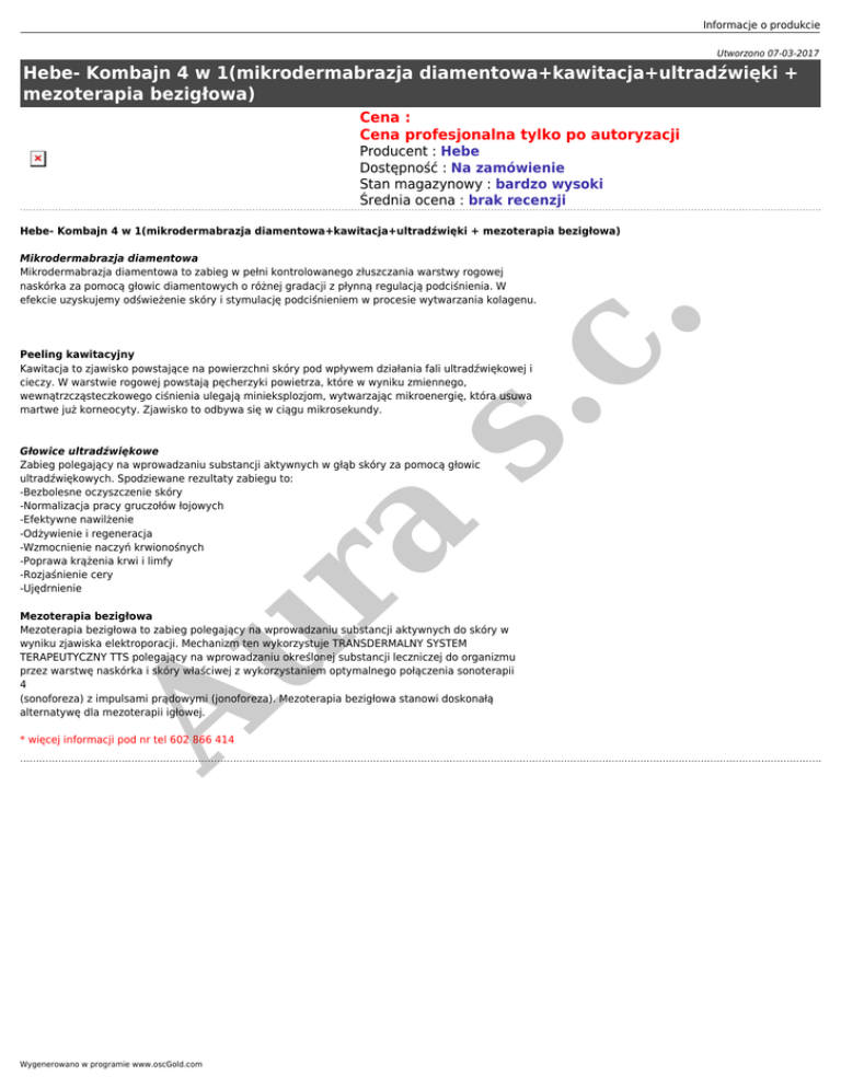 Informacje o produkcie Utworzono 07-03-2017 Hebe- Kombajn 4 w 1(mikrodermabrazja diamentowa+kawitacja+ultradźwięki + mezoterapia bezigłowa) Cena : Cena profesjonalna tylko po autoryzacji Producent : Hebe Dostępność : Na zamówienie Stan magazynowy : bardzo wysoki Średnia ocena : brak recenzji Hebe- Kombajn 4 w 1(mikrodermabrazja diamentowa+kawitacja+ultradźwięki + mezoterapia bezigłowa) s. c. Mikrodermabrazja diamentowa Mikrodermabrazja diamentowa to zabieg w pełni kontrolowanego złuszczania warstwy rogowej naskórka za pomocą głowic diamentowych o różnej gradacji z płynną regulacją podciśnienia. W efekcie uzyskujemy odświeżenie skóry i stymulację podciśnieniem w procesie wytwarzania kolagenu. Peeling kawitacyjny Kawitacja to zjawisko powstające na powierzchni skóry pod wpływem działania fali ultradźwiękowej i cieczy. W warstwie rogowej powstają pęcherzyki powietrza, które w wyniku zmiennego, wewnątrzcząsteczkowego ciśnienia ulegają minieksplozjom, wytwarzając mikroenergię, która usuwa martwe już korneocyty. Zjawisko to odbywa się w ciągu mikrosekundy. Au r a Głowice ultradźwiękowe Zabieg polegający na wprowadzaniu substancji aktywnych w głąb skóry za pomocą głowic ultradźwiękowych. Spodziewane rezultaty zabiegu to: -Bezbolesne oczyszczenie skóry -Normalizacja pracy gruczołów łojowych -Efektywne nawilżenie -Odżywienie i regeneracja -Wzmocnienie naczyń krwionośnych -Poprawa krążenia krwi i limfy -Rozjaśnienie cery -Ujędrnienie Mezoterapia bezigłowa Mezoterapia bezigłowa to zabieg polegający na wprowadzaniu substancji aktywnych do skóry w wyniku zjawiska elektroporacji. Mechanizm ten wykorzystuje TRANSDERMALNY SYSTEM TERAPEUTYCZNY TTS polegający na wprowadzaniu określonej substancji leczniczej do organizmu przez warstwę naskórka i skóry właściwej z wykorzystaniem optymalnego połączenia sonoterapii 4 (sonoforeza) z impulsami prądowymi (jonoforeza). Mezoterapia bezigłowa stanowi doskonałą alternatywę dla mezoterapii igłowej. * więcej informacji pod nr tel 602 866 414 Wygenerowano w programie www.oscGold.com