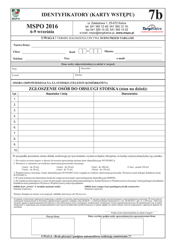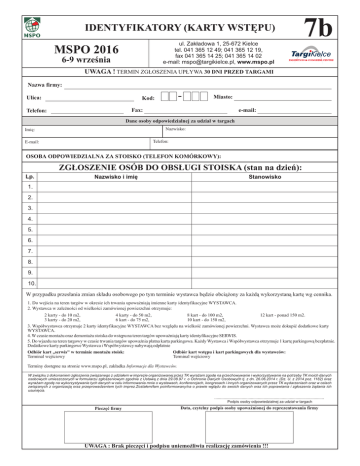 IDENTYFIKATORY (KARTY WSTÊPU) ul. Zak³adowa 1, 25-672 Kielce tel. 041 365 12 49; 041 365 12 19, fax 041 365 14 25; 041 365 14 02 e-mail: [email protected], www.mspo.pl MSPO 2016 6-9 wrzeœnia 7b UWAGA ! TERMIN ZG£OSZENIA UP£YWA 30 DNI PRZED TARGAMI Nazwa firmy: Ulica: Miasto: Kod: Fax: Telefon: e-mail: Dane osoby odpowiedzialnej za udzia³ w targach Nazwisko: Imiê: Telefon: E-mail: OSOBA ODPOWIEDZIALNA ZA STOISKO (TELEFON KOMÓRKOWY): ZG£OSZENIE OSÓB DO OBS£UGI STOISKA (stan na dzieñ): Lp. Stanowisko Nazwisko i imiê 1. 2. 3. 4. 5. 6. 7. 8. 9. 10. W przypadku przes³ania zmian sk³adu osobowego po tym terminie wystawca bêdzie obci¹¿ony za ka¿d¹ wykorzystan¹ kartê wg cennika. 1. Do wejœcia na teren targów w okresie ich trwania upowa¿niaj¹ imienne karty identyfikacyjne WYSTAWCA. 2. Wystawca w zale¿noœci od wielkoœci zamówionej powierzchni otrzymuje: 12 kart - ponad 150 m2. 2 karty - do 10 m2, 8 kart - do 100 m2, 4 karty - do 50 m2, 3 karty - do 20 m2, 10 kart - do 150 m2, 6 kart - do 75 m2, 3. Wspó³wystawca otrzymuje 2 karty identyfikacyjne WYSTAWCA bez wzglêdu na wielkoœæ zamówionej powierzchni. Wystawca mo¿e dokupiæ dodatkowe karty WYSTAWCA. 4. W czasie monta¿u oraz demonta¿u stoiska do wstêpu na teren targów upowa¿niaj¹ karty identyfikacyjne SERWIS. 5. Do wjazdu na teren targowy w czasie trwania targów upowa¿nia p³atna karta parkingowa. Ka¿dy Wystawca i Wspó³wystawca otrzymuje 1 kartê parkingow¹ bezp³atnie. Dodatkowe karty parkingowe Wystawca i Wspó³wystawcy nabywaj¹ odp³atnie Odbiór kart „serwis" w terminie monta¿u stoisk: Terminal wejœciowy Odbiór kart wstêpu i kart parkingowych dla wystawców: Terminal wejœciowy Terminy dostêpne na stronie www.mspo.pl, zak³adka Informacje dla Wystawców. W zwi¹zku z dokonaniem zg³oszenia zwi¹zanego z udzia³em w imprezie organizowanej przez TK wyra¿am zgodê na przechowywanie i wykorzystywanie na potrzeby TK moich danych osobowych umieszczonych w formularzu zg³oszeniowym zgodnie z Ustaw¹ z dnia 29.08.97 r. o Ochronie Danych Osobowych tj. z dn. 26.06.2014 r. (Dz. U. z 2014 poz. 1182) oraz wyra¿am zgodê na wykorzystywanie tych danych w celu informowania mnie o wystawach, konferencjach, kongresach i innych organizowanych przez TK wydarzeniach oraz w celach zwi¹zanych z organizacj¹ oraz przeprowadzeniem tych imprez.Zosta³em/³am poinformowany/na o prawie wgl¹du do swoich danych oraz ich poprawiania i zg³oszenia ¿¹dania ich usuniêcia. ................................................................................................ Podpis osoby odpowiedzialnej za udzia³ w targach Pieczêæ firmy Data, czytelny podpis osoby upowa¿nionej do reprezentowania firmy UWAGA : Brak pieczêci i podpisu uniemo¿liwia realizacjê zamówienia !!!