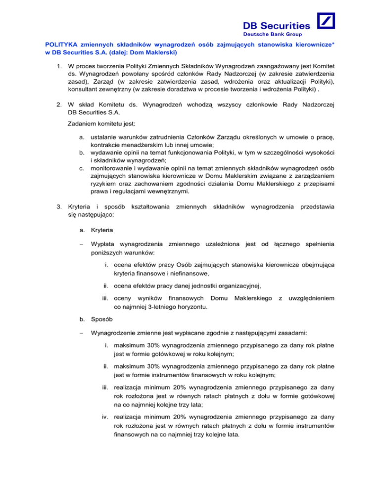 POLITYKA zmiennych składników wynagrodzeń osób zajmujących stanowiska kierownicze* w DB Securities S.A. (dalej: Dom Maklerski) 1. W proces tworzenia Polityki Zmiennych Składników Wynagrodzeń zaangażowany jest Komitet ds. Wynagrodzeń powołany spośród członków Rady Nadzorczej (w zakresie zatwierdzenia zasad), Zarząd (w zakresie zatwierdzenia zasad, wdrożenia oraz aktualizacji Polityki), konsultant zewnętrzny (w zakresie doradztwa w procesie tworzenia i wdrożenia Polityki) . 2. W skład Komitetu ds. Wynagrodzeń wchodzą wszyscy członkowie Rady Nadzorczej DB Securities S.A. Zadaniem komitetu jest: a. ustalanie warunków zatrudnienia Członków Zarządu określonych w umowie o pracę, kontrakcie menadżerskim lub innej umowie; b. wydawanie opinii na temat funkcjonowania Polityki, w tym w szczególności wysokości i składników wynagrodzeń; c. monitorowanie i wydawanie opinii na temat zmiennych składników wynagrodzeń osób zajmujących stanowiska kierownicze w Domu Maklerskim związane z zarządzaniem ryzykiem oraz zachowaniem zgodności działania Domu Maklerskiego z przepisami prawa i regulacjami wewnętrznymi. 3. Kryteria i sposób się następująco: kształtowania zmiennych składników wynagrodzenia przedstawia a. Kryteria Wypłata wynagrodzenia zmiennego uzależniona jest od łącznego spełnienia poniższych warunków: i. ocena efektów pracy Osób zajmujących stanowiska kierownicze obejmująca kryteria finansowe i niefinansowe, ii. ocena efektów pracy danej jednostki organizacyjnej, iii. oceny wyników finansowych Domu Maklerskiego z uwzględnieniem co najmniej 3-letniego horyzontu. b. Sposób Wynagrodzenie zmienne jest wypłacane zgodnie z następującymi zasadami: i. maksimum 30% wynagrodzenia zmiennego przypisanego za dany rok płatne jest w formie gotówkowej w roku kolejnym; ii. maksimum 30% wynagrodzenia zmiennego przypisanego za dany rok płatne jest w formie instrumentów finansowych w roku kolejnym; iii. realizacja minimum 20% wynagrodzenia zmiennego przypisanego za dany rok rozłożona jest w równych ratach płatnych z dołu w formie gotówkowej na co najmniej kolejne trzy lata; iv. realizacja minimum 20% wynagrodzenia zmiennego przypisanego za dany rok rozłożona jest w równych ratach płatnych z dołu w formie instrumentów finansowych na co najmniej trzy kolejne lata. 4. Wyniki stanowiące podstawę do otrzymania zmiennych składników wynagrodzeń w postaci instrumentów finansowych kształtowały się następująco: i. ocena efektów pracy Osób zajmujących stanowiska kierownicze obejmująca kryteria finansowe i niefinansowe, ii. ocena efektów pracy danej jednostki organizacyjnej, iii. oceny wyników finansowych Domu co najmniej 3-letniego horyzontu. Maklerskiego z uwzględnieniem 5. Zbiorcze informacje ilościowe dotyczące wysokości wynagrodzenia z podziałem na linie biznesowe stosowane w zarządzaniu Domem Maklerskim przedstawia Załącznik nr 1. 6. Zbiorcze informacje ilościowe na temat wynagrodzeń osób zajmujących stanowiska kierownicze objętych Polityką Zmiennych Składników Wynagrodzeń w podziale na grupę obejmującą osoby wchodzące w skład zarządu Domu Maklerskiego, osoby pełniące funkcje kierownicze związane z zarządzaniem ryzykiem oraz grupę obejmującą pozostałe osoby przedstawia Załącznik nr 2. *** * w rozumieniu § 1 pkt. 3 Rozporządzenia Ministra Finansów z dnia 2 grudnia 2011 r. w sprawie ustalania przez dom maklerski polityki zmiennych składników wynagrodzeń osób zajmujących stanowiska kierownicze (Dz. U. 2011 nr 263 poz. 1569) Za osoby zajmujące stanowisk kierownicze w rozumieniu Rozporządzenia Ministra Finansów z dnia 2 grudnia 2011 r. uznaje się: I. Osoby wchodzące w skład zarządu Domu Maklerskiego: 1. Prezes Zarządu 2. Pozostali Członkowie Zarządu II. Osoby pełniące funkcje kierownicze związane z zarządzaniem ryzykiem w Domu Maklerskim: 3. Dyrektor Finansowy / Główny Księgowy III. Osoby podejmujące istotne decyzje związane z operacjami powodującymi powstanie pozycji zaliczanych do portfela handlowego lub dotyczące zarządzania aktywami klientów w Domu Maklerskim: 4. Kierownik Działu Inwestycji Własnych 5. Kierownik Działu Rynków Kapitałowych 6. Kierownik Działu Operacji IV. Osoby pełniące funkcje kierownicze związane z kontrolą wewnętrzną i badaniem zgodności działania Domu Maklerskiego z przepisami prawa: 7. Inspektor Nadzoru