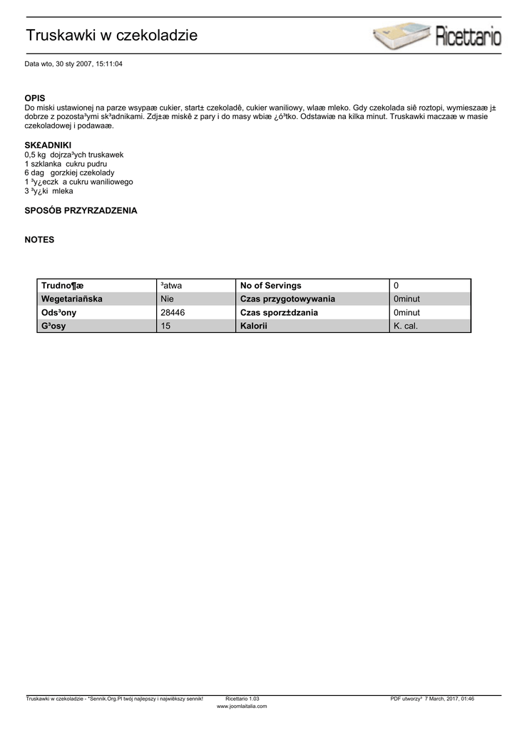 Truskawki w czekoladzie Data wto, 30 sty 2007, 15:11:04 OPIS Do miski ustawionej na parze wsypaæ cukier, start± czekoladê, cukier waniliowy, wlaæ mleko. Gdy czekolada siê roztopi, wymieszaæ j± dobrze z pozosta³ymi sk³adnikami. Zdj±æ miskê z pary i do masy wbiæ ¿ó³tko. Odstawiæ na kilka minut. Truskawki maczaæ w masie czekoladowej i podawaæ. SK£ADNIKI 0,5 kg dojrza³ych truskawek 1 szklanka cukru pudru 6 dag gorzkiej czekolady 1 ³y¿eczk a cukru waniliowego 3 ³y¿ki mleka SPOSÓB PRZYRZADZENIA NOTES Trudno¶æ ³atwa No of Servings 0 Wegetariañska Nie Czas przygotowywania 0minut Ods³ony 28446 Czas sporz±dzania 0minut G³osy 15 Kalorii K. cal. Truskawki w czekoladzie - *Sennik.Org.Pl twój najlepszy i najwiêkszy sennik! Ricettario 1.03 www.joomlaitalia.com PDF utworzy³ 7 March, 2017, 01:46