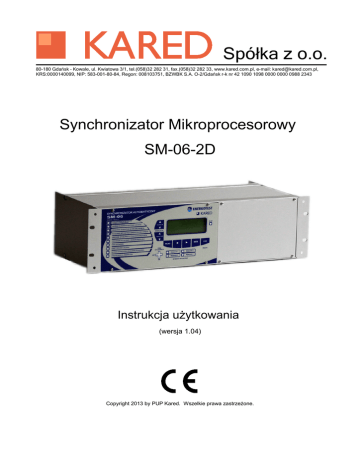 Spółka z o.o. 80-180 Gdańsk – Kowale, ul. Kwiatowa 3/1, tel.(058)32 282 31, fax.(058)32 282 33, www.kared.com.pl, e-mail: [email protected], KRS:0000140099, NIP: 583-001-80-84, Regon: 008103751, BZWBK S.A. O-2/Gdańsk r-k nr 42 1090 1098 0000 0000 0988 2343 Synchronizator Mikroprocesorowy SM-06-2D Instrukcja użytkowania (wersja 1.04) Copyright 2013 by PUP Kared. Wszelkie prawa zastrzeżone. SM-06-2D - Instrukcja użytkowania PUP KARED Sp. z o.o. zastrzega sobie prawo wprowadzania zmian w swoich produktach polegających na doskonaleniu ich cech technicznych. Zmiany te nie zawsze mogą być na bieżąco uwzględniane w dokumentacji. Marki i nazwy produktów wymienione w niniejszej instrukcji stanowią znaki towarowe lub zarejestrowane znaki towarowe, należące odpowiednio do ich właścicieli. Tak można się z nami skontaktować: PUP KARED Sp. z o.o Phone +48 58 32 282 31 ul. Kwiatowa 3/1 Mobile phone +48 602 152 740 80-180 Gdańsk – Kowale, Fax +48 58 32 282 33 Poland E-mail [email protected] Internet http://www.kared.com.pl/ Energotest Sp. z o.o. Phone +48 32 270 45 18 ul. Chorzowska 44B Fax +48 32 270 45 17 44-100 Gliwice, Poland E-mail [email protected] Internet http://www.energotest.com.pl/ lub naszym dystrybutorem: ZNACZENIE INSTRUKCJI UŻYTKOWANIA W razie wątpliwości co do właściwej interpretacji treści instrukcji prosimy koniecznie zwracać się o wyjaśnienie do producenta. Będziemy wdzięczni za wszelkiego rodzaju sugestie, opinie i krytyczne uwagi użytkowników i prosimy o ich ustne lub pisemne przekazywanie. Pomoże nam to uczynić instrukcję jeszcze łatwiejszą w użyciu oraz uwzględnić życzenia i wymagania użytkowników. Urządzenie, do którego została dołączona niniejsza instrukcja, zawiera niemożliwe do wyeliminowania, potencjalne zagrożenie dla osób i wartości materialnych. Dlatego każda osoba, pracująca przy urządzeniu lub wykonująca jakiekolwiek czynności związane z obsługiwaniem i konserwowaniem urządzenia, musi zostać uprzednio przeszkolona i znać potencjalne zagrożenie. Wymaga to starannego przeczytania, zrozumienia i przestrzegania instrukcji użytkowania, w szczególności wskazówek dotyczących bezpieczeństwa. Copyright 2013 by PUP Kared. Wszelkie prawa zastrzeżone. Niniejsza instrukcja użytkowania może być powielana i rozpowszechniana wyłącznie w całości PUP KARED Sp. z o.o. IU_SM-06-2D-v1.04 Strona 2/45 SM-06-2D - Instrukcja użytkowania Spis treści ZNACZENIE INSTRUKCJI UŻYTKOWANIA...........................................................................................2 INFORMACJA O ZGODNOŚCI.............................................................................................................. 5 1. Zastosowanie urządzenia................................................................................................................... 6 1.1. Łączenie w trybach napięciowych...............................................................................................6 1.1.1. Synchronizacja automatyczna ze stałym czasem wyprzedzenia (SYN)...............................6 1.1.2. Załączanie w zadanym sektorze kątowym (ZSK).................................................................6 1.2. Łączenie w trybach beznapięciowych..........................................................................................6 1.2.1. Łączenie SBN...................................................................................................................... 6 1.2.2. Łączenie GBN...................................................................................................................... 6 1.2.3. Łączenie SGBN................................................................................................................... 6 2. Zasady bezpieczeństwa...................................................................................................................... 7 3. Opis techniczny i działanie urządzenia...............................................................................................9 3.1. Opis ogólny................................................................................................................................. 9 3.2. Obudowa..................................................................................................................................... 9 3.3. Tablica Synoptyczna.................................................................................................................... 9 3.4. Sygnalizacja błędów.................................................................................................................. 10 3.4.1. Błędy zewnętrzne.............................................................................................................. 10 3.4.2. Błędy wewnętrzne..............................................................................................................10 3.5. Opis działania............................................................................................................................ 10 3.5.1. Wprowadzenie – definicje i oznaczenia.............................................................................10 3.5.2. Uruchamianie i wyłączanie ...............................................................................................12 3.5.3. Odstawienie awaryjne........................................................................................................12 3.5.4. Wybór wyłącznika.............................................................................................................. 13 3.5.5. Tryby pracy........................................................................................................................ 13 3.5.5.1. Synchronizacja automatyczna ze stałym czasem wyprzedzenia – tryb SYN..............13 3.5.5.1.1. Start procesu łączenia w trybie SYN...................................................................13 3.5.5.1.2. Regula