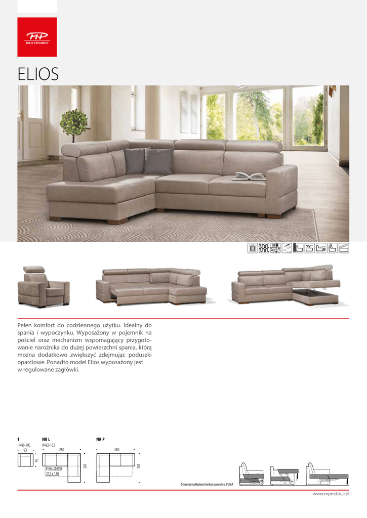 ELIOS Pełen komfort do codziennego użytku. Idealny do spania i wypoczynku. Wyposażony w pojemnik na pościel oraz mechanizm wspomagający przygotowanie narożnika do dużej powierzchni spania, którą można dodatkowo zwiększyć zdejmując poduszki oparciowe. Ponadto model Elios wyposażony jest w regulowane zagłówki. Schemat rozkładania funkcji spania typ. PUMA www.mpnidzica.pl