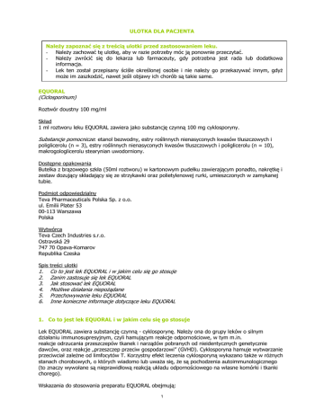 ULOTKA DLA PACJENTA NaleŜy zapoznać się z treścią ulotki przed zastosowaniem leku. - NaleŜy zachować tę ulotkę, aby w razie potrzeby móc ją ponownie przeczytać. - NaleŜy zwrócić się do lekarza lub farmaceuty, gdy potrzebna jest rada lub dodatkowa informacja. - Lek ten został przepisany ściśle określonej osobie i nie naleŜy go przekazywać innym, gdyŜ moŜe im zaszkodzić, nawet jeśli objawy ich chorób są takie same. EQUORAL (Ciclosporinum) Roztwór doustny 100 mg/ml Skład 1 ml roztworu leku EQUORAL zawiera jako substancję czynną 100 mg cyklosporyny. Substancje pomocnicze: etanol bezwodny, estry roślinnych nienasyconych kwasów tłuszczowych i poliglicerolu (n = 3), estry roślinnych nienasyconych kwasów tłuszczowych i poliglicerolu (n = 10), makrogologlicerolu stearynian uwodorniony. Dostępne opakowania Butelka z brązowego szkła (50ml roztworu) w kartonowym pudełku zawierającym ponadto, nakrętkę i zestaw dozujący składający się ze strzykawki oraz polietylenowej rurki, umieszczonych w zamykanej tubie. Podmiot odpowiedzialny Teva Pharmaceuticals Polska Sp. z o.o. ul. Emilii Plater 53 00-113 Warszawa Polska Wytwórca Teva Czech Industries s.r.o. Ostravská 29 747 70 Opava-Komarov Republika Czeska Spis treści ulotki 1. 2. 3. 4. 5. 6. Co to jest lek EQUORAL i w jakim celu się go stosuje Zanim zastosuje się lek EQUORAL Jak stosować lek EQUORAL MoŜliwe działania niepoŜądane Przechowywanie leku EQUORAL Inne konieczne informacje dotyczące leku EQUORAL 1. Co to jest lek EQUORAL i w jakim celu się go stosuje Lek EQUORAL zawiera substancję czynną - cyklosporynę. NaleŜy ona do grupy leków o silnym działaniu immunosupresyjnym, czyli hamującym reakcje odpornościowe, w tym m.in. reakcje odrzucania przeszczepów tkanek i narządów pobranych od nieidentycznych genetycznie dawców, oraz reakcje „przeszczep przeciw gospodarzowi” (GVHD). Cyklosporyna hamuje wytwarzanie przeciwciał zaleŜne od limfocytów T. Korzystny efekt leczenia cyklosporyną wykazano takŜe w róŜnych stanach chorobowych, o których wiadomo lub uwaŜa się, Ŝe są pochodzenia autoimmunologicznego (to znaczy wywołane są nieprawidłową reakcją układu odpornościowego na własne komórki i tkanki chorego). Wskazania do stosowania preparatu EQUORAL obejmują: 1 • Przeszczepianie Przeszczepianie narządów miąŜszowych Zapobieganie odrzuceniu przeszczepu po alogenicznej transplantacji nerek, wątroby, serca, serca i płuc, płuc lub trzustki. Leczenie odrzucania przeszczepu u pacjentów uprzednio otrzymujących inne leki immunosupresyjne. Przeszczepianie szpiku Zapobieganie odrzuceniu przeszczepu po alogenicznej transplantacji szpiku. Zapobieganie lub leczenie choroby „przeszczep przeciw gospodarzowi” (GVHD). • Wskazania pozatransplantacyjne Endogenne zapalenie błony naczyniowej oka Zespół nerczycowy Reumatoidalne zapalenie stawów Łuszczyca Atopowe zapalenie skóry 2. Zanim zastosuje się lek EQUORAL Nie naleŜy stosować leku EQUORAL, jeśli występuje nadwraŜliwość na cyklosporynę lub którykolwiek składnik preparatu. Zachować szczególną ostroŜność stosując lek EQUORAL, gdyŜ: EQUORAL moŜe być przepisywany tylko przez lekarzy mających doświadczenie w leczeniu immunosupresyjnym, którzy mogą zapewnić właściwą obserwację podczas leczenia, włącznie z regularnym pełnym badaniem lekarskim, pomiarem ciśnienia tętniczego krwi i kontrolą parametrów laboratoryjnych, na podstawie których określa się bezpieczeństwo stosowania leku. Tak jak inne leki immunosupresyjne, cyklosporyna zwiększa ryzyko rozwoju chłoniaków i innych nowotworów złośliwych, szczególnie nowotworów skóry. Tak jak inne leki immunosupresyjne, cyklosporyna zwiększa ryzyko rozwoju róŜnych zakaŜeń bakteryjnych, grzybiczych, pasoŜytniczych i wirusowych. Częstym i potencjalnie cięŜkim powikłaniem w pierwszych kilku tygodniach leczenia preparatem EQUORAL moŜe być podwyŜszenie stęŜenia mocznika i kreatyniny w surowicy krwi. Wymienione zmiany czynnościowe są zaleŜne od dawki i przemijające. Ustępują zwykle po zmniejszeniu dawki. W czasie długotrwałego leczenia, u niektórych pacjentów mogą wystąpić zmiany strukturalne w nerkach (np. zwłóknienie śródmiąŜszowe), które u biorców przeszczepów nerkowych naleŜy odróŜniać od zmian wywoływanych przez przewlekłą reakcję odrzucania. EQUORAL moŜe takŜe powodować zaleŜne od dawki i przemijające zwiększenie stęŜenia bilirubiny w surowicy, a niekiedy teŜ zwiększenie aktywności enzymów wątrobowych. NaleŜy dokładnie monitorować parametry określające czynność nerek i wątroby. Nieprawidłowe ich wartości mogą spowodować konieczność zmniejszenia dawki. U pacjentów po przeszczepieniu zostanie wdroŜone rutynowe monitorowanie stęŜenia cyklosporyny. W czasie leczenia preparatem EQUORAL naleŜy regularnie kontrolować ciśnienie tętnicze krwi. W przypadku rozwoju nadciśnienia tętniczego naleŜy zastosować odpowiednie leczenie obniŜające ciśnienie. Najlepiej stosować te produkty lecznicze, w przypadku których nie obserwowano interakcji z cyklosporyną. Przed leczeniem, oraz po zakończeniu pierwszego miesiąca leczenia wskazane jest oznaczenie stęŜenia lipidów, poniewaŜ donoszono, Ŝe cyklosporyna moŜe w rzadkich przypadkach powodować przemijające, nieznaczne zwiększenie ich stęŜenia we krwi. W razie stwierdzenia zwiększenia stęŜenia lipidów, naleŜy rozwaŜyć ograniczenie spoŜycia tłuszczów i, jeŜeli to wskazane, zmniejszenie dawki cyklosporyny. 2 Cyklosporyna zwiększa ryzyko wystąpienie hiperkaliemii (podwyŜszonego stęŜenia potasu we krwi), szczególnie u pacjentów z zaburzeniami czynności nerek. NaleŜy równieŜ zachować ostroŜność, przyjmując cyklosporynę z tzw. lekami oszczędzającymi potas (naleŜą tu niektóre leki przeciwko nadciśnieniu tętniczemu) i lekami zawierającymi potas, oraz u pacjentów stosujących diet