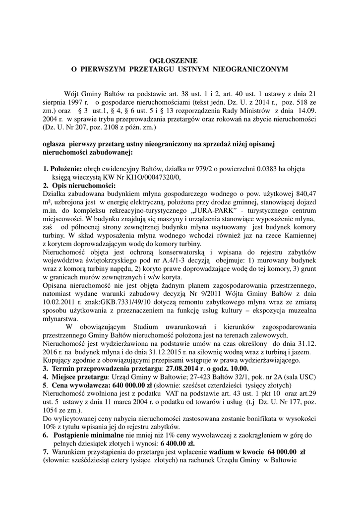 OGŁOSZENIE O PIERWSZYM PRZETARGU USTNYM NIEOGRANICZONYM Wójt Gminy Bałtów na podstawie art. 38 ust. 1 i 2, art. 40 ust. 1 ustawy z dnia 21 sierpnia 1997 r. o gospodarce nieruchomościami (tekst jedn. Dz. U. z 2014 r., poz. 518 ze zm.) oraz § 3 ust.1, § 4, § 6 ust. 5 i § 13 rozporządzenia Rady Ministrów z dnia 14.09. 2004 r. w sprawie trybu przeprowadzania przetargów oraz rokowań na zbycie nieruchomości (Dz. U. Nr 207, poz. 2108 z późn. zm.) ogłasza pierwszy przetarg ustny nieograniczony na sprzedaż niżej opisanej nieruchomości zabudowanej: 1. Położenie: obręb ewidencyjny Bałtów, działka nr 979/2 o powierzchni 0.0383 ha objęta księgą wieczystą KW Nr KI1O/00047320/0, 2. Opis nieruchomości: Działka zabudowana budynkiem młyna gospodarczego wodnego o pow. użytkowej 840,47 m², uzbrojona jest w energię elektryczną, położona przy drodze gminnej, stanowiącej dojazd m.in. do kompleksu rekreacyjno-turystycznego „JURA-PARK” - turystycznego centrum miejscowości. W budynku znajdują się maszyny i urządzenia stanowiące wyposażenie młyna, zaś od północnej strony zewnętrznej budynku młyna usytuowany jest budynek komory turbiny. W skład wyposażenia młyna wodnego wchodzi również jaz na rzece Kamiennej z korytem doprowadzającym wodę do komory turbiny. Nieruchomość objęta jest ochroną konserwatorską i wpisana do rejestru zabytków województwa świętokrzyskiego pod nr A.4/1-3 decyzją obejmuje: 1) murowany budynek wraz z komorą turbiny napędu, 2) koryto prawe doprowadzające wodę do tej komory, 3) grunt w granicach murów zewnętrznych i w/w koryta. Opisana nieruchomość nie jest objęta żadnym planem zagospodarowania przestrzennego, natomiast wydane warunki zabudowy decyzją Nr 9/2011 Wójta Gminy Bałtów z dnia 10.02.2011 r. znak:GKB.7331/49/10 dotyczą remontu zabytkowego młyna wraz ze zmianą sposobu użytkowania z przeznaczeniem na funkcję usług kultury – ekspozycja muzealna młynarstwa. W obowiązującym Studium uwarunkowań i kierunków zagospodarowania przestrzennego Gminy Bałtów nieruchomość położona jest na terenach zalewowych. Nieruchomość jest wydzierżawiona na podstawie umów na czas określony do dnia 31.12. 2016 r. na budynek młyna i do dnia 31.12.2015 r. na siłownię wodną wraz z turbiną i jazem. Kupujący zgodnie z obowiązującymi przepisami wstępuje w prawa wydzierżawiającego. 3. Termin przeprowadzenia przetargu: 27.08.2014 r. o godz. 10.00. 4. Miejsce przetargu: Urząd Gminy w Bałtowie; 27-423 Bałtów 32/1, pok. nr 2A (sala USC) 5. Cena wywoławcza: 640 000.00 zł (słownie: sześćset czterdzieści tysięcy złotych) Nieruchomość zwolniona jest z podatku VAT na podstawie art. 43 ust. 1 pkt 10 oraz art.29 ust. 5 ustawy z dnia 11 marca 2004 r. o podatku od towarów i usług (t.j Dz. U. Nr 177, poz. 1054 ze zm.). Do wylicytowanej ceny nabycia nieruchomości zastosowana zostanie bonifikata w wysokości 10% z tytułu wpisania jej do rejestru zabytków. 6. Postąpienie minimalne nie mniej niż 1% ceny wywoławczej z zaokrągleniem w górę do pełnych dziesiątek złotych i wynosi: 6 400.00 zł. 7. Warunkiem przystąpienia do przetargu jest wpłacenie wadium w kwocie 64 000.00 zł (słownie: sześćdziesiąt cztery tysiące złotych) na rachunek Urzędu Gminy w Bałtowie tj. BS Ostrowiec Św. 07 8507 0004 2001 0012 2890 0010 w terminie do dnia 21.08.2014 r., Wpłata lub przelew musi być dokonany w takim terminie, aby zostały zaksięgowane na koncie Urzędu Gminy w dniu 21.08.2014 r.. 8. Potencjalny nabywca nieruchomości zobowiązany jest do uzyskania i przedłożenia do umowy kupna sprzedaży pozytywnej opinii Wojewódzkiego Konserwatora Zabytków w Kielcach dotyczącej programu zagospodarowania nieruchomości wpisanej do rejestru zabytków pod nr A.4/1-3. 9. W przetargu mogą brać udział osoby fizyczne i prawne. Osoby prawne zobowiązane są przedłożyć wypis z właściwego rejestru sądowego oraz pełnomocnictwo do jej reprezentowania. W przypadku przystąpienia do przetargu jednego ze współmałżonków - wymagane jest przedłożenie pisemnego oświadczenia woli drugiego współmałżonka o wyrażeniu zgody na nabycie nieruchomości ze wspólnego majątku lub złożenie oświadczenia woli nabycia nieruchomości z majątku odrębnego - art. 37 § 1 pkt 1 ustawy z dnia 25 lutego 1964 r. Kodeks rodzinny i opiekuńczy. Uczestnicy przetargu zobowiązani są do zgłoszenia się z dowodami osobistymi oraz dowodem wpłaty wadium. 10. Przetarg jest ważny bez względu na liczbę uczestników, jeżeli przynajmniej jeden z uczestników zaoferuje co najmniej jedno postąpienie powyżej ceny wywoławczej. 11. Wadium zwraca się niezwłocznie po odwołaniu lub zamknięciu przetargu, jednak nie później niż przed upływem trzech dni od dnia rozstrzygnięcia przetargu. 12. Wadium wpłacone przez uczestnika, który wygrał przetarg zaliczone zostanie na poczet ceny nabycia nieruchomości. 13. Wójt Gminy Bałtów zawiadomi najpóźniej w ciągu 21dni od dnia rozstrzygnięcia przetargu nabywcę w/w nieruchomości o miejscu i terminie zawarcia aktu notarialnego wyznaczając termin nie krótszy niż 7 dni od dnia doręczenia zawiadomienia. 14. Jeżeli osoba ustalona jako nabywca nieruchomości nie stawi się bez usprawiedliwienia w miejscu i terminie podanym w zawiadomieniu, o którym mowa w punkcie 11, organizator przetargu może odstąpić od zawarcia umowy, a wpłacone wadium nie podlega zwrotowi. 15. Koszty notarialne związane ze sporządzeniem umowy sprzedaży oraz opłaty sądowej wynikającej z dokonania wpisów w księdze wieczystej ponosi nabywca. 16. Wójt Gminy Bałtów zastrzega sobie prawo odwołania przetargu z istotnych przyczyn. 17. Szczegółowych informacji o nieruchomości można uzyskać w siedzibie Urzędu Gminy w Bałtowie w godz. 8ºº - 14ºº w pok. nr 4 lub tel. (41) 26 41 008 wew. 16. Niniejsze ogłoszenie o przetargu opublikowane jest na stronie internetowej www.gminabaltow.p