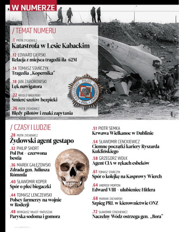 6 W NUMERZE . 8 PIPIOOTR ZYCH CHOOWIC CH IZ Katastrofa w Lesie Kabacckim .11 2 EDWAARD GIERSKI Rellacja z miejsca tragedii iła-62M .11 4 TOMASZ STTAŃCZYK Tragedia „Ko opernika” .18 JAN ZAABOROOWSSKI Lęk nawigattora . 2 2 WITO ITTOLD BA BAGI G EŃSKI GI SKKI Śmierć szefów bezpiieki . 2 6 PIOOTR T ZYCHOW WICZZ eprasa.pl Błędy pilotów i znaki zapytania / CZASY I LUDZIE .28 PIOTR ZYCHOWICZ Żydowski agent gestapo .32 PHILIP SHORT Pol Pot - czerwona bestia .36 MAREK GAŁĘZOWSKI Zdrada gen. Juliusza Rómmla .40 SŁAWOMIR KOPER Spór o płeć biegaczki .44 TOMASZ LENCZEWSKI Polscy farmerzy na wojnie w Rodezji .48 REMIGIUSZ WŁAST-MATUSZAK Paryska sodoma i gomora WWW.DORZECZY.PL .51 PIOTR SEMKA Krwawa Wielkanoc w Dublinie .54 SŁAWOMIR CENCKIEWICZ Ciemne początki kariery Ryszarda Kuklińskiego .58 GRZEGORZ WOŁK Agent CIA w rękach esbeków .61 TOMASZ STAŃCZYK Spór o kolejkę na Kasprowy Wierch .64 ANDREW MORTON Edward VIII - ulubieniec Hitlera .68 MARIAN ZACHARSKI Szpieg PRL w kierownictwie ONZ .72 SŁAWOMIR CENCKIEWICZ Naczelny Wódz ostrzega gen. „Bora” MIESIĘCZNIK LISICKIEGO DO RZECZY HISTORIA 7 REKLAMA / CO CZYTAĆ .74 KRZYSZTOF MASŁOŃ Klęski i bunty Andrzeja Bursy / FELIETONY .82 WIKTOR SUWOROW Od żulika do prezydenta .83 RAFAŁ A. ZIEMKIEWICZ My, Rosjanie i wódka .84 PIOTR SEMKA Buty Leopolda Tyrmanda / KRESY .88 JAKUB OSTROMĘCKI eprasa.pl Moskiewski potop 1654 r. .91 TOMASZ STAŃCZYK Wileńskie serca przed walentynkami / BATALIE I WODZOWIE .92 MACIEJ ROSALAK Klęska Wielkiej Armady / KOMIKS .98 KRZYSZTOF WYRZYKOWSKI, SŁAWOMIR ZAJĄCZKOWSKI Rekordowa budowla w szczerym polu KWIECIEŃ 2016 4(38)/2016